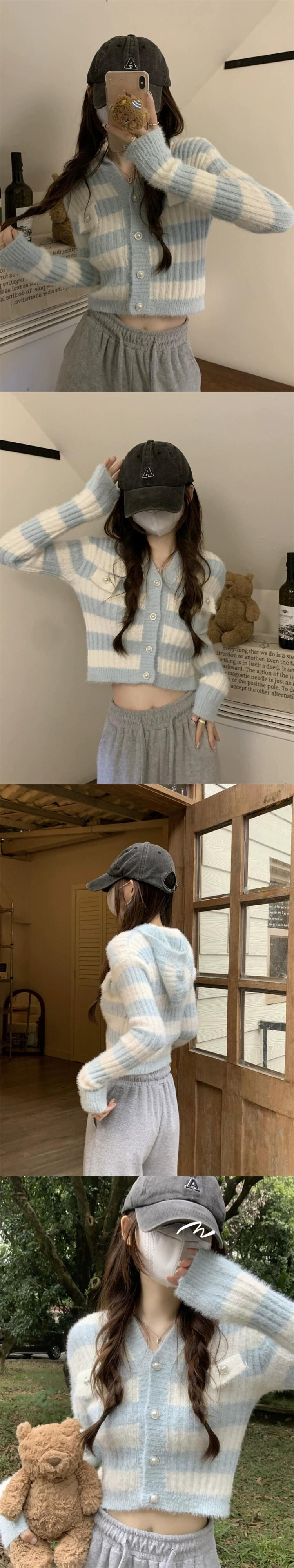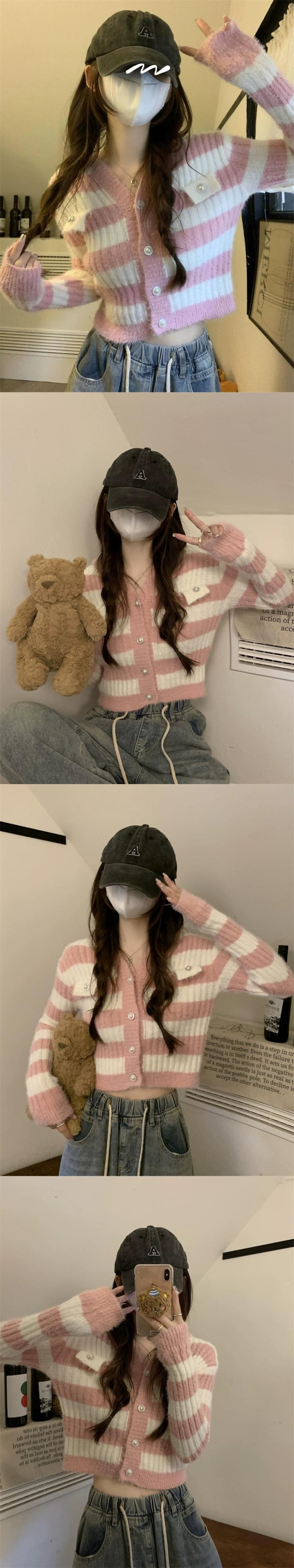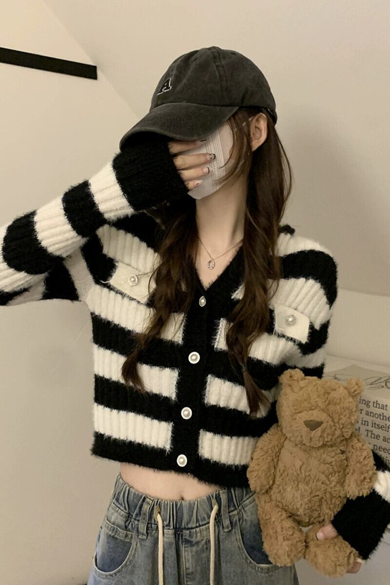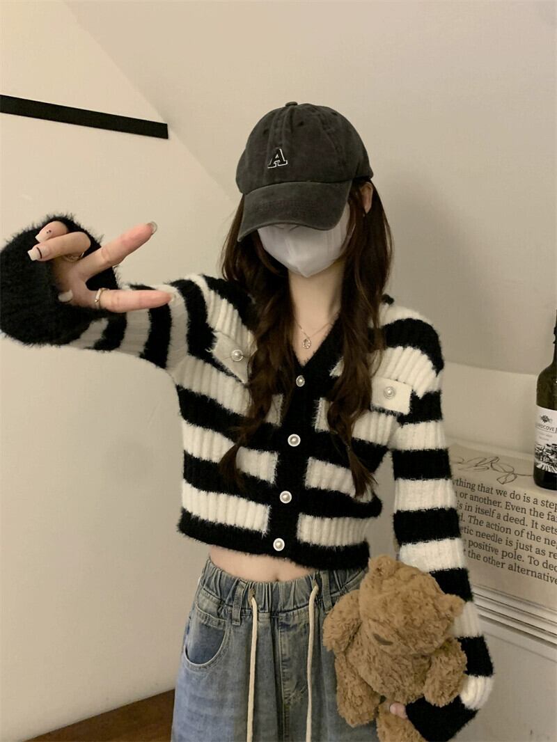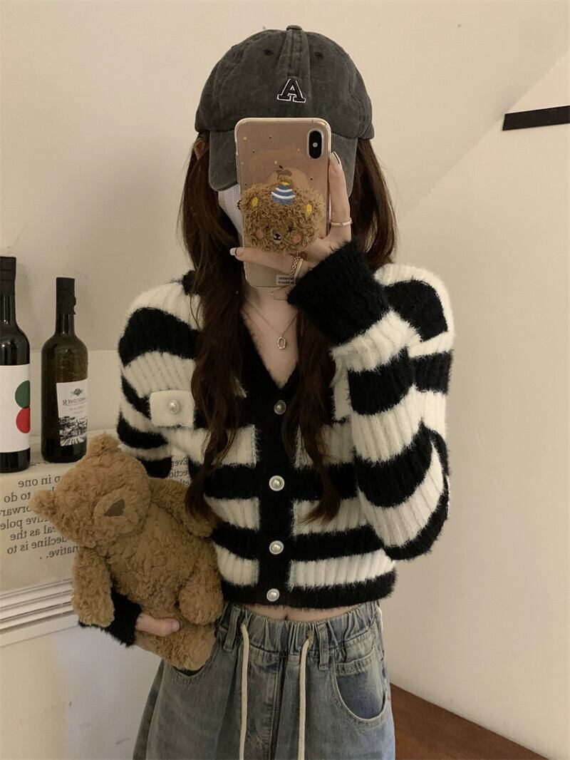 ストライプのフード付きショートカーディガンセータージャケット女性秋と冬の小人は厚く柔らかいワックス状のVネックセーターを着ます オータム 秋物 ウィンター 冬物 7460070328390522 | framboise21