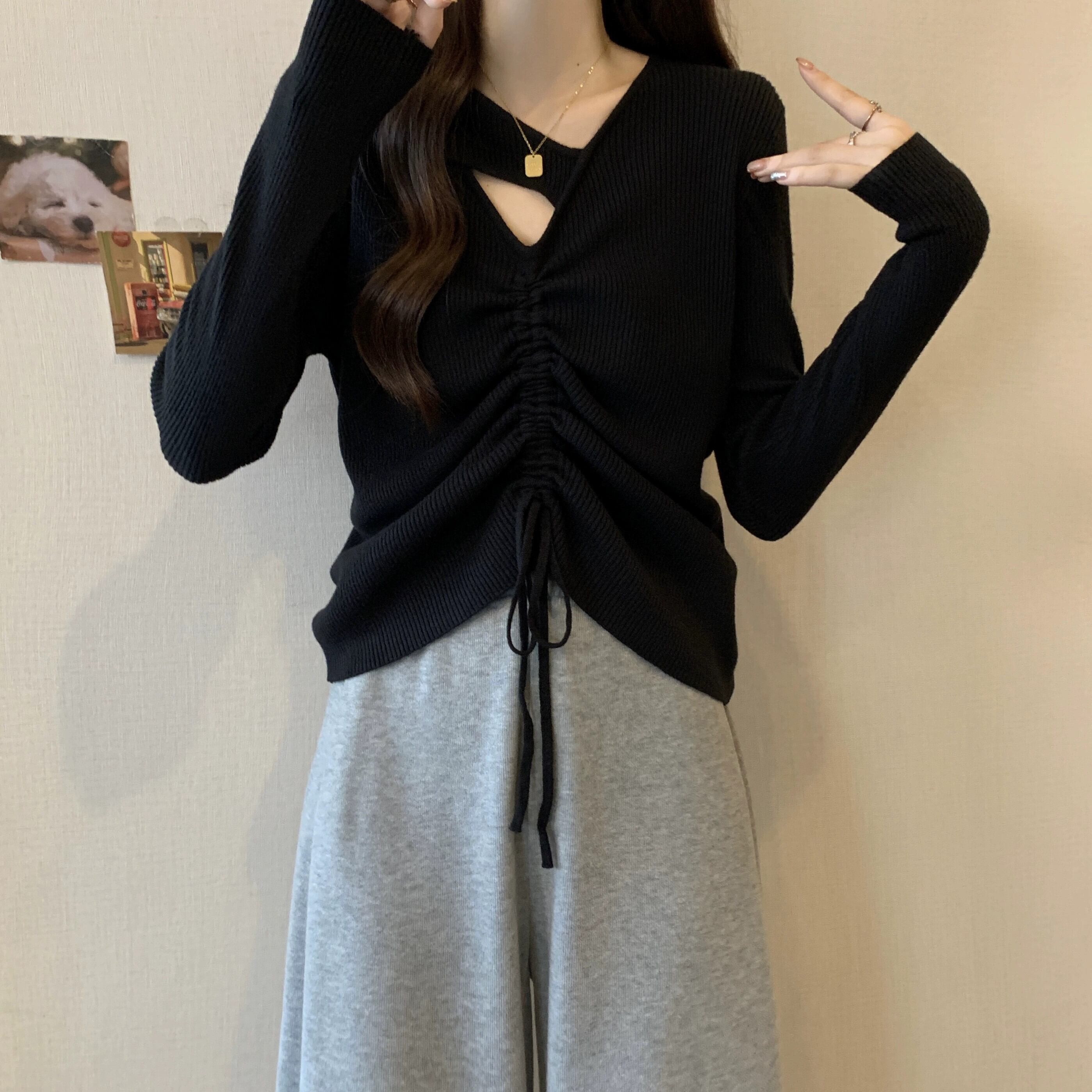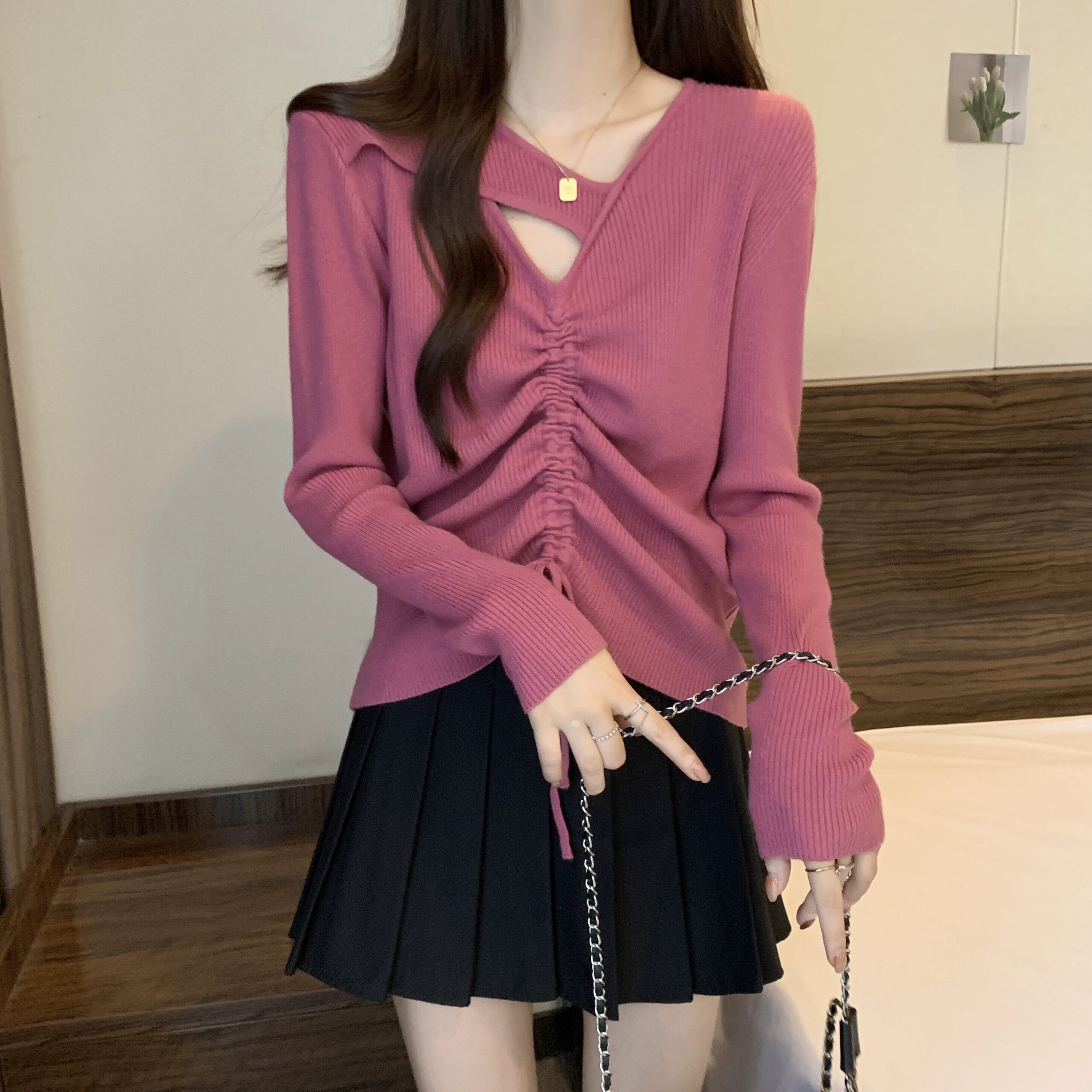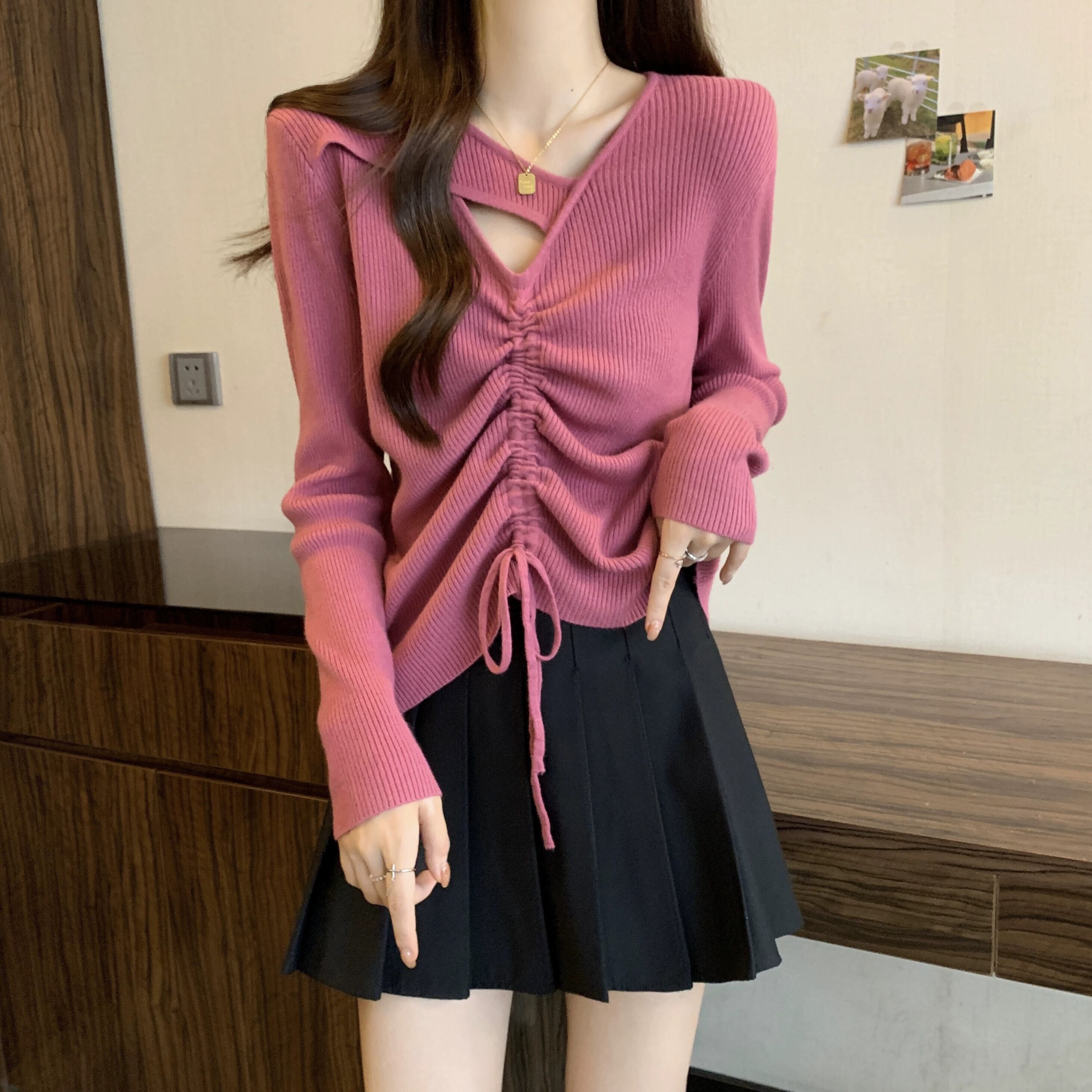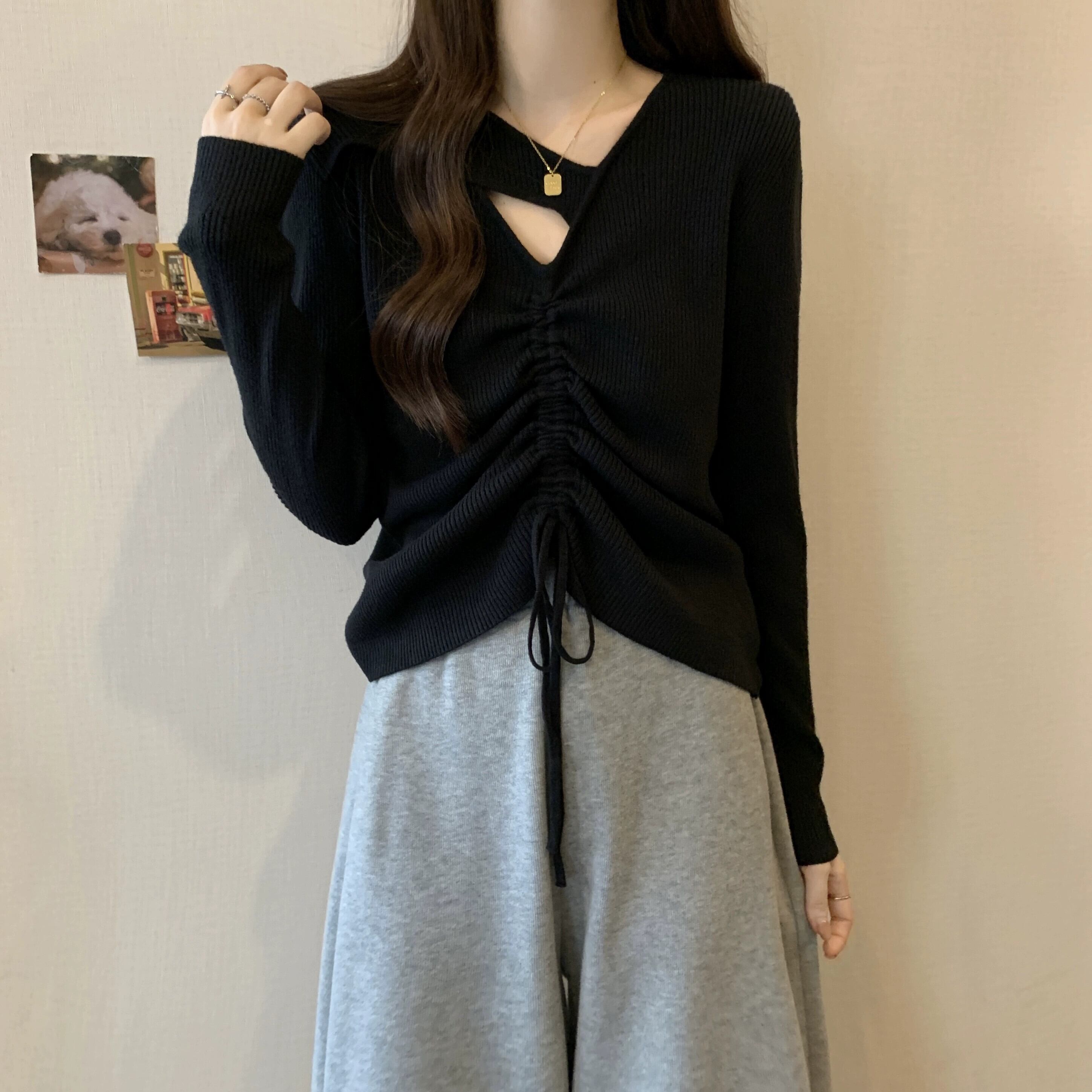 巾着プリーツ V ネックボトリングシャツ女性の秋と冬のファッショナブルでスリムな不規則な半袖ニットセーター ショート ロング オータム 秋物 ウィンター 冬物 Vネック 7460020750713777 | framboise21