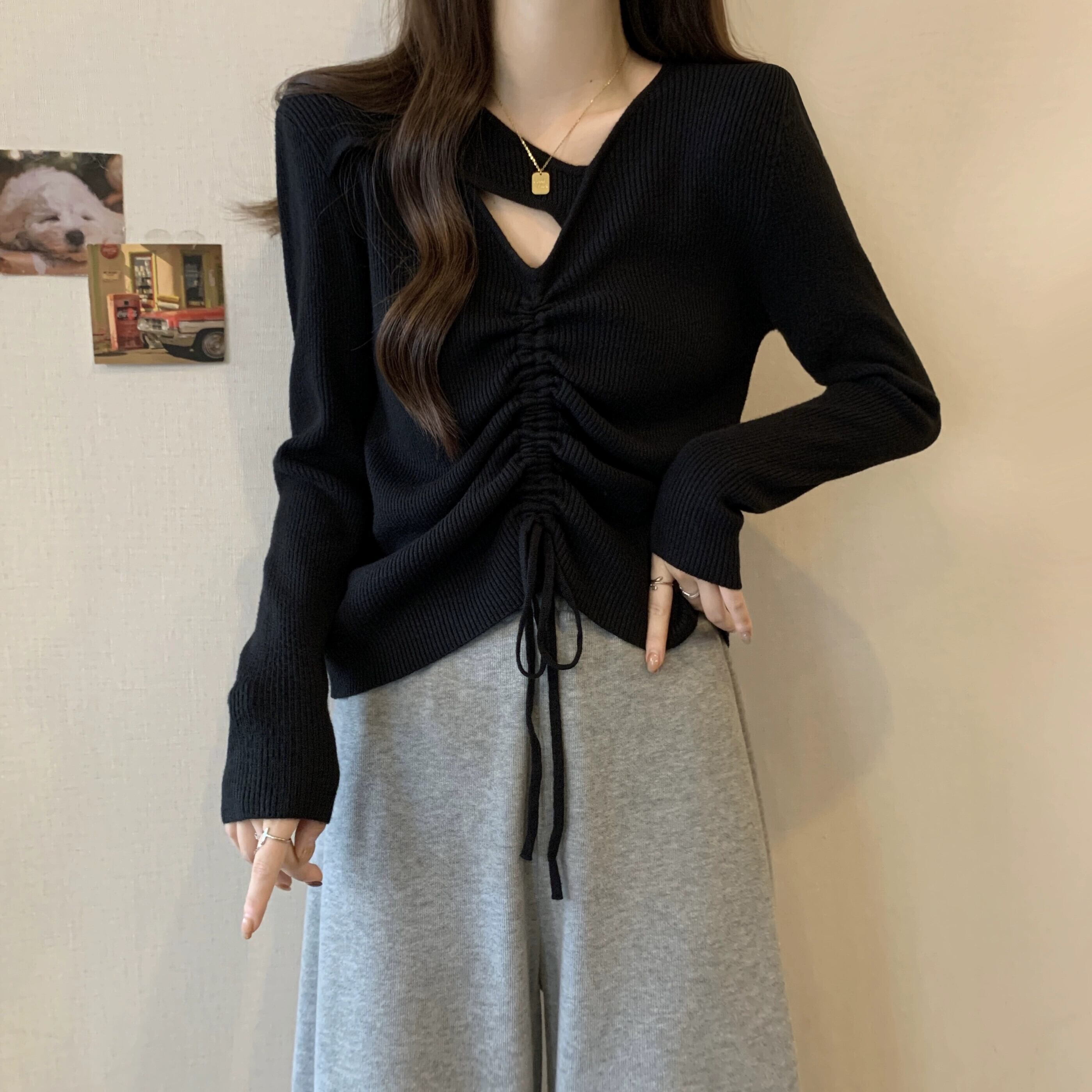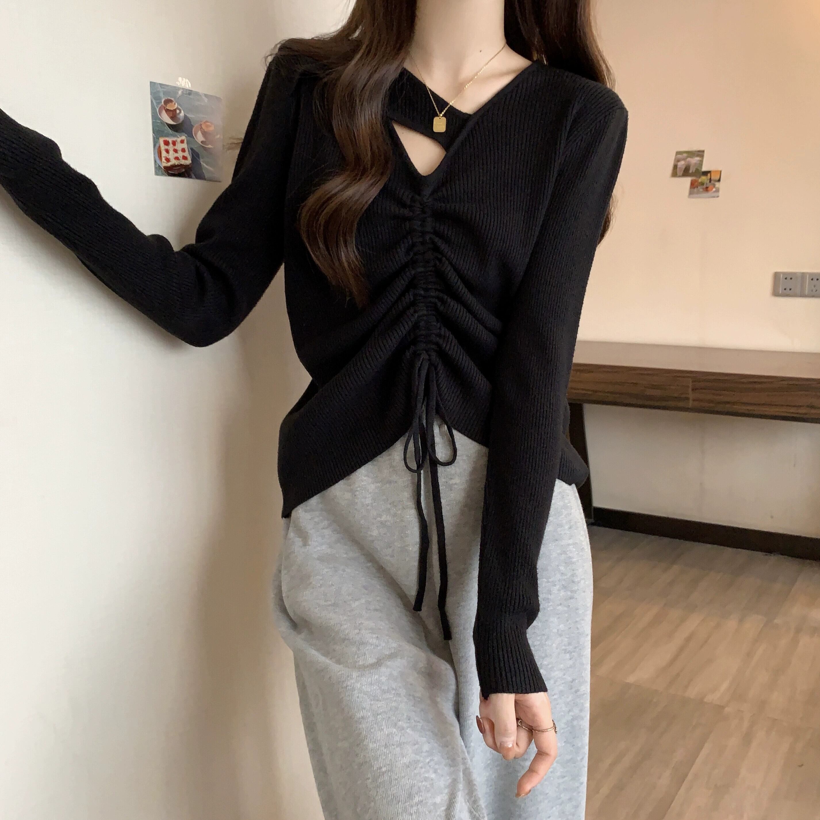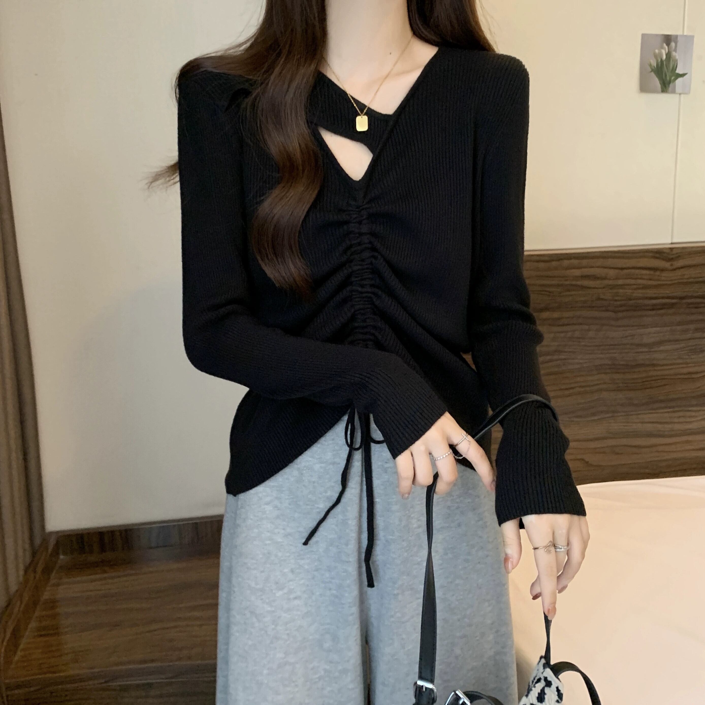 巾着プリーツ V ネックボトリングシャツ女性の秋と冬のファッショナブルでスリムな不規則な半袖ニットセーター ショート ロング オータム 秋物 ウィンター 冬物 Vネック 7460020750713777 | framboise21
