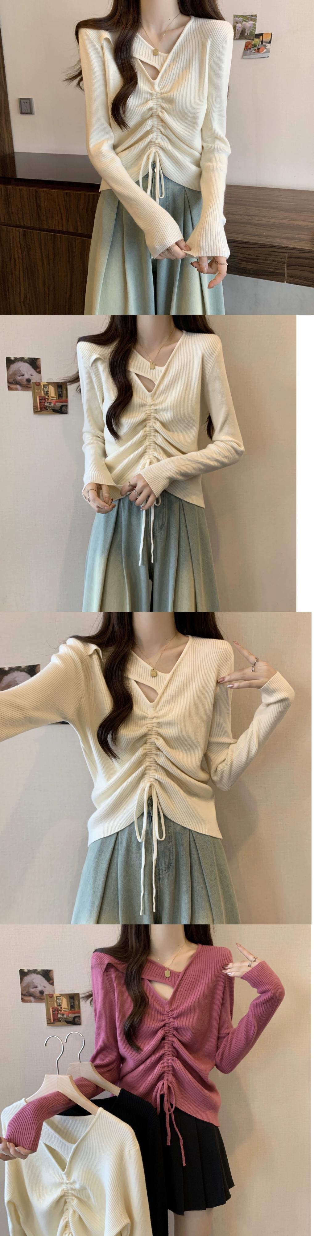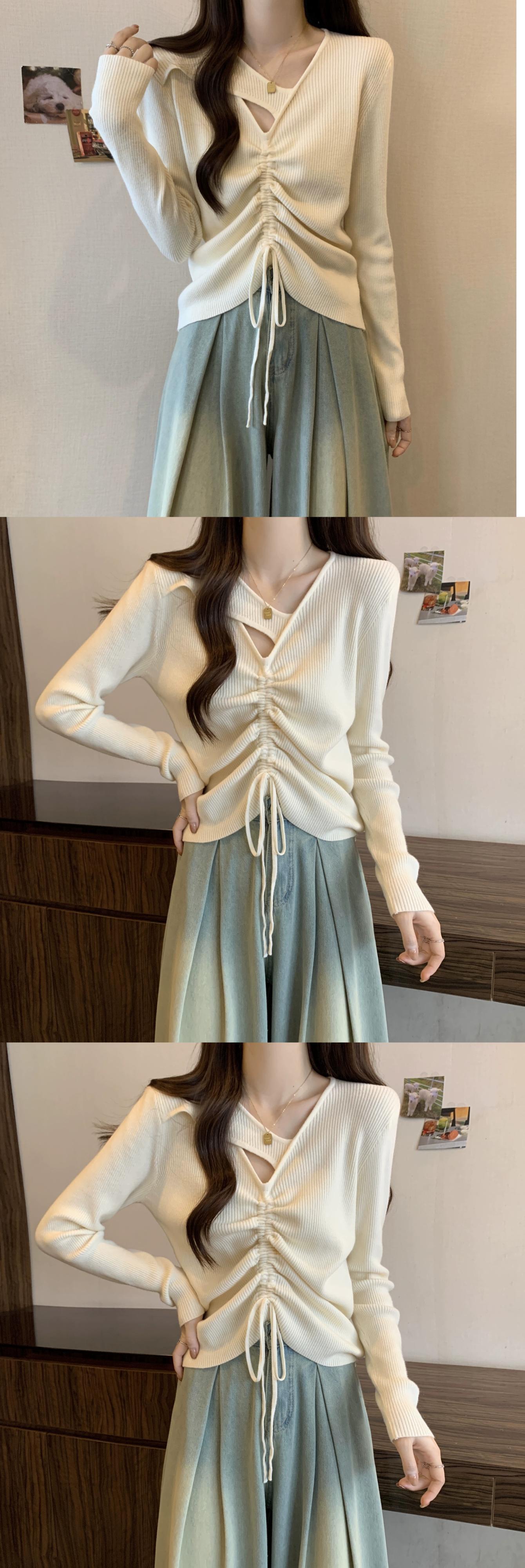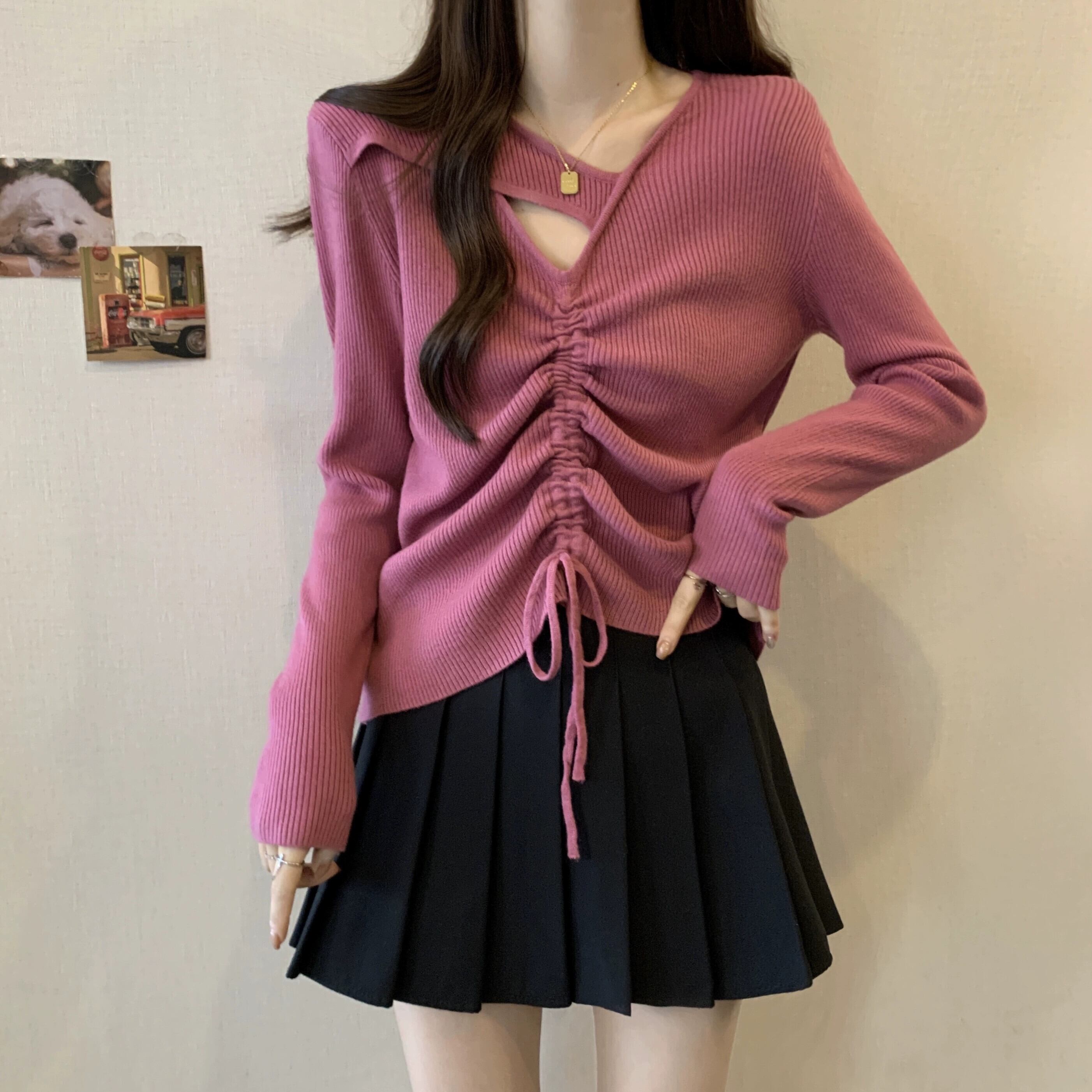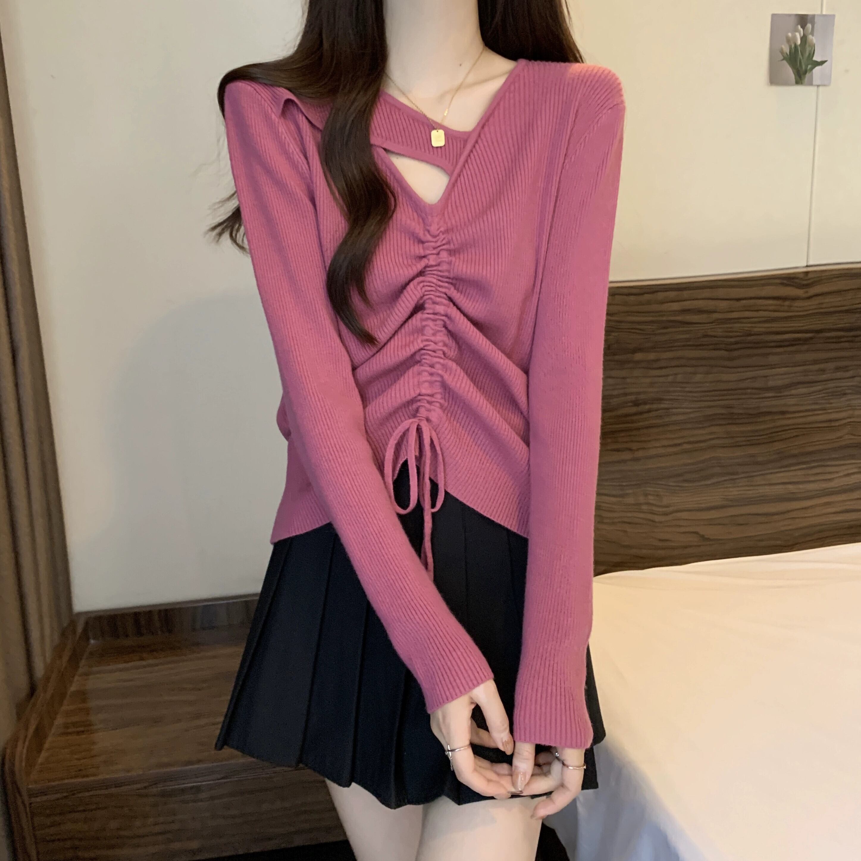 巾着プリーツ V ネックボトリングシャツ女性の秋と冬のファッショナブルでスリムな不規則な半袖ニットセーター ショート ロング オータム 秋物 ウィンター 冬物 Vネック 7460020750713777 | framboise21