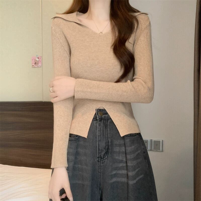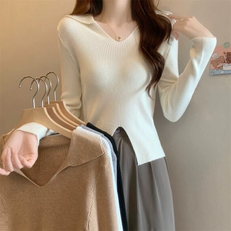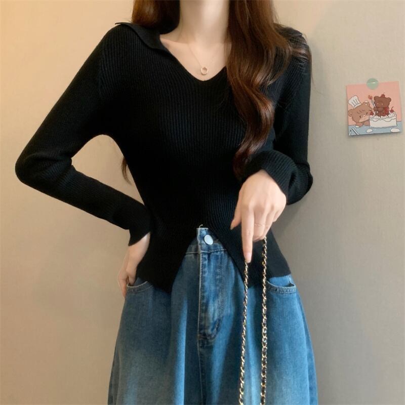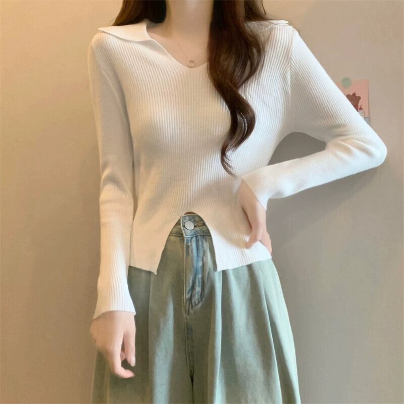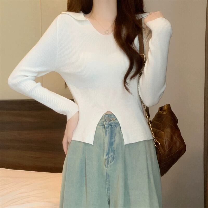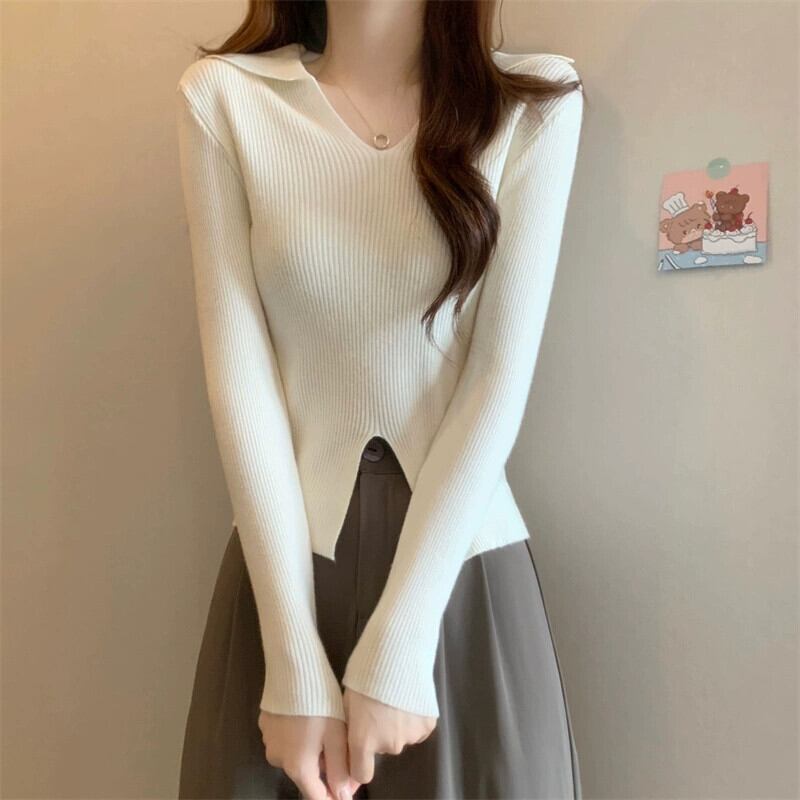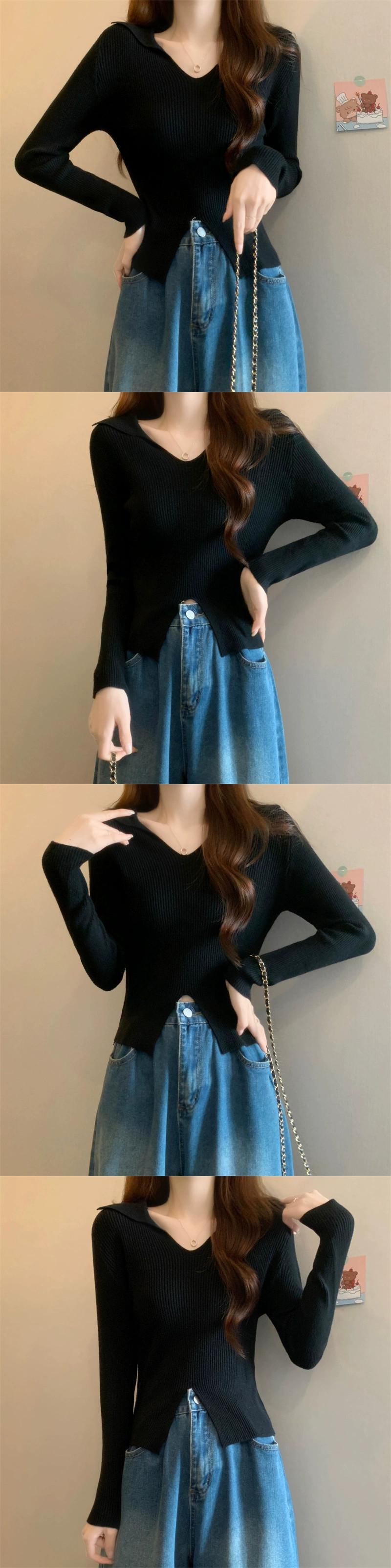 スリットショートローネックボトリングシャツ2023新作レディース秋冬ファッショナブルでスリムフィットの長袖ニットセーター ロング オータム 秋物 ウィンター 冬物 7460020651761640 | framboise21