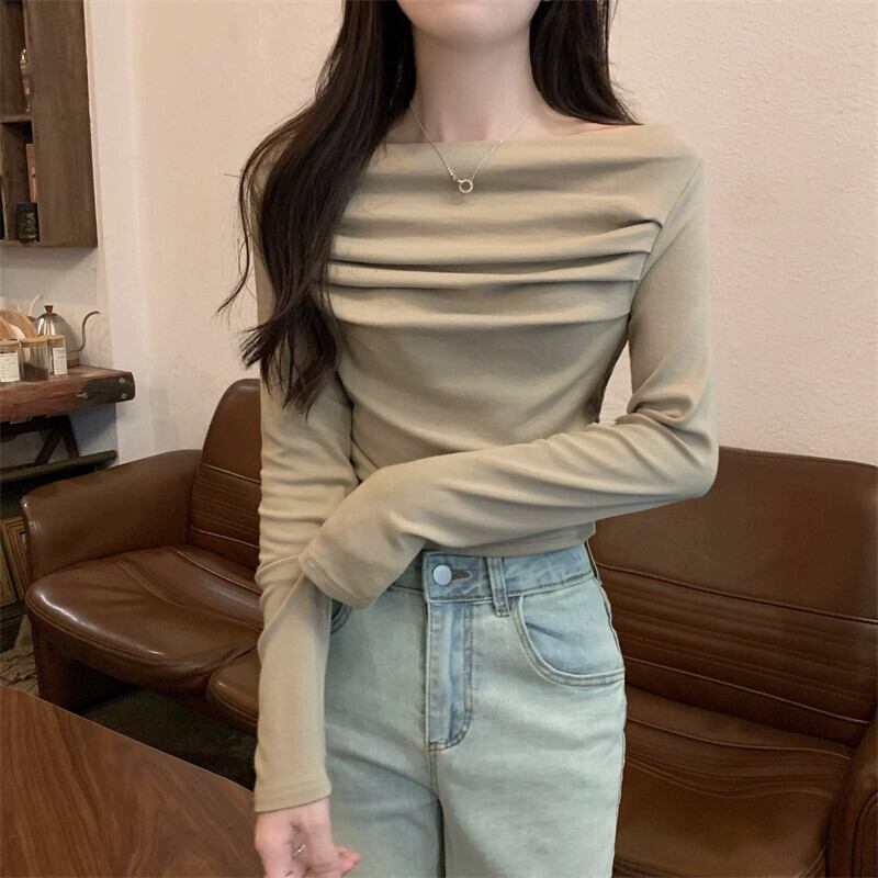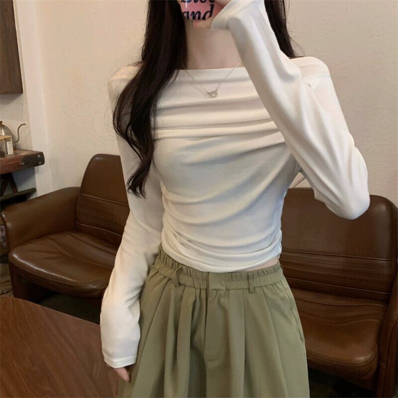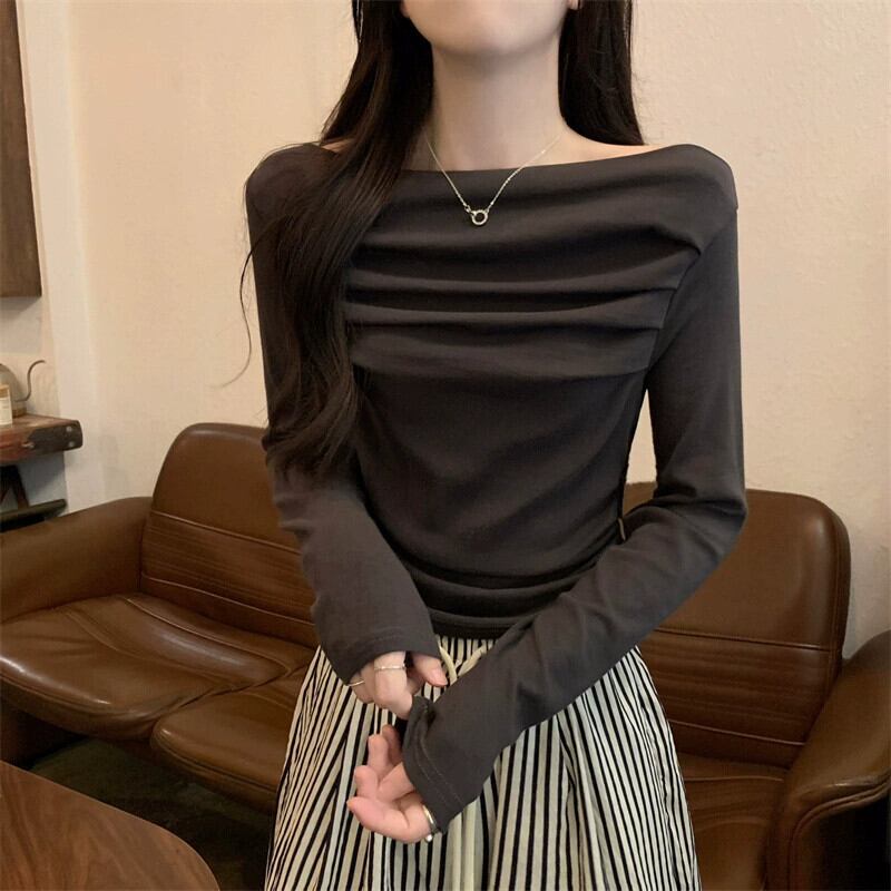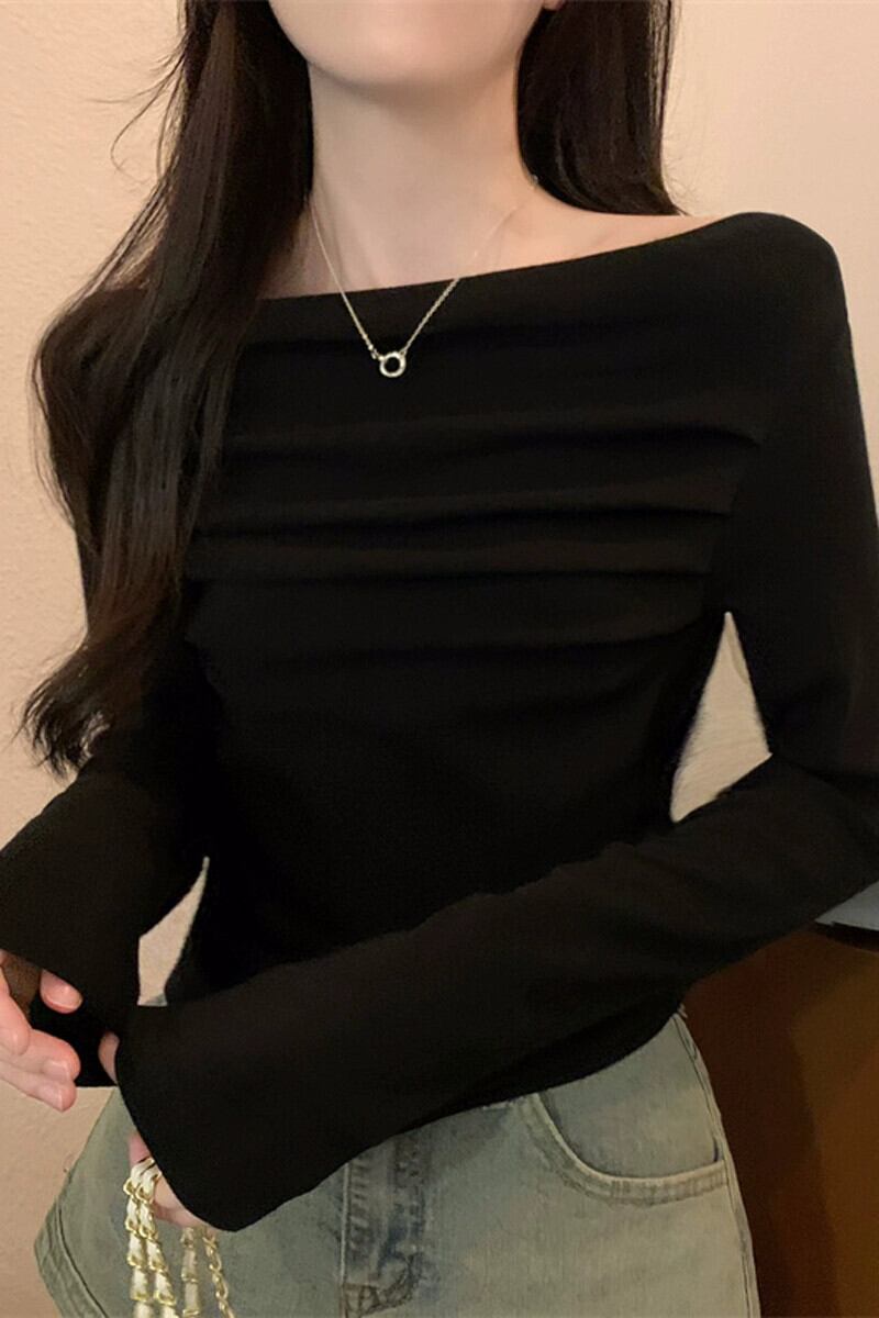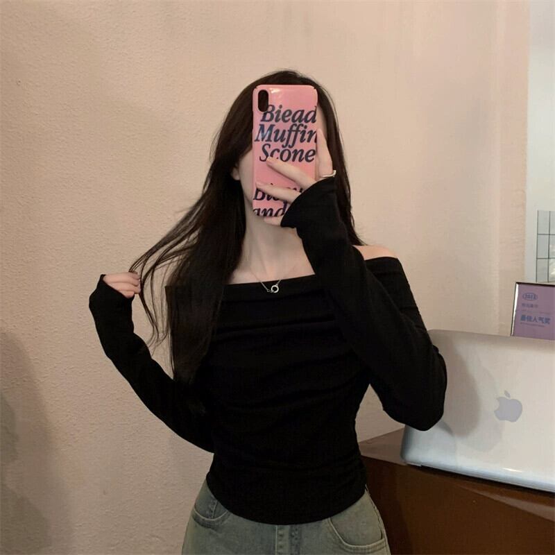 秋の黒のワンショルダートップ女性、スリムなショートオフショルダー長袖Tシャツを備えたハイエンドのタイトフィットボトムシャツ ロング ブラック オータム 秋物 7460027020444377 | framboise21