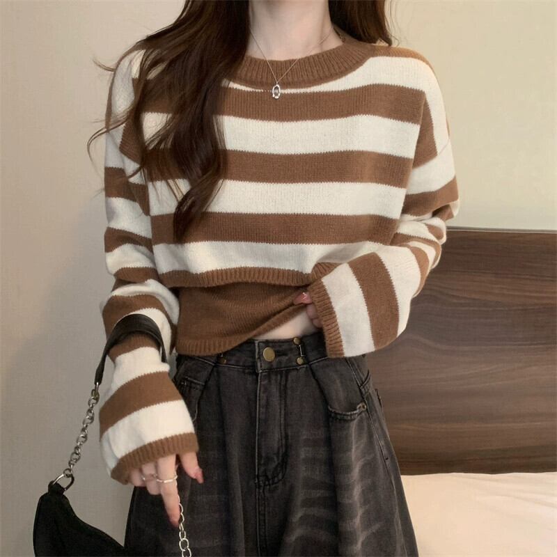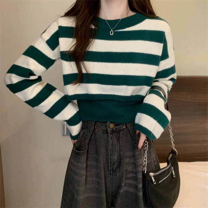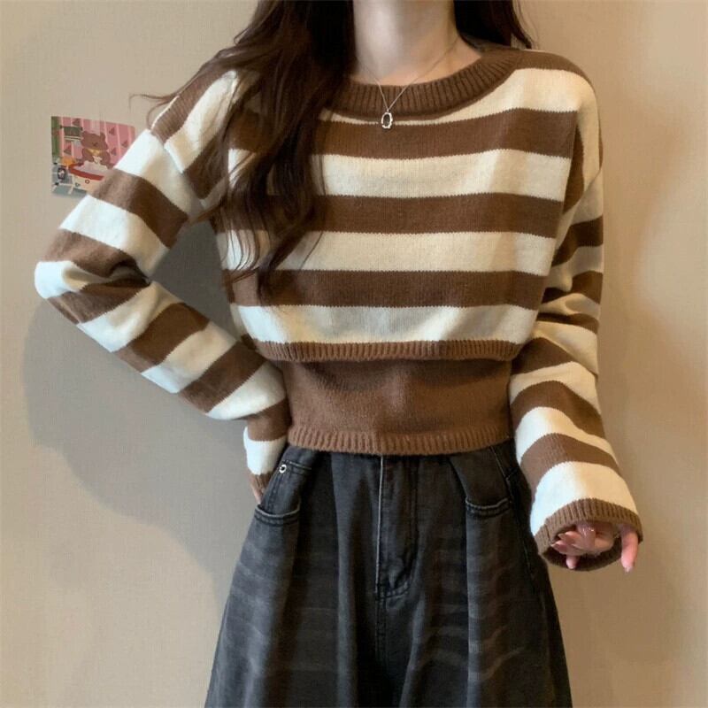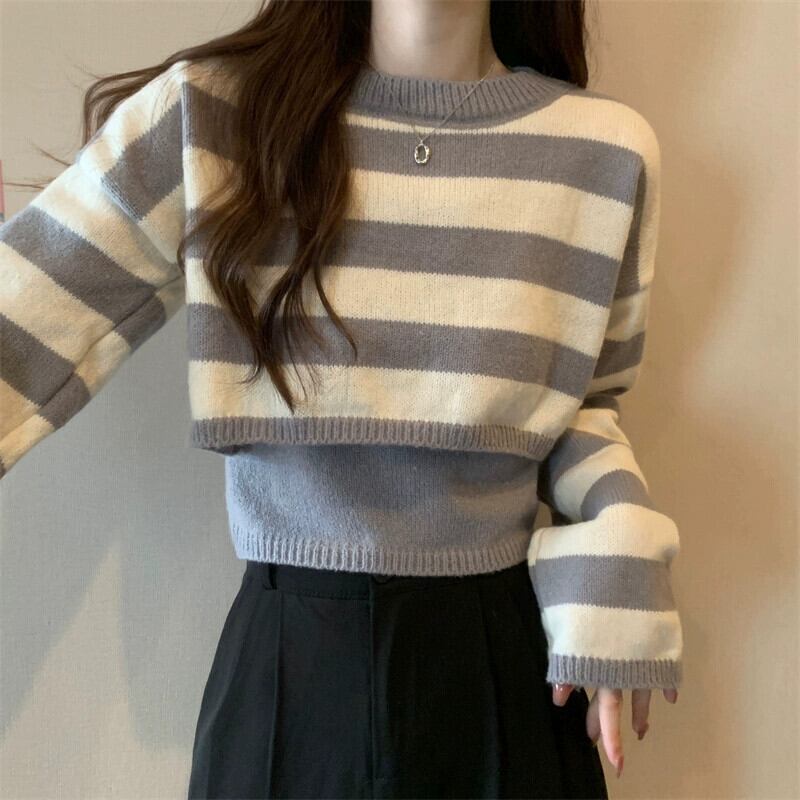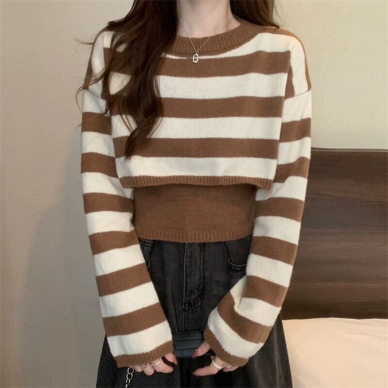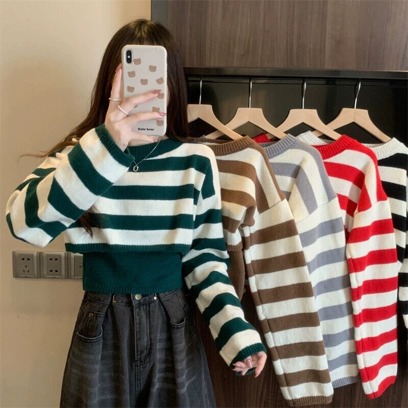 コントラストストライプショートセーター女性秋冬 2023 新しいアウターウェアルーズでスリムなニットサスペンダートップ 2 点セット オータム 秋物 ウィンター 冬物 7460080390273096 | framboise21