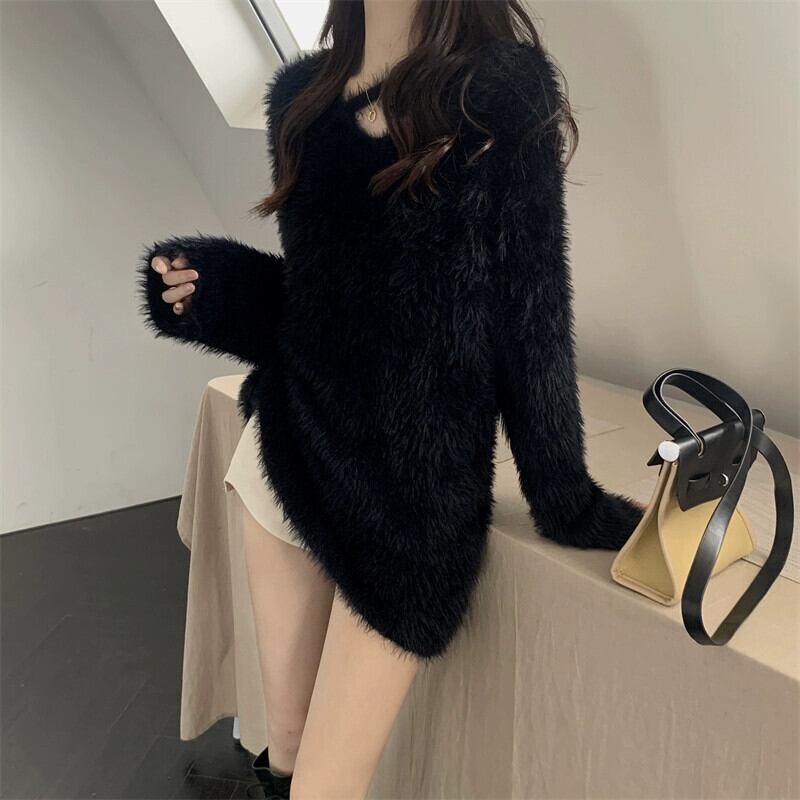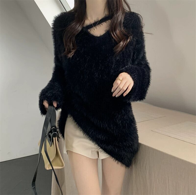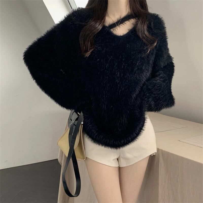厚く模造ミンクベルベット中空セーター女性、秋と冬のフランスのルーズなアウターウェア、怠惰なスタイルの V ネック長袖セーター ロング オータム 秋物 ウィンター 冬物 Vネック 7460076735622010 | framboise21