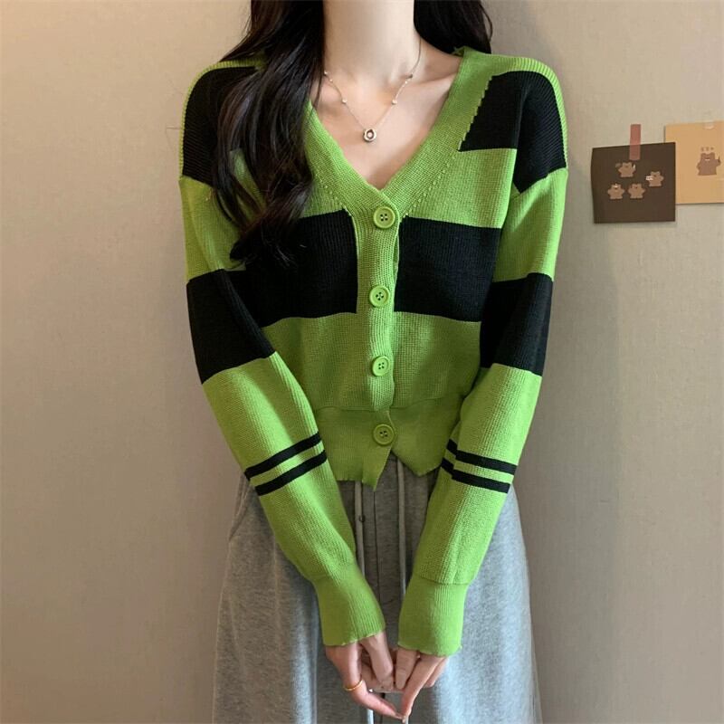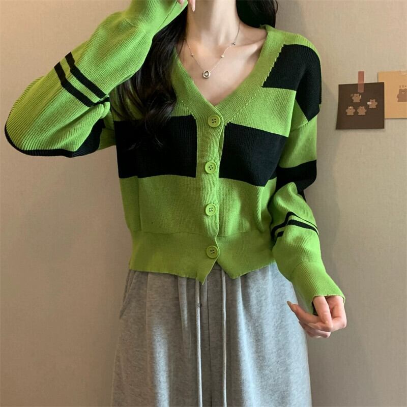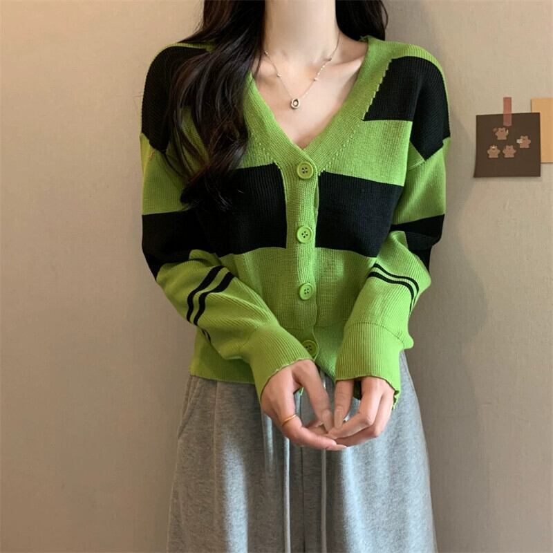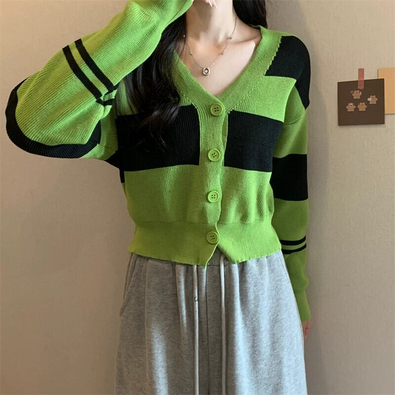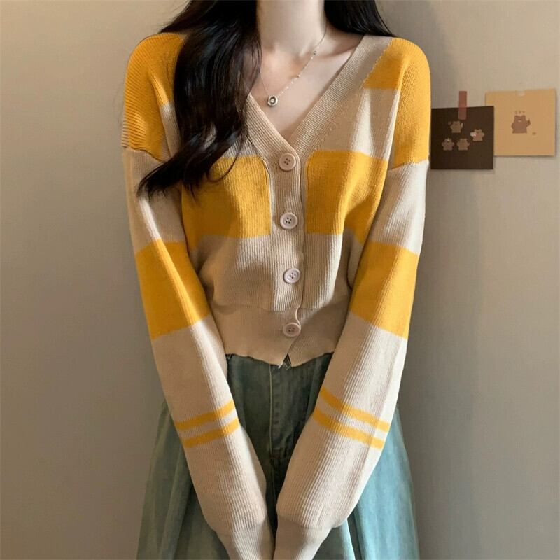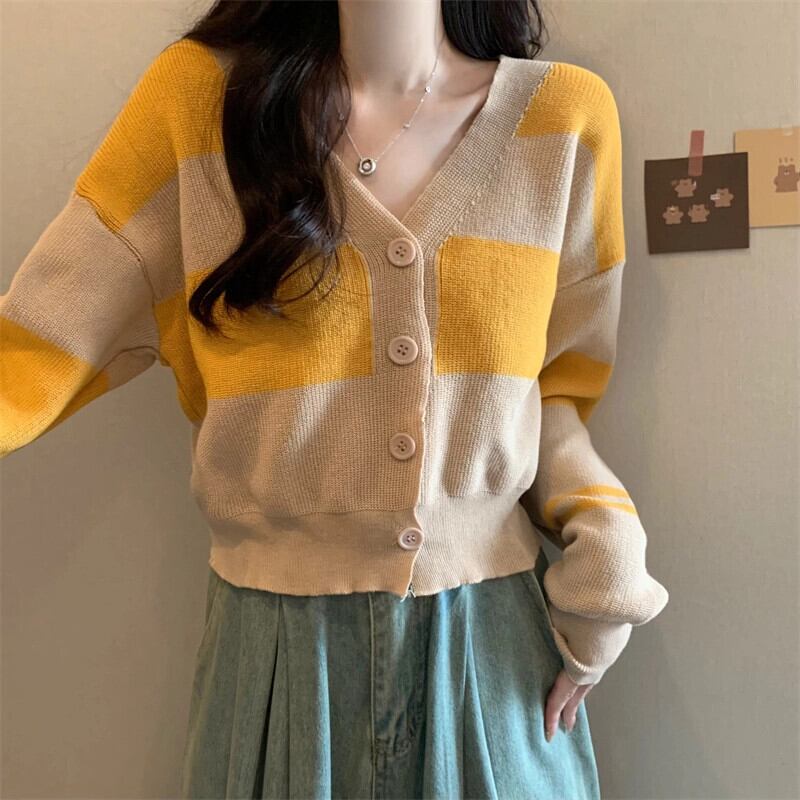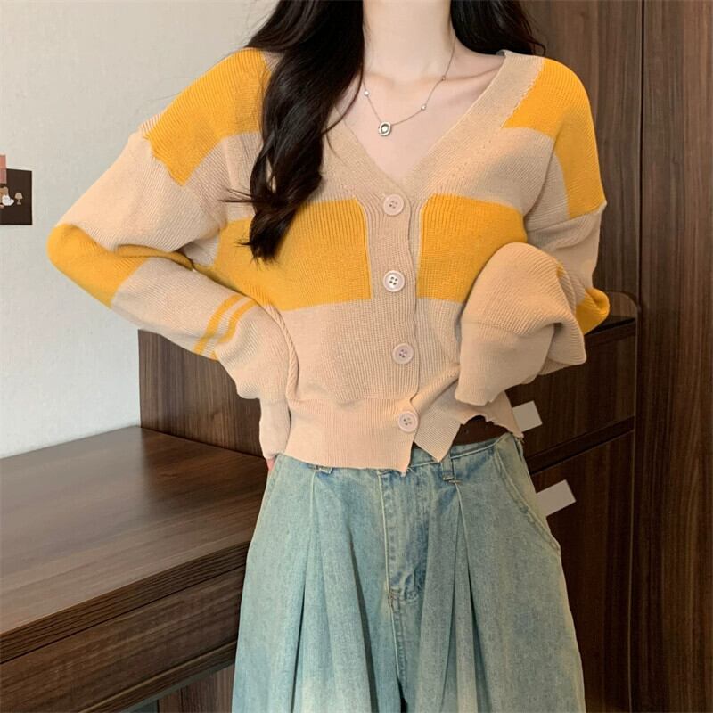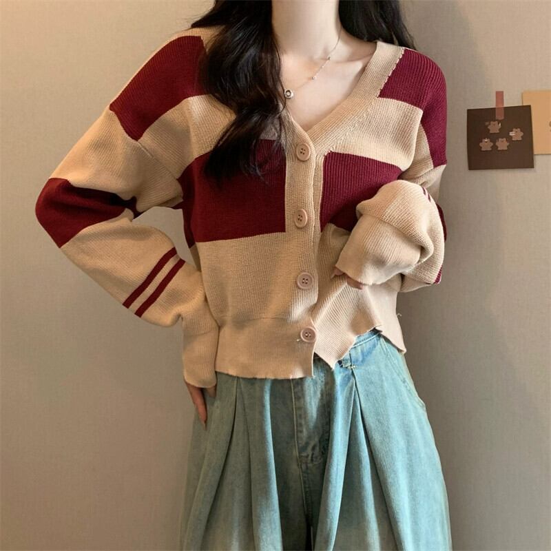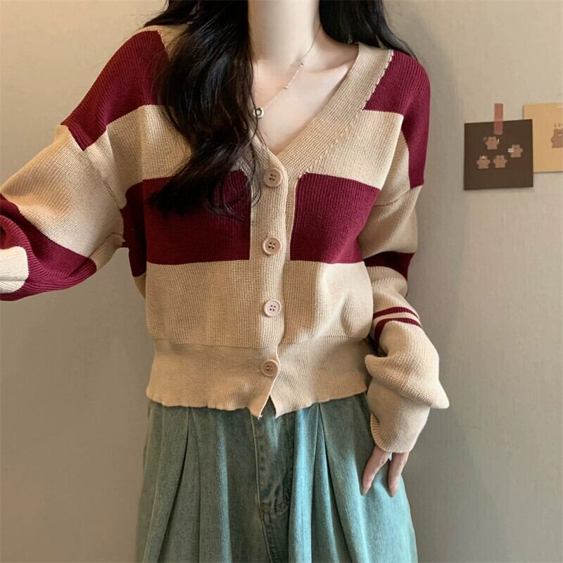 ストライプショートカーディガンセーターコート女性秋と冬のレトロなeseスタイル怠惰なルーズアウターウェアカラーブロックvネックセーター オータム 秋物 ウィンター 冬物 7460027448270627 | framboise21