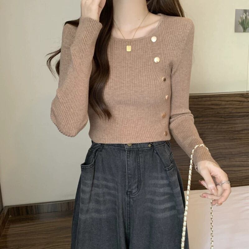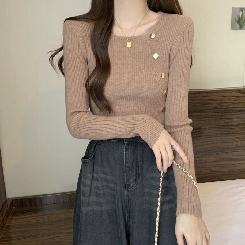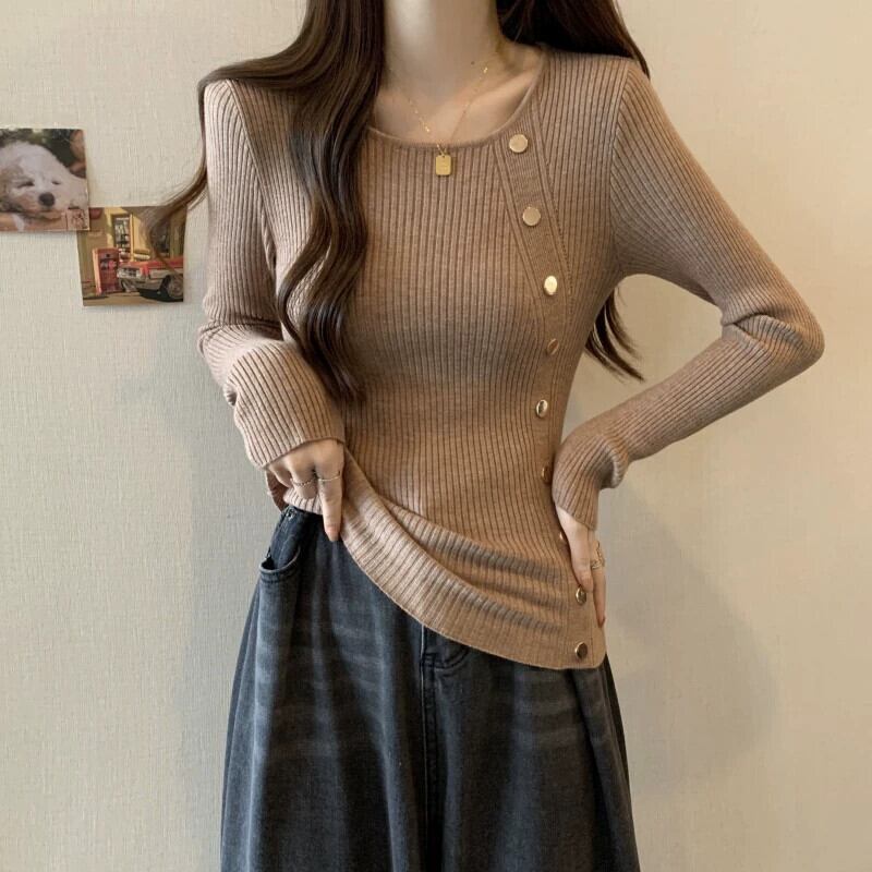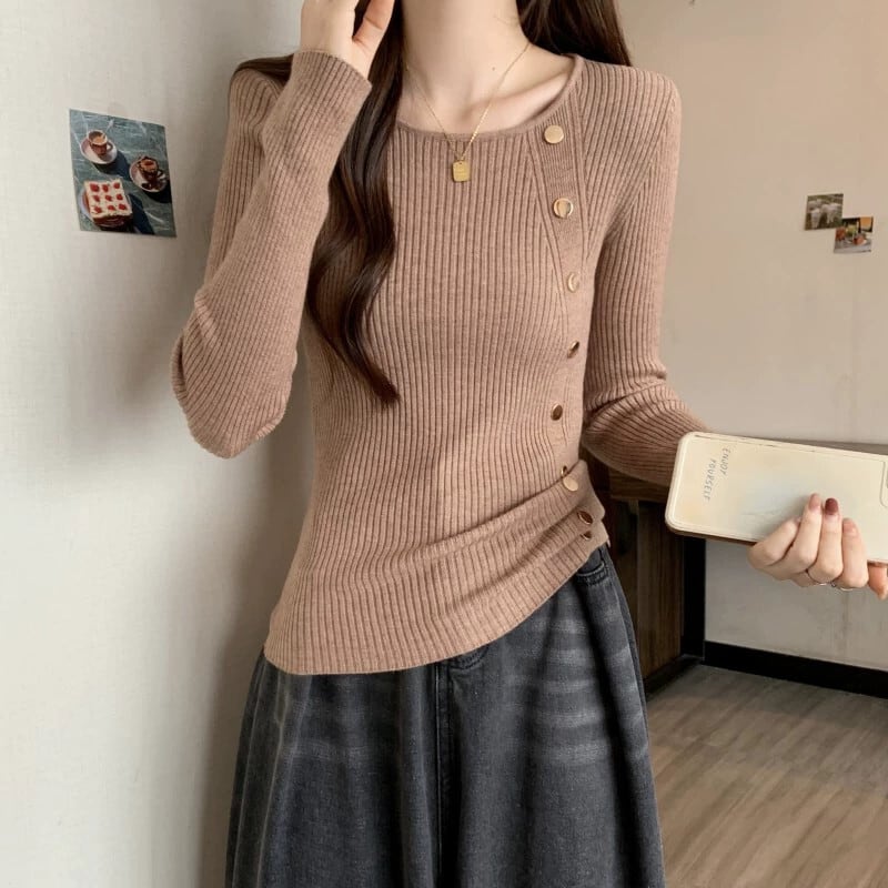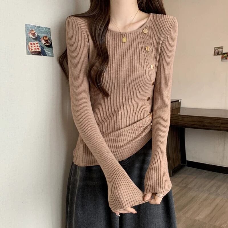 ブラウンリブニットボトムシャツレディース、秋冬スタイル、フレンチスリムフィット、プルオーバーラウンドネック長袖セーター ロング オータム 秋物 ウィンター 冬物 Oネック 7460017127690827 | framboise21