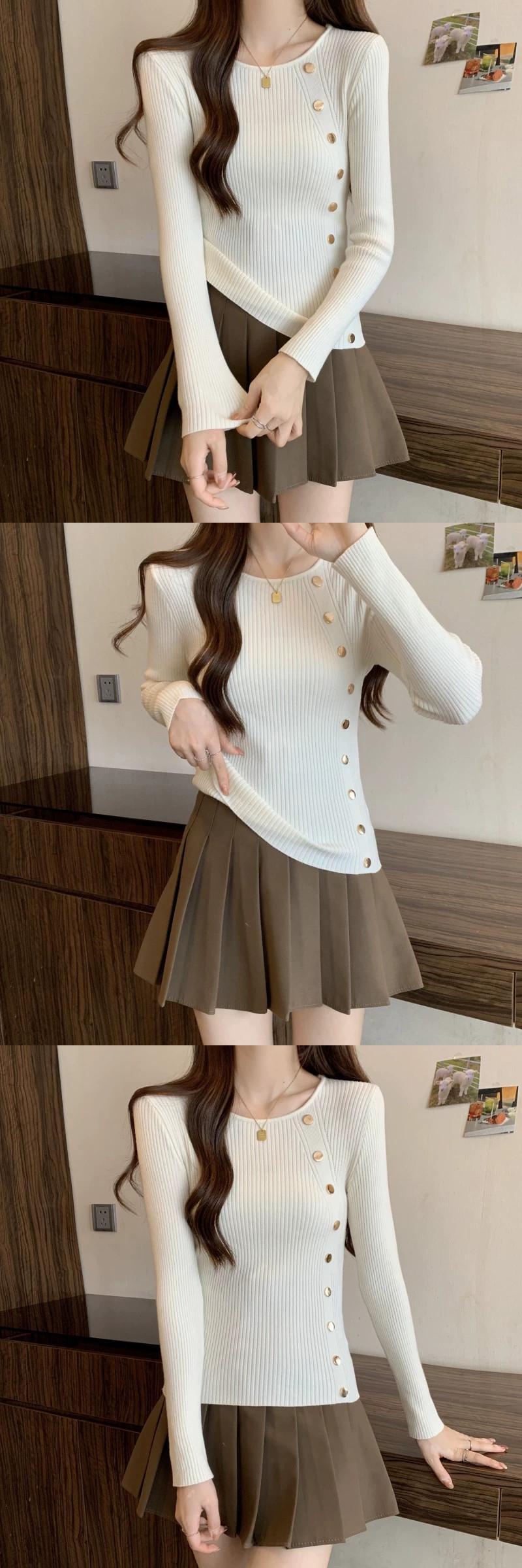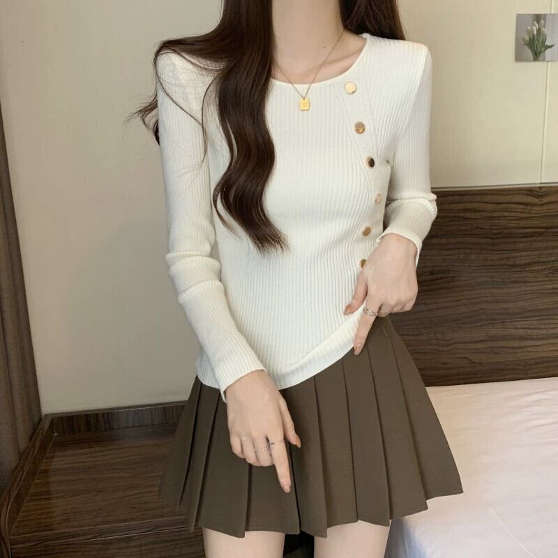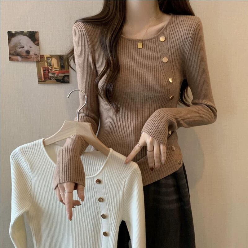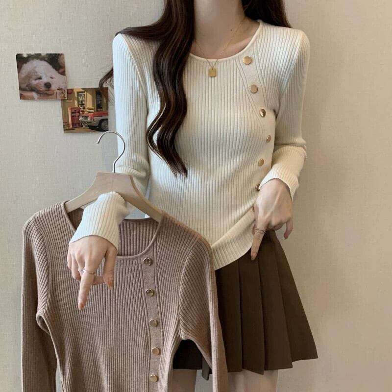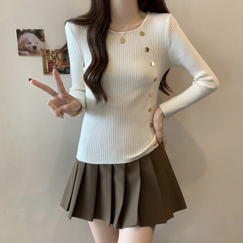 ブラウンリブニットボトムシャツレディース、秋冬スタイル、フレンチスリムフィット、プルオーバーラウンドネック長袖セーター ロング オータム 秋物 ウィンター 冬物 Oネック 7460017127690827 | framboise21