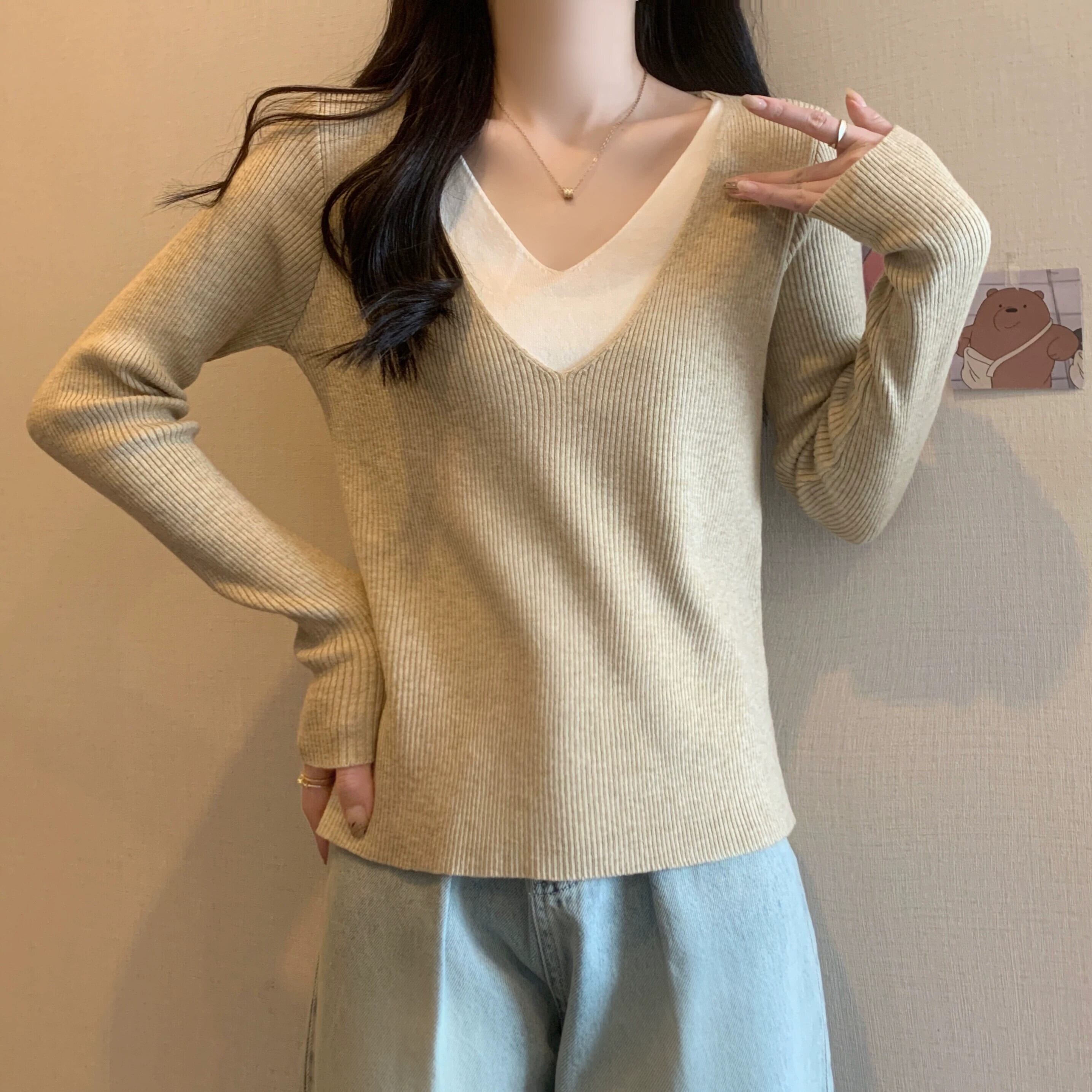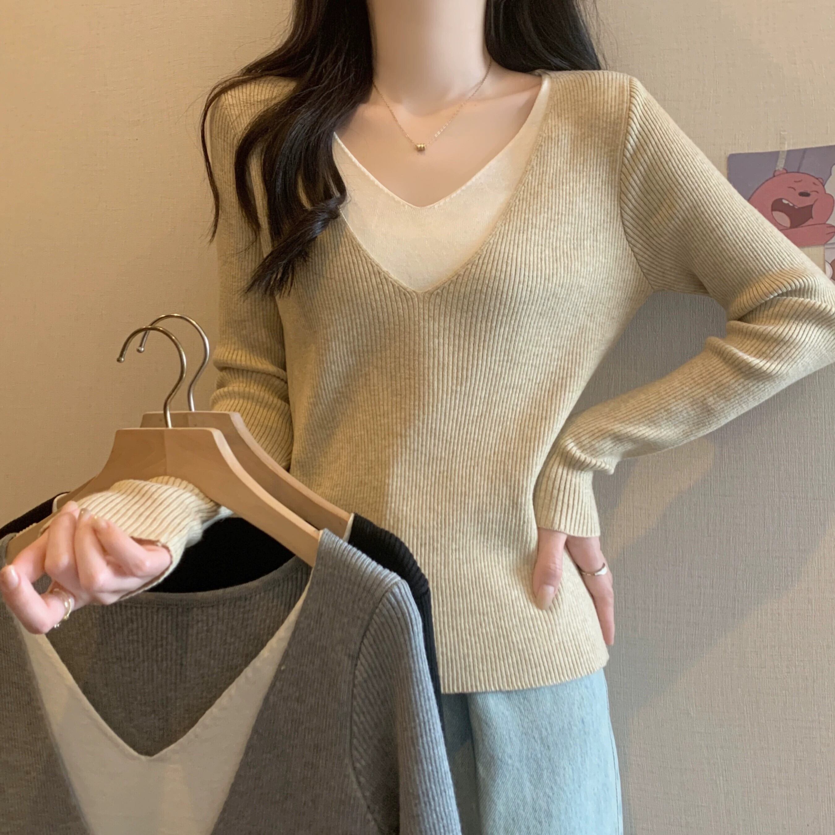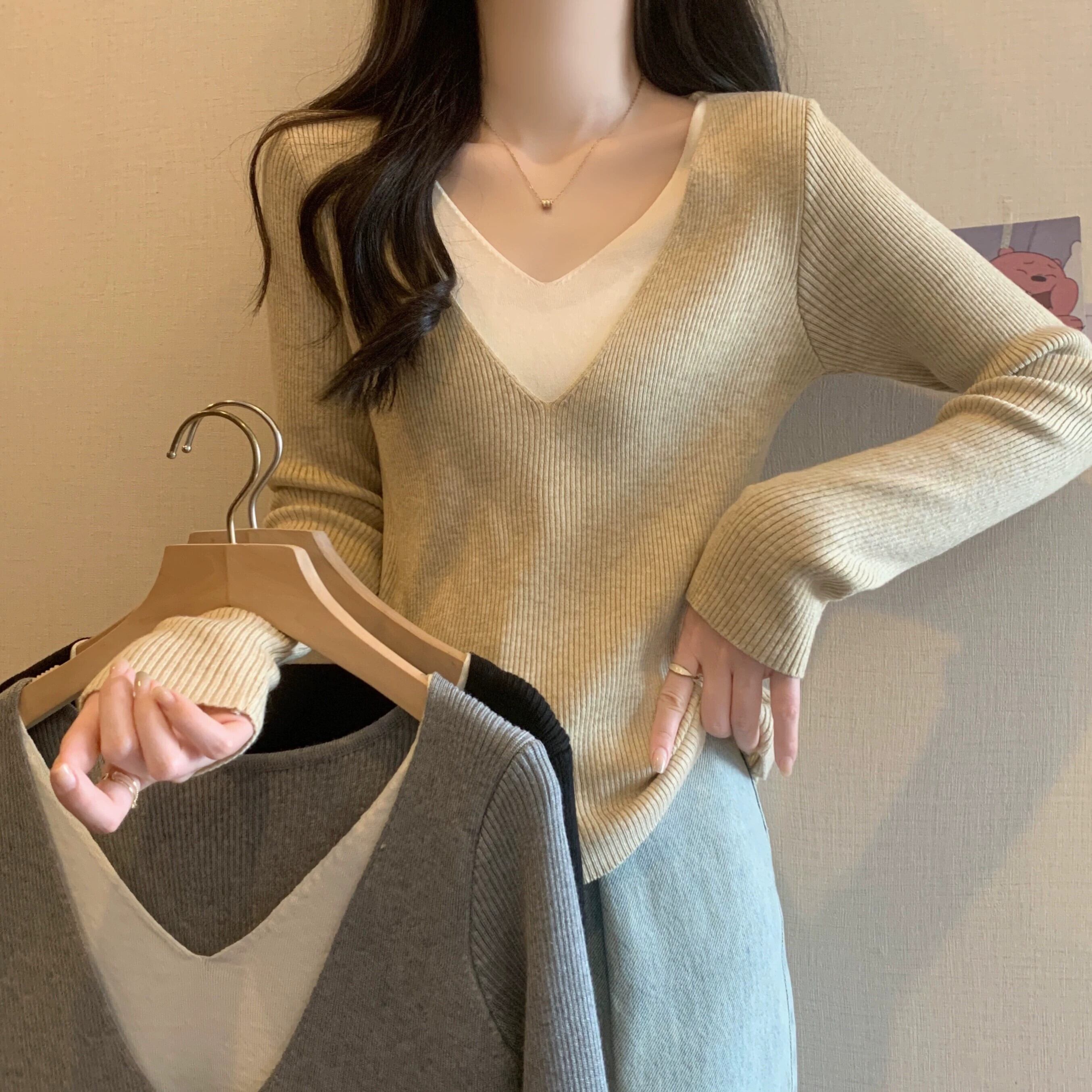 秋冬のフェイクツーピーススレッドボトムシャツレディース、ファッショナブルでスリム、Vネック長袖ニットセーター付き ロング オータム 秋物 ウィンター 冬物 7460042190953700 | framboise21