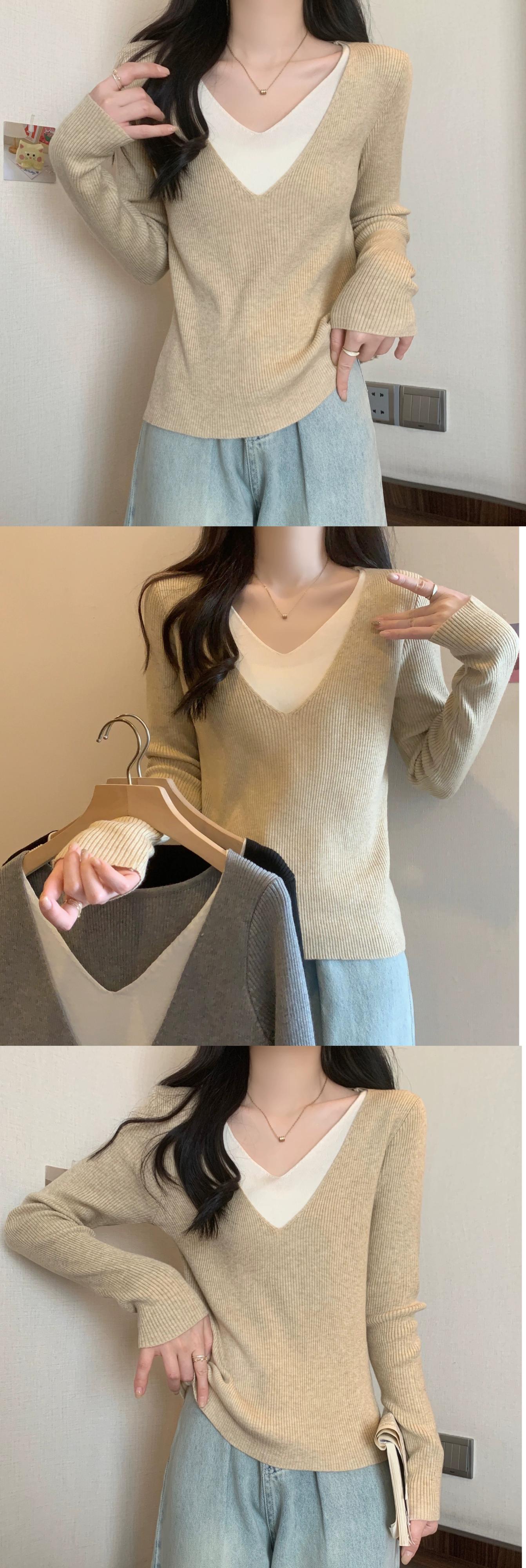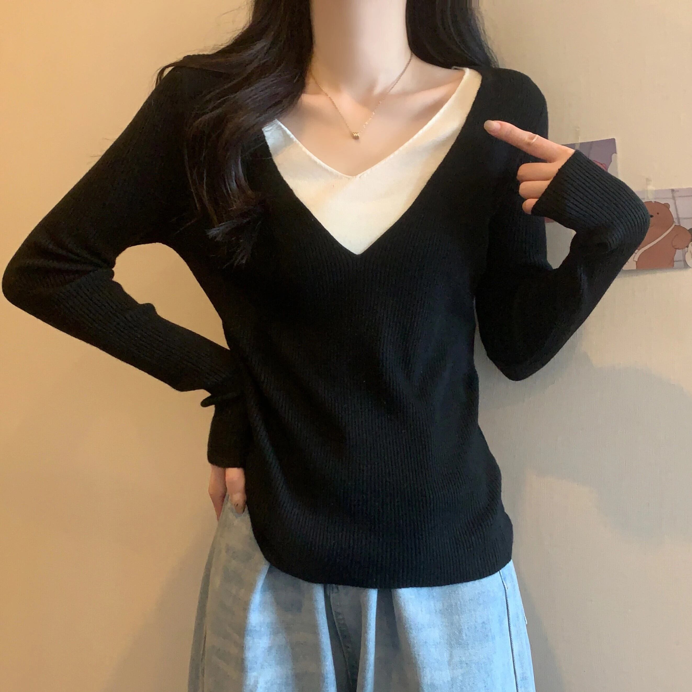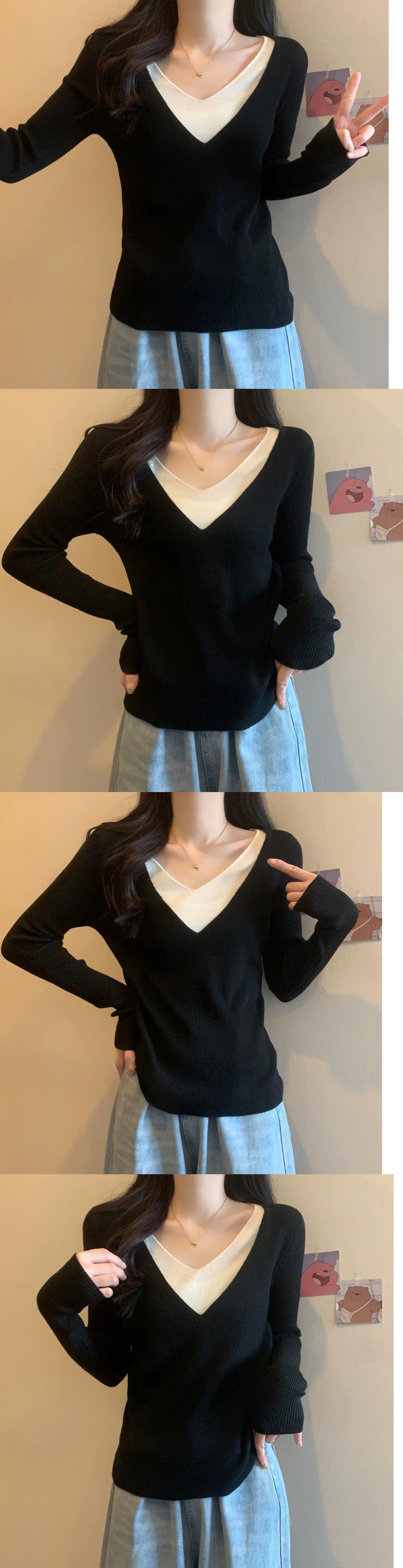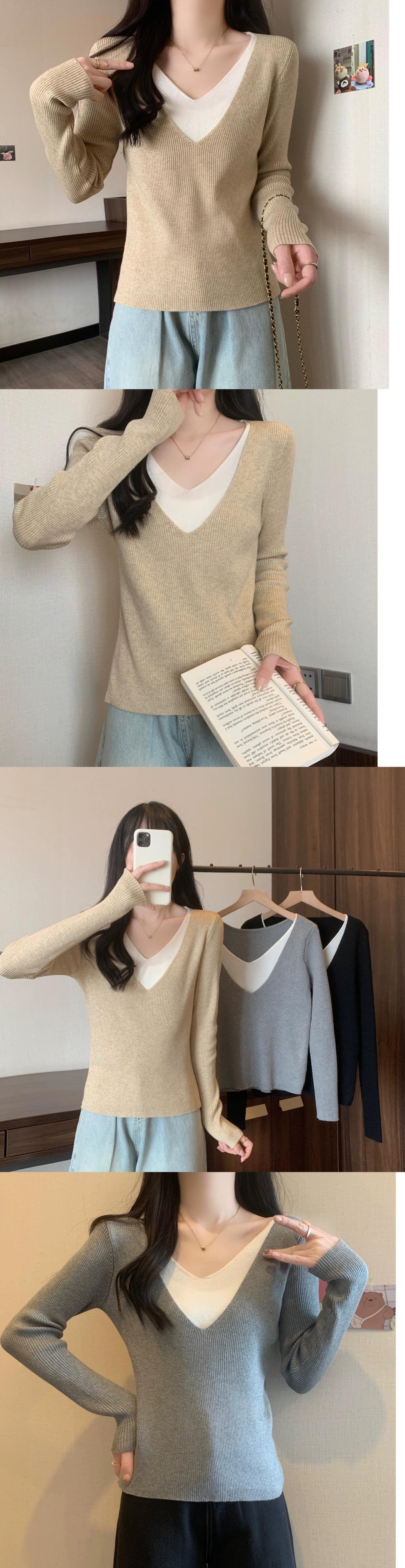 秋冬のフェイクツーピーススレッドボトムシャツレディース、ファッショナブルでスリム、Vネック長袖ニットセーター付き ロング オータム 秋物 ウィンター 冬物 7460042190953700 | framboise21