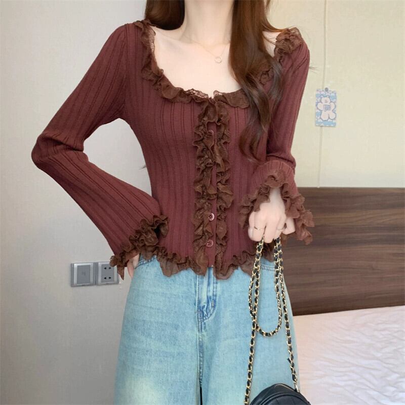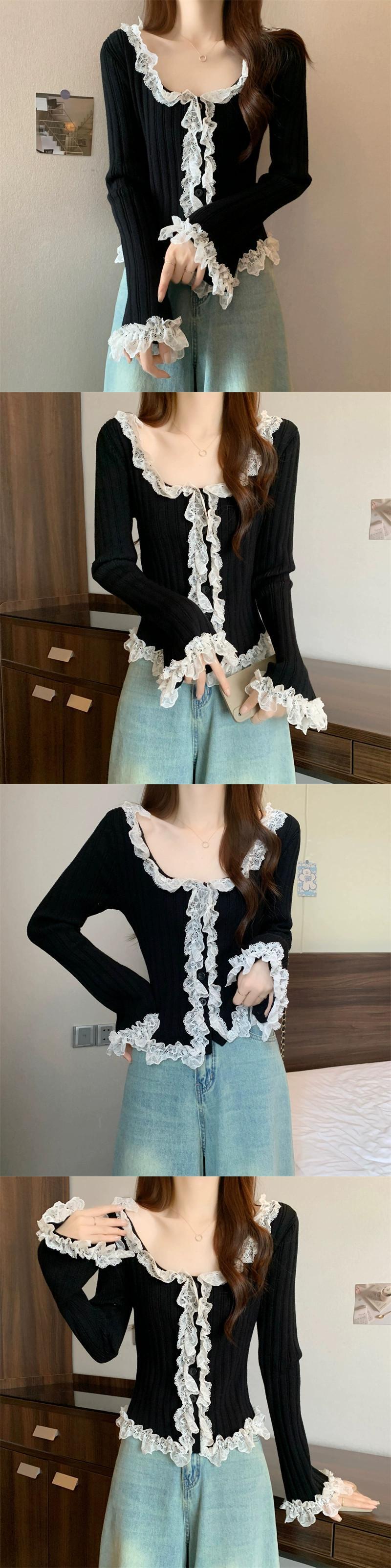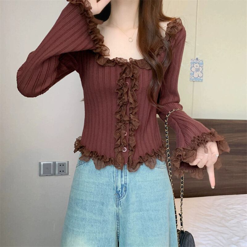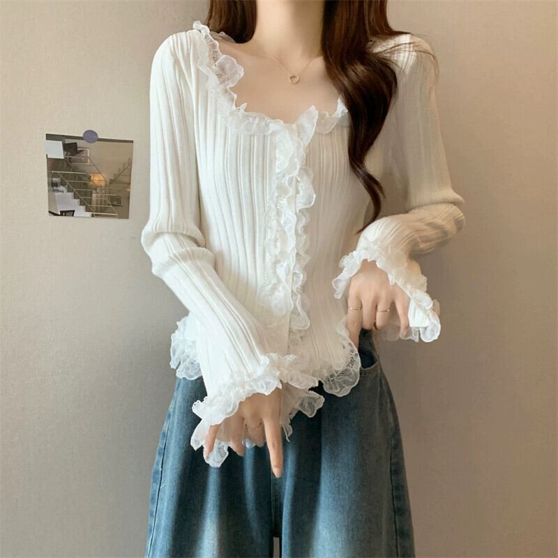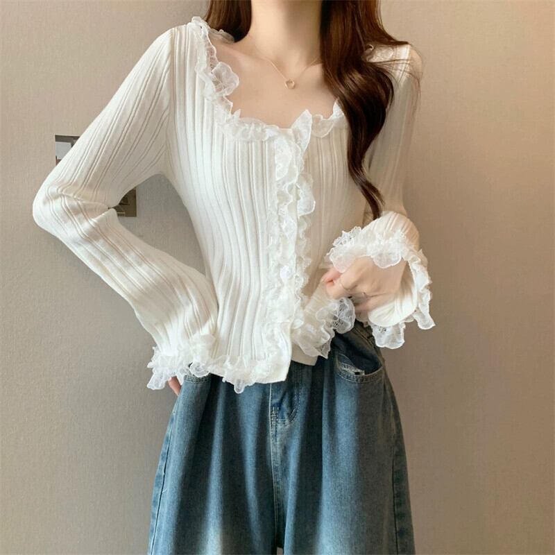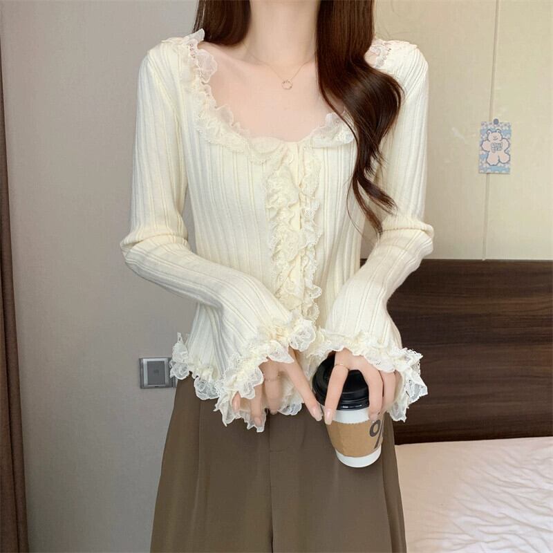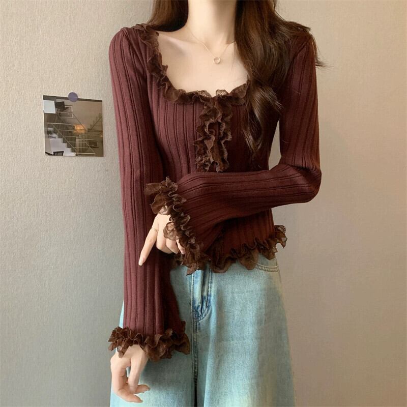 秋冬のステッチレーススクエアネックボトリングシャツ女性、ファッショナブルでスリム、ショートトランペット長袖ニットセーター付き ロング オータム 秋物 ウィンター 冬物 スクウェア 7460092665928422 | framboise21