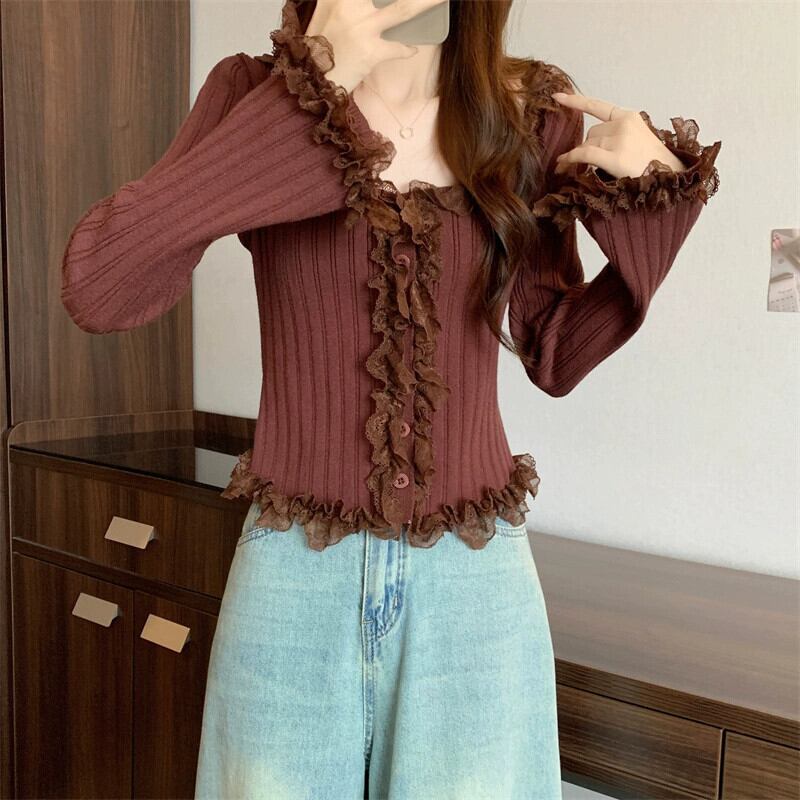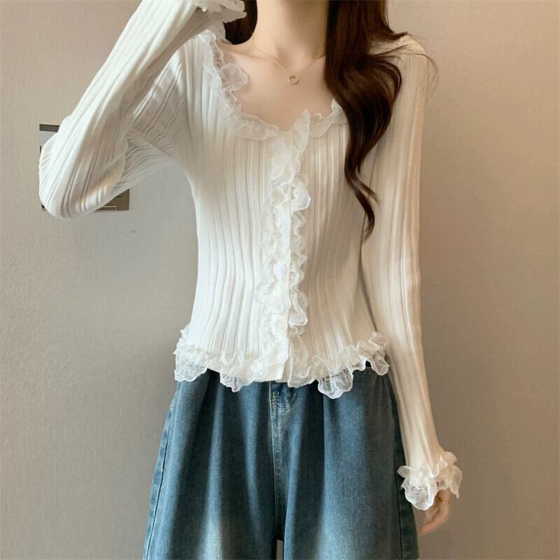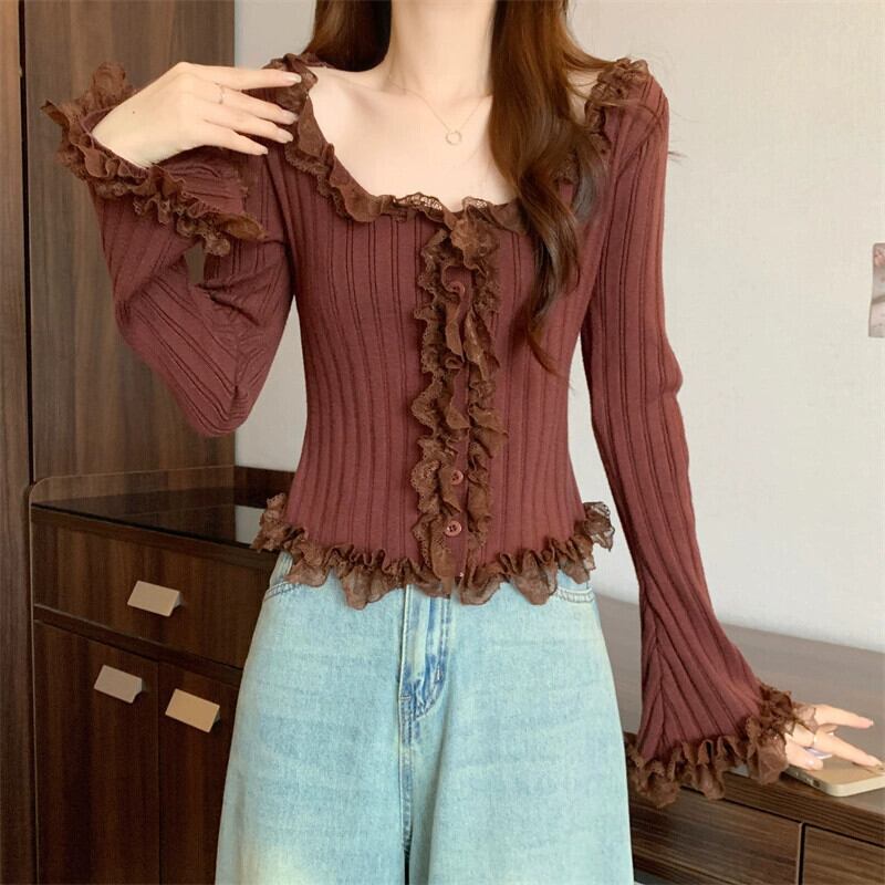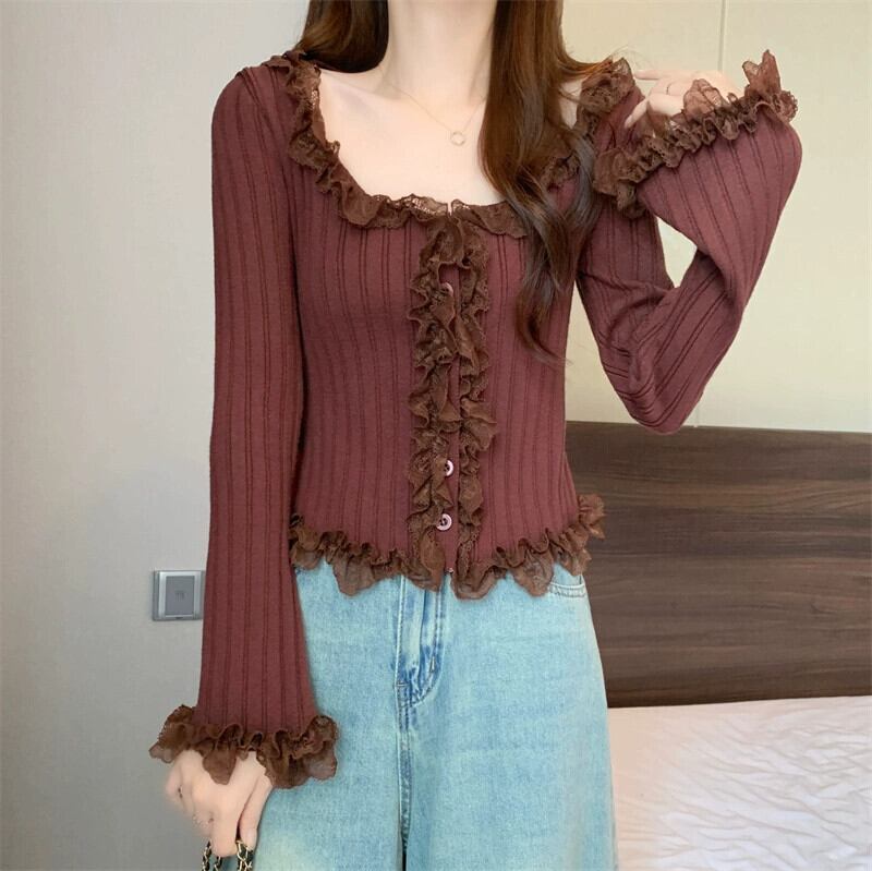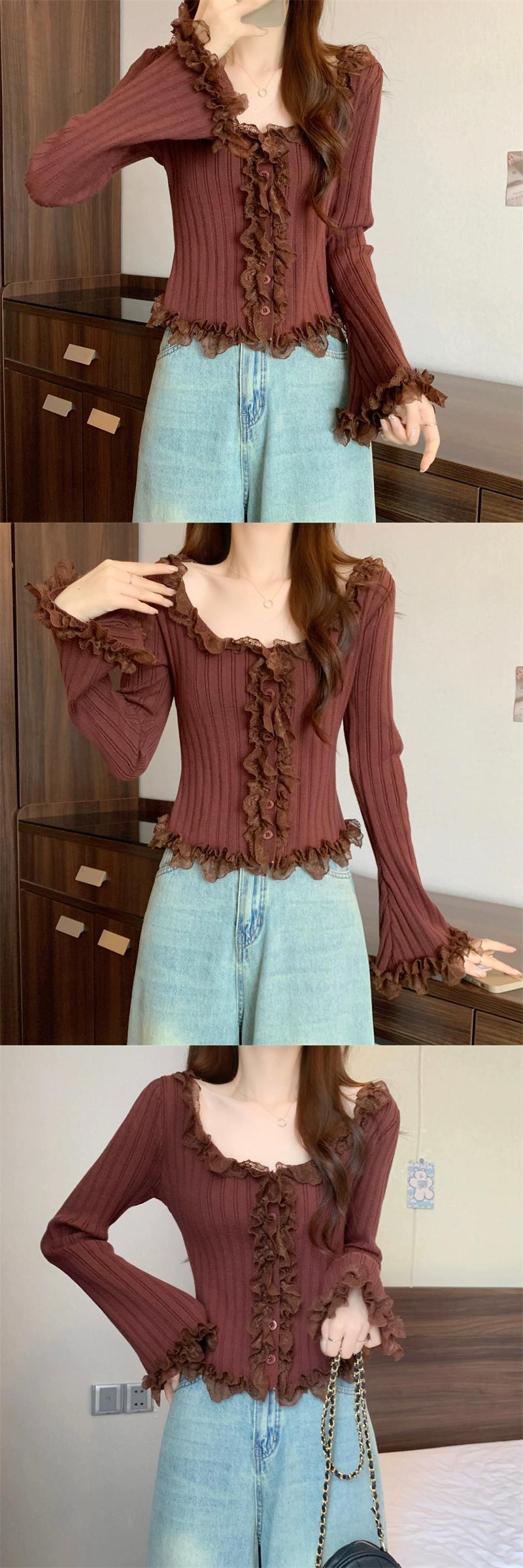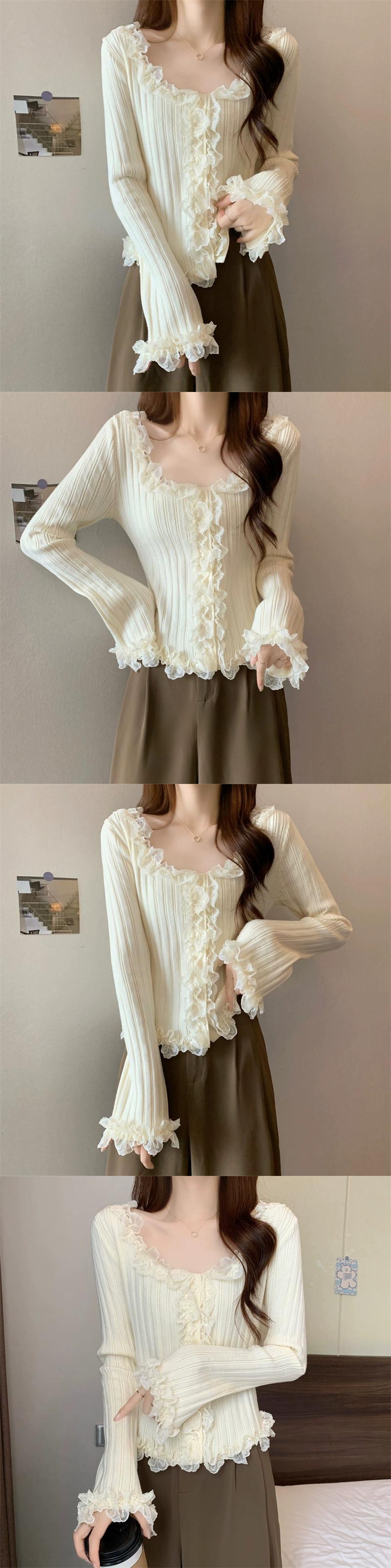 秋冬のステッチレーススクエアネックボトリングシャツ女性、ファッショナブルでスリム、ショートトランペット長袖ニットセーター付き ロング オータム 秋物 ウィンター 冬物 スクウェア 7460092665928422 | framboise21