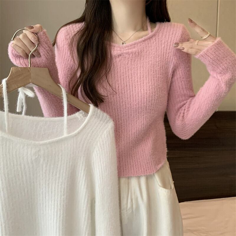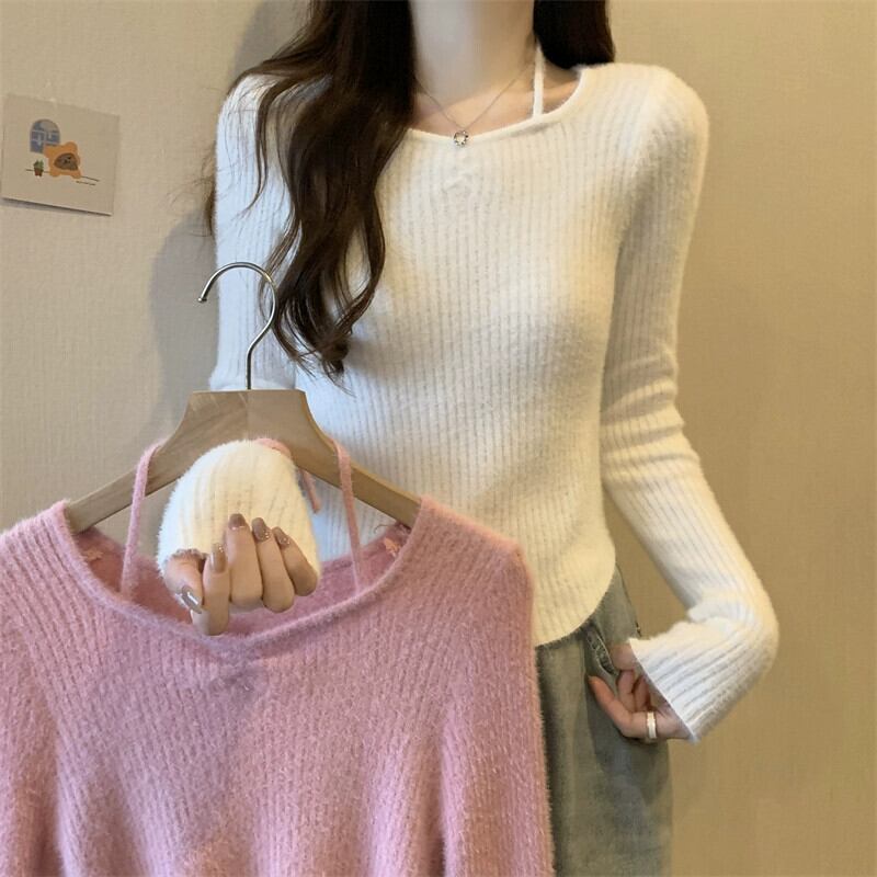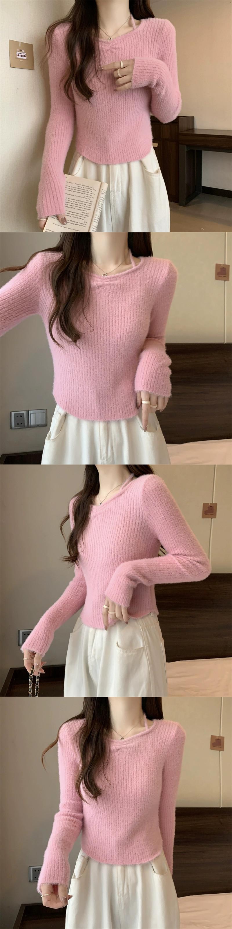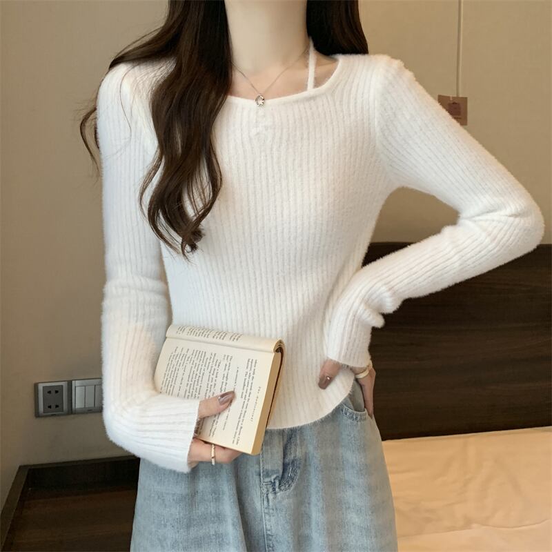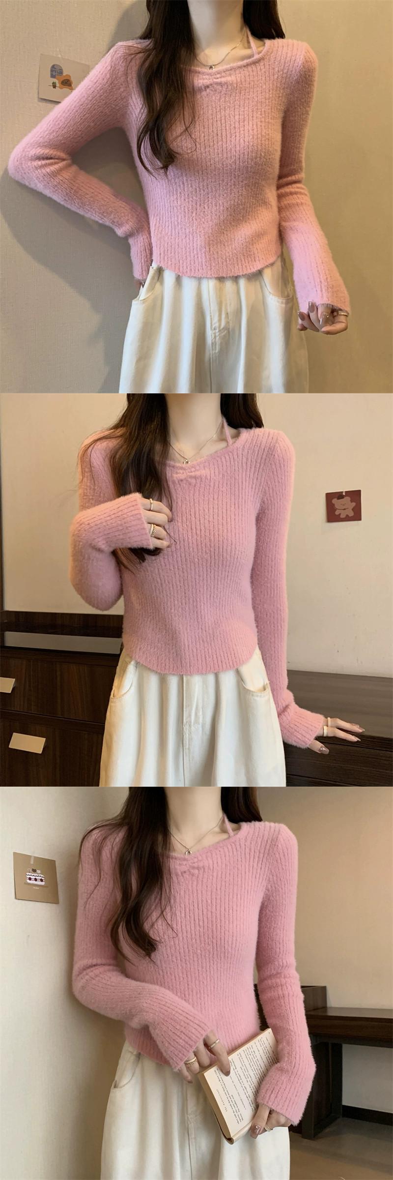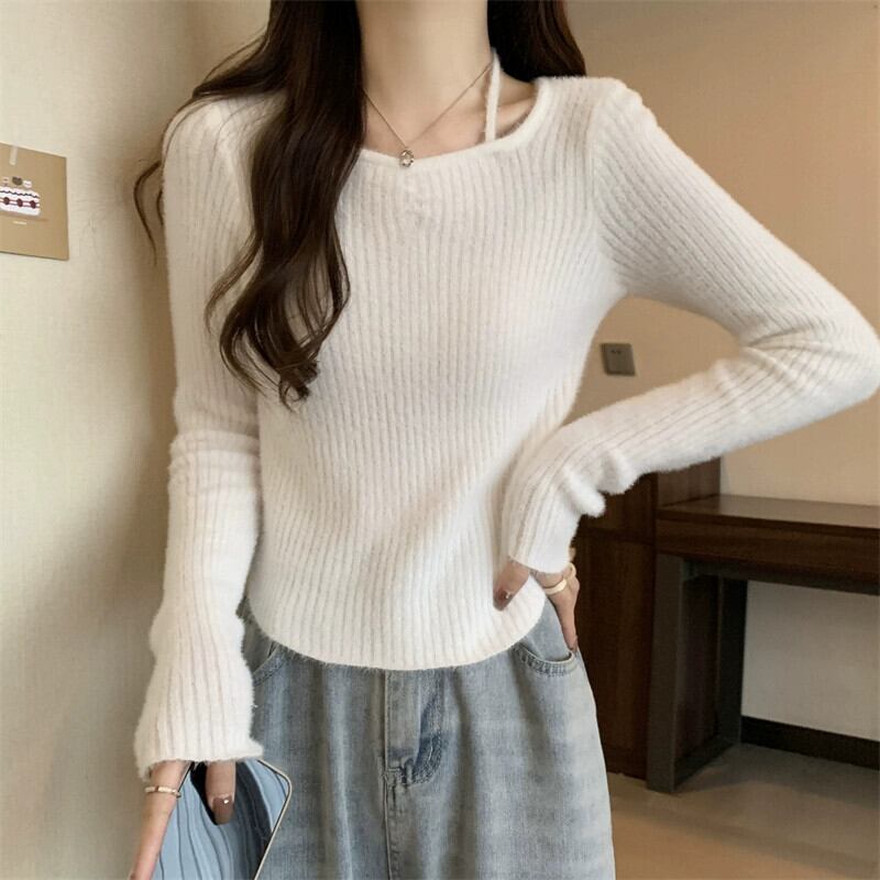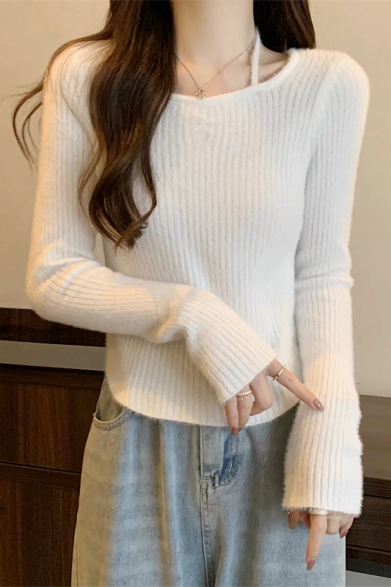 スリムフィットデザインと不規則な曲線の長袖ニットセーターを備えた秋と冬の厚みのあるホルターネックショートボトムシャツ女性 ロング オータム 秋物 ウィンター 冬物 7460026195312322 | framboise21