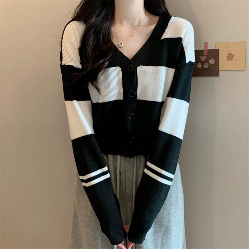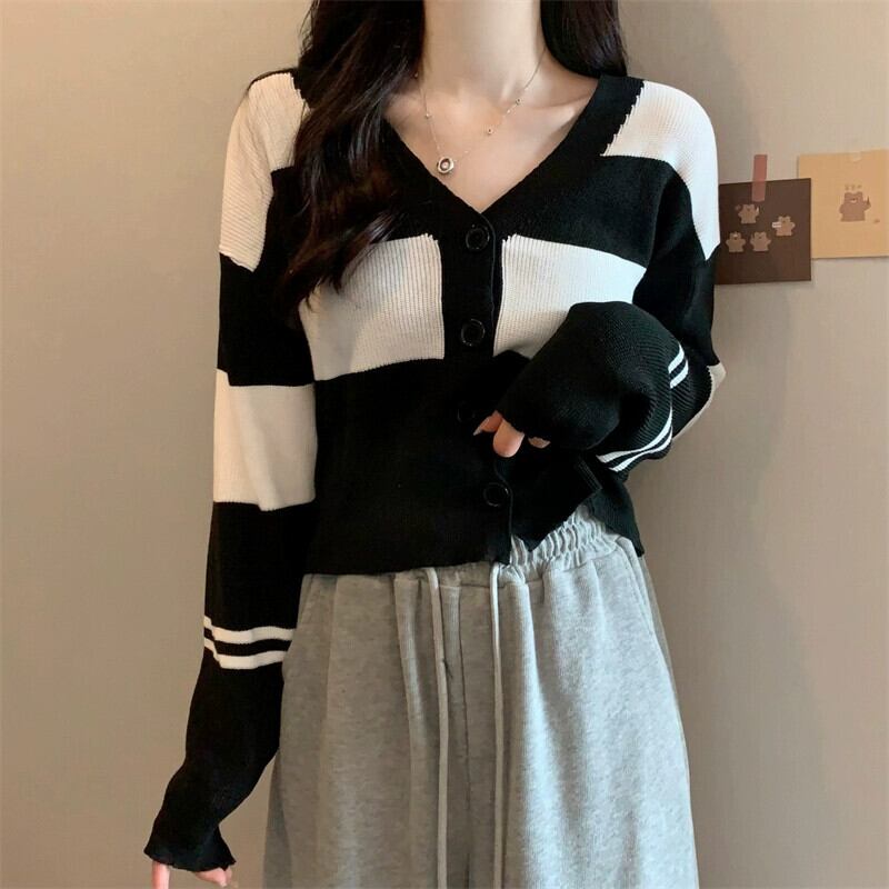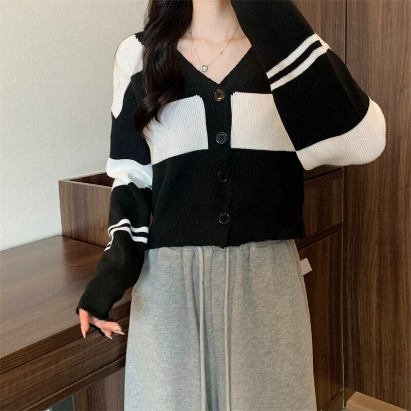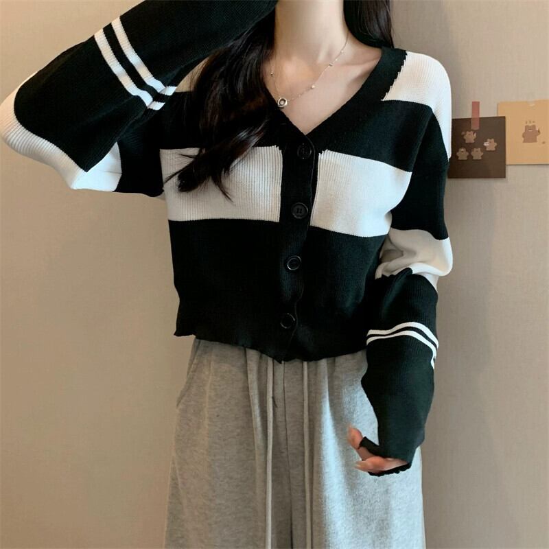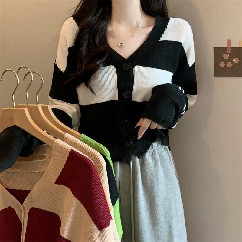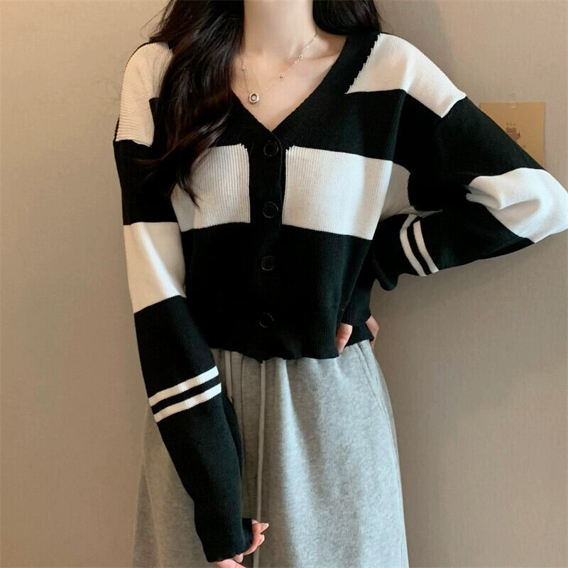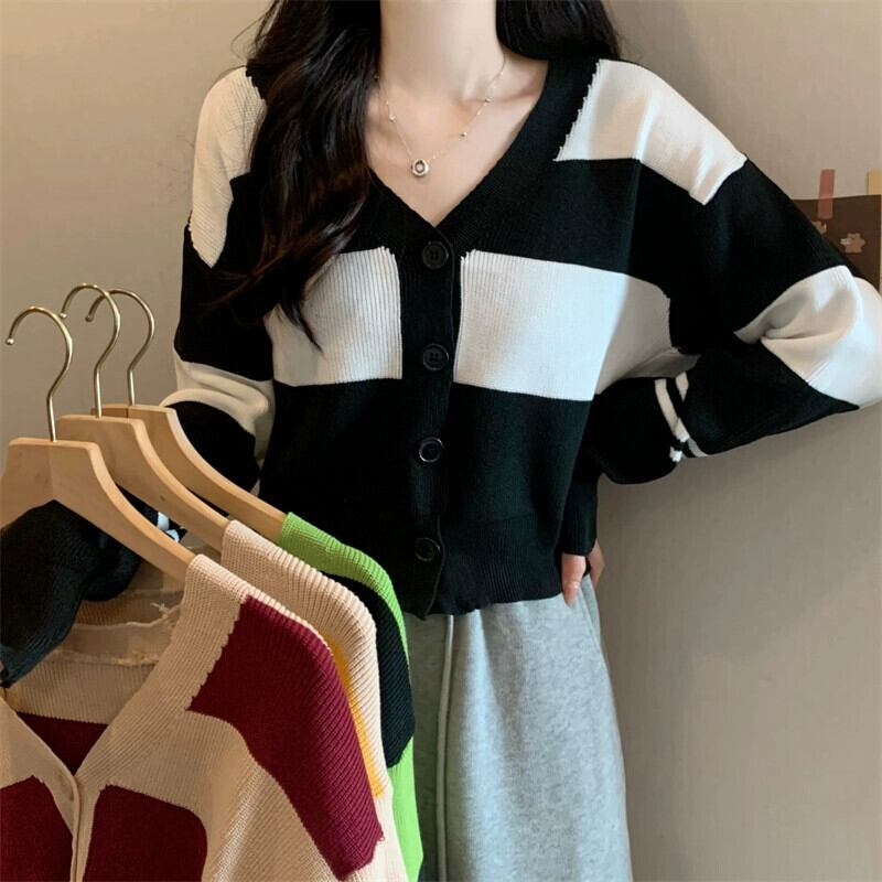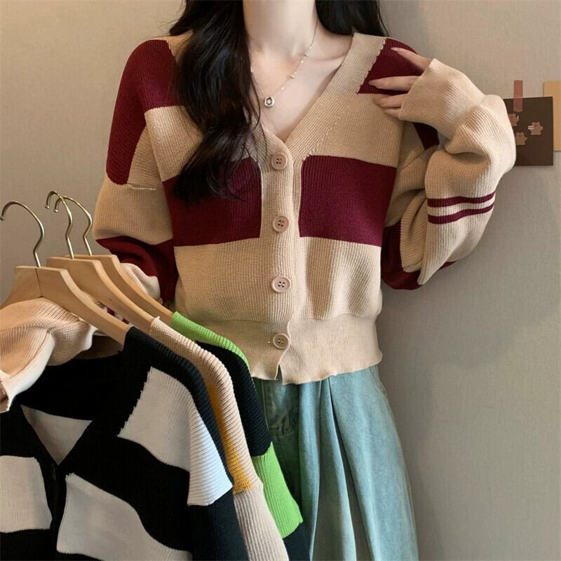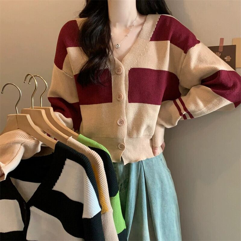 ストライプ V ネックカーディガンセータージャケット女性秋と冬レトロ怠惰なルーズアウターウェアコントラストカラーショートセーター オータム 秋物 ウィンター 冬物 Vネック 7460083536709530 | framboise21