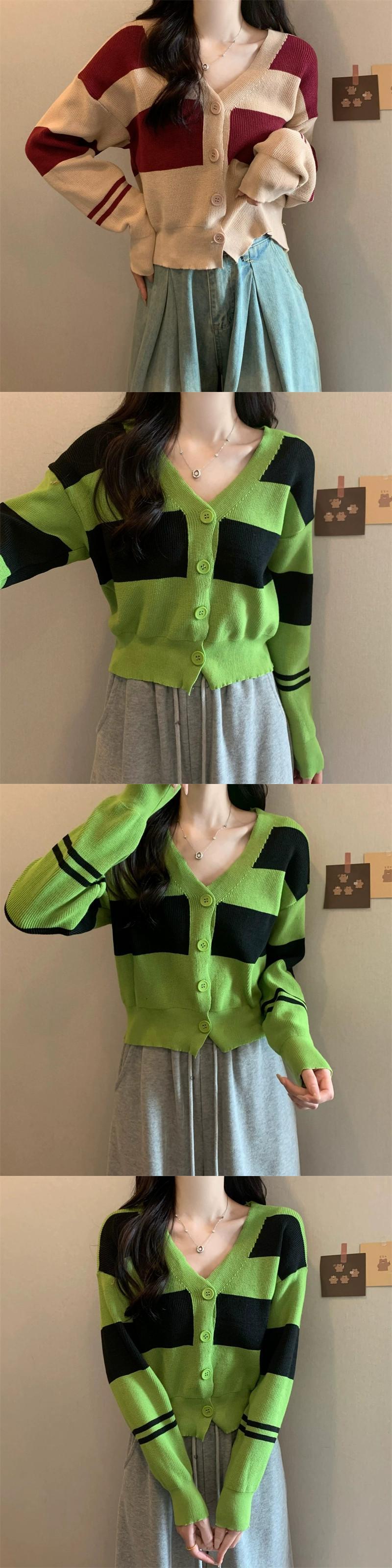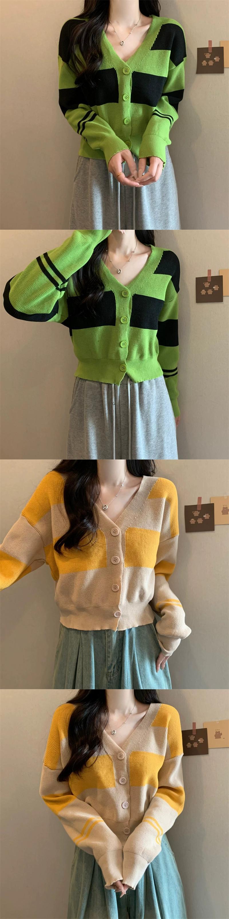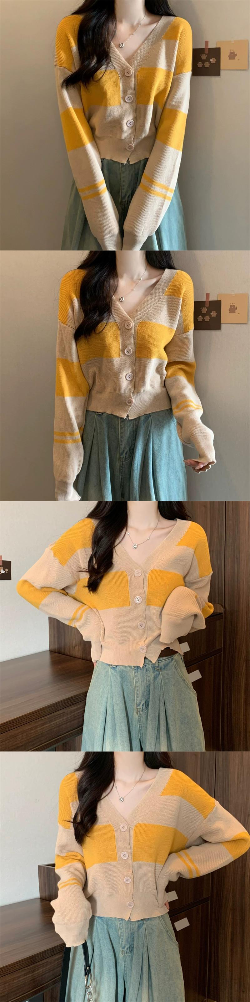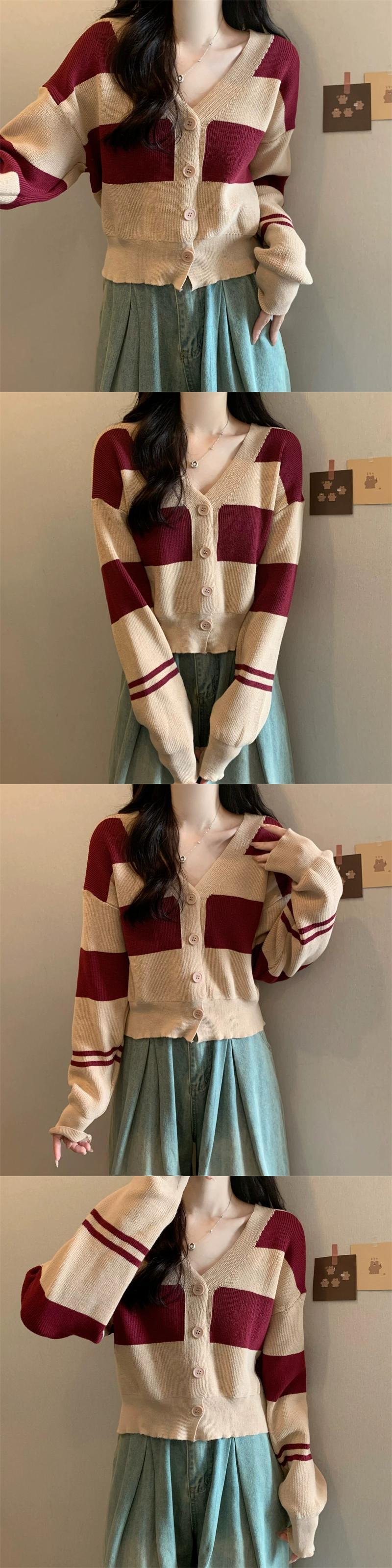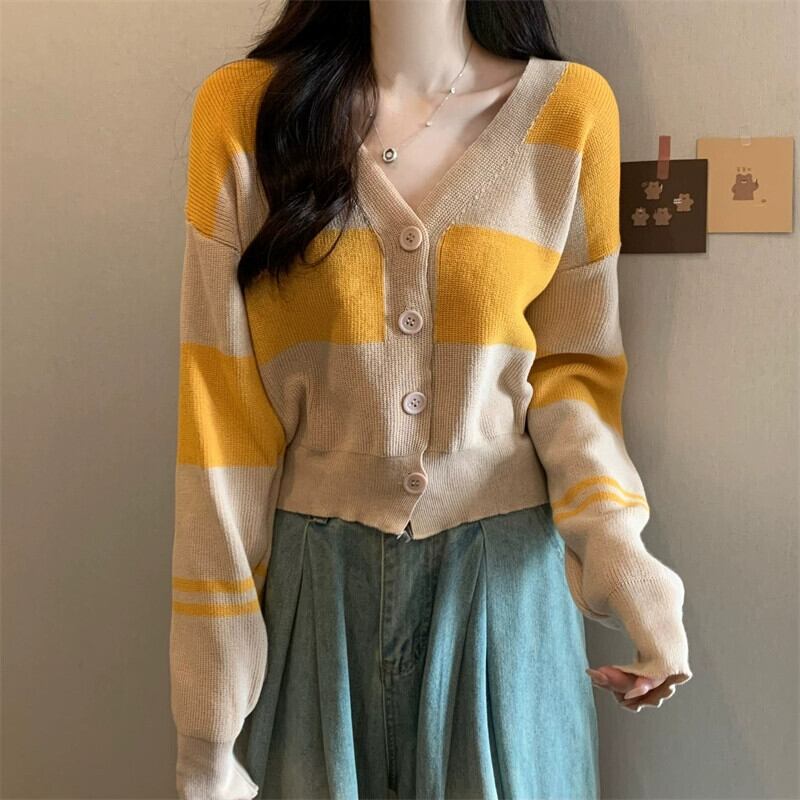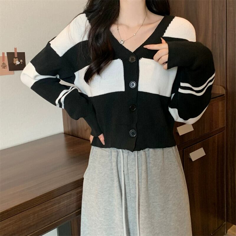 ストライプ V ネックカーディガンセータージャケット女性秋と冬レトロ怠惰なルーズアウターウェアコントラストカラーショートセーター オータム 秋物 ウィンター 冬物 Vネック 7460083536709530 | framboise21