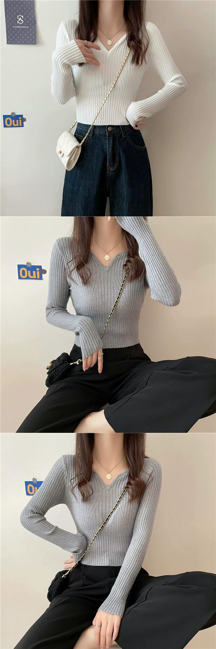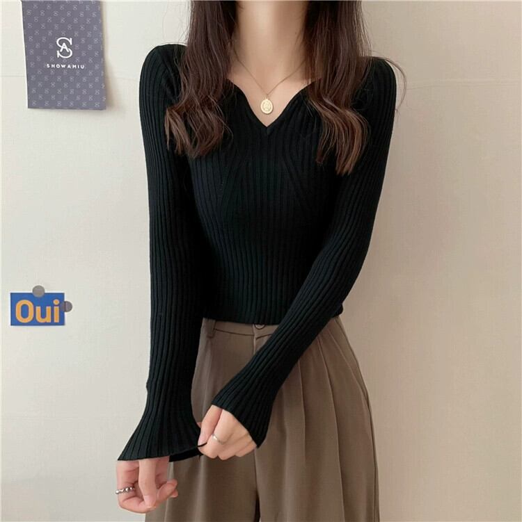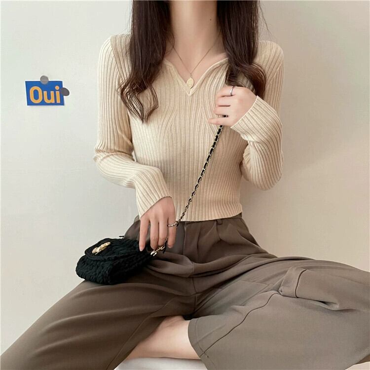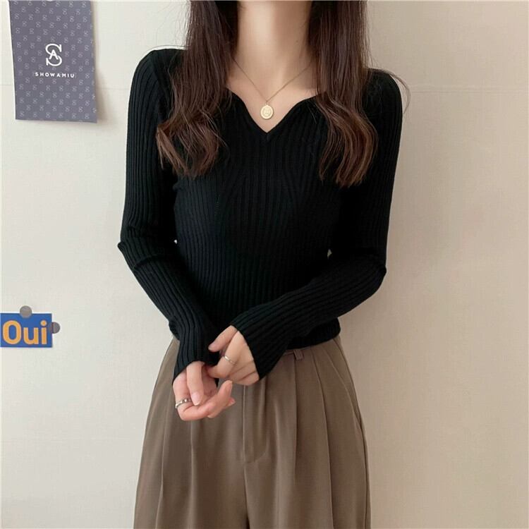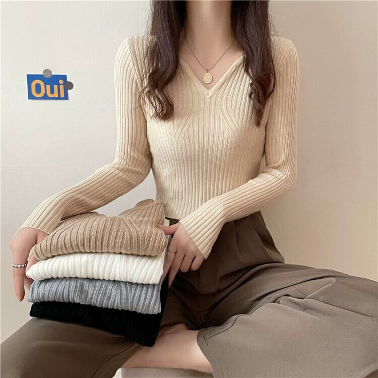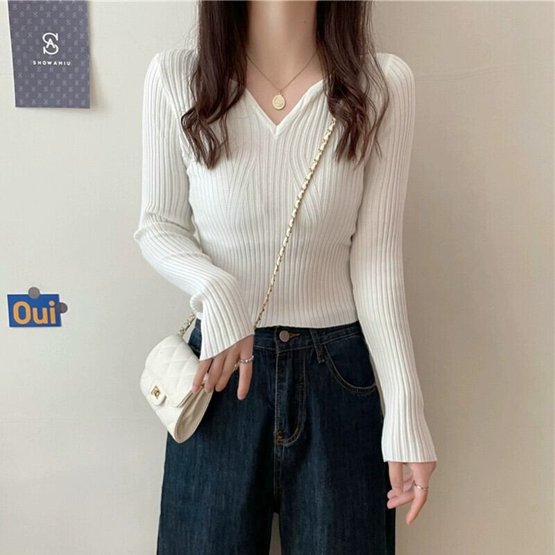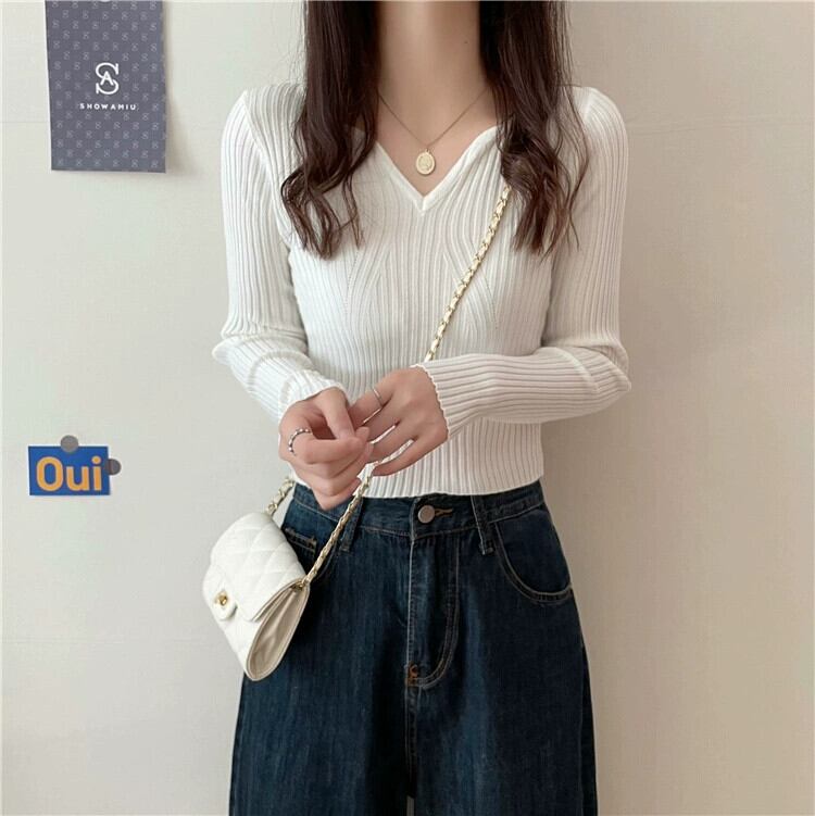 秋冬の白いVネックニットボトムシャツレディース、ファッショナブルでアインスタイルのインナーレイヤー、伸縮性のあるスリムフィット、短い長袖セーター ショート ロング ホワイト エラスティック オータム 秋物 ウィンター 冬物 7460054884448119 | framboise21