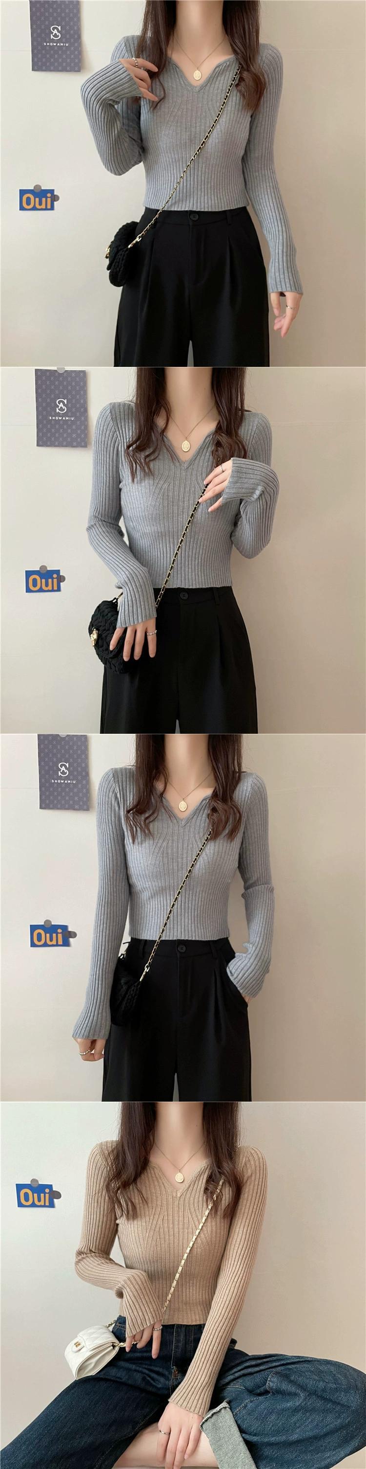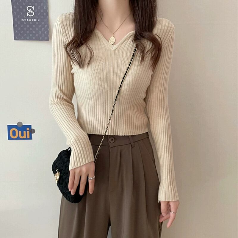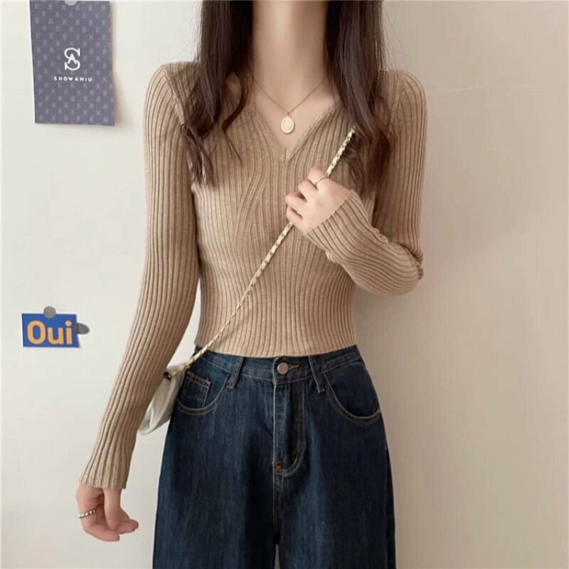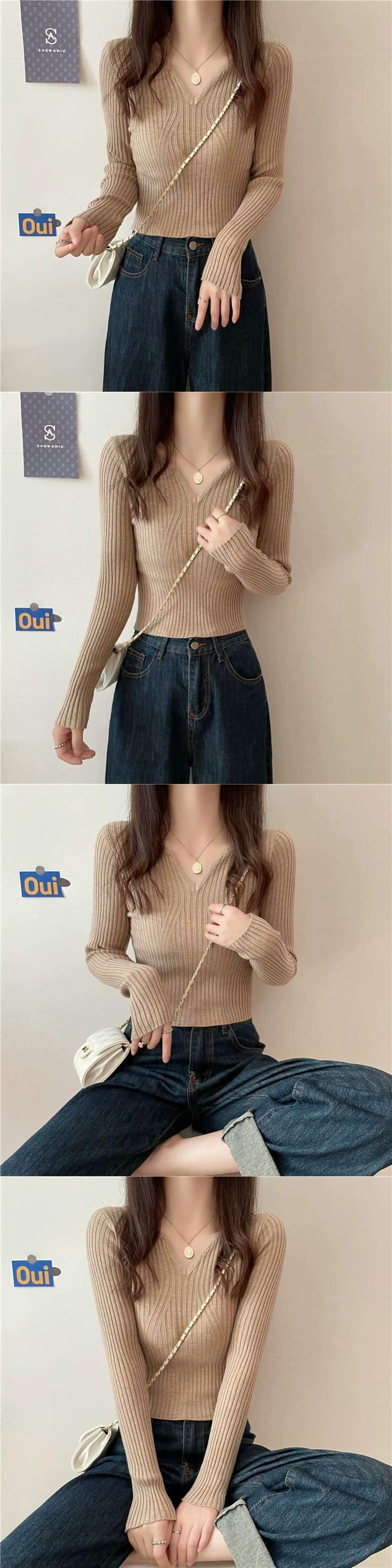 秋冬の白いVネックニットボトムシャツレディース、ファッショナブルでアインスタイルのインナーレイヤー、伸縮性のあるスリムフィット、短い長袖セーター ショート ロング ホワイト エラスティック オータム 秋物 ウィンター 冬物 7460054884448119 | framboise21