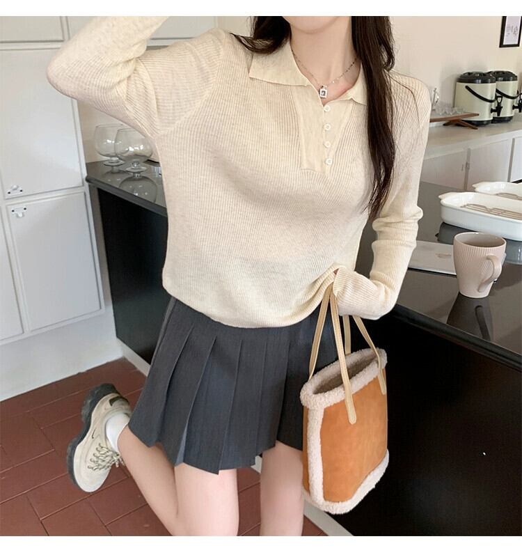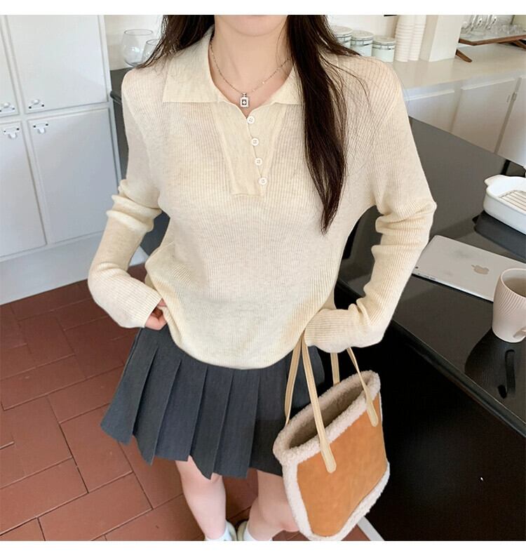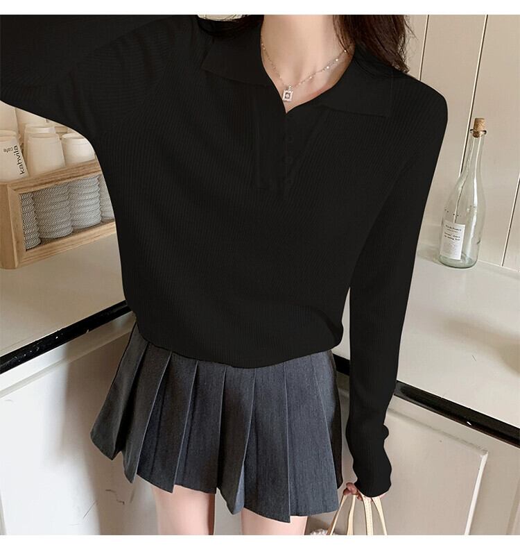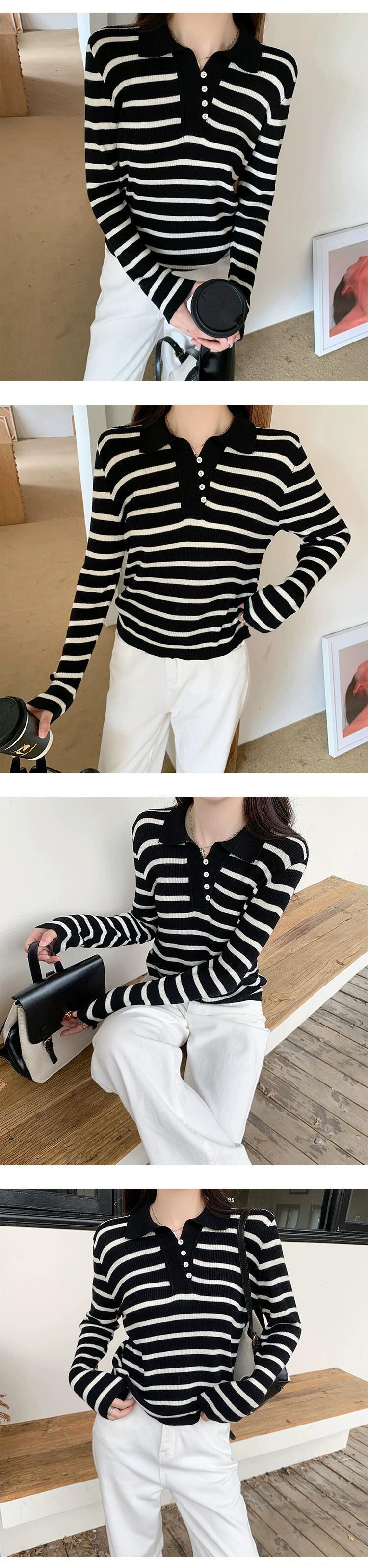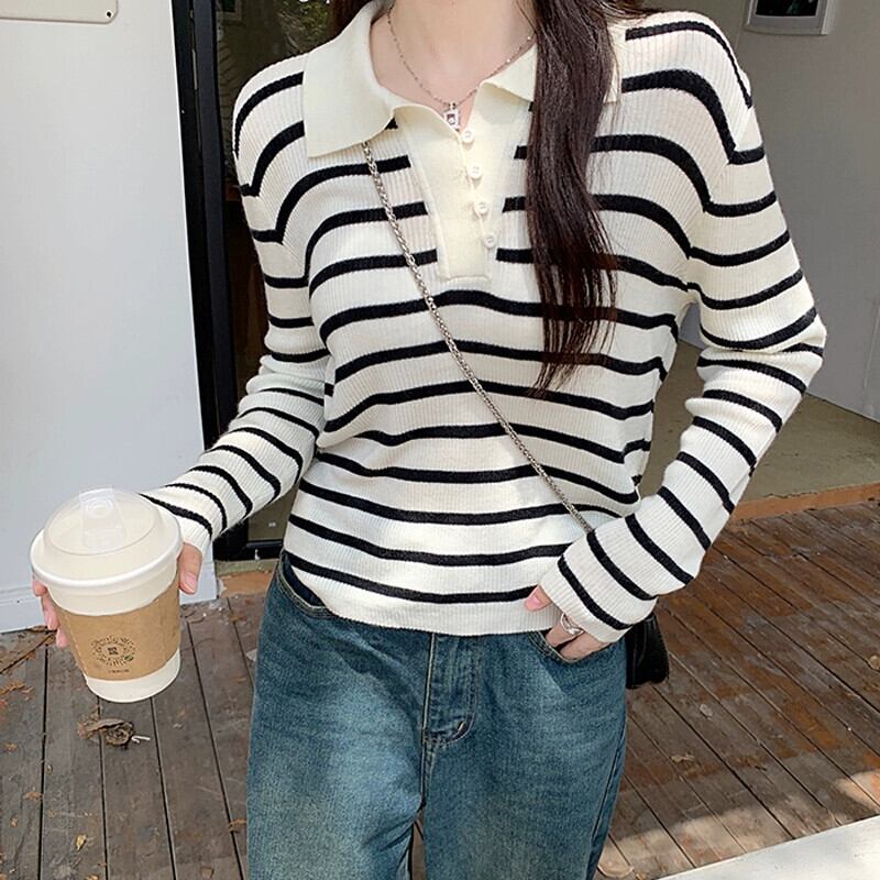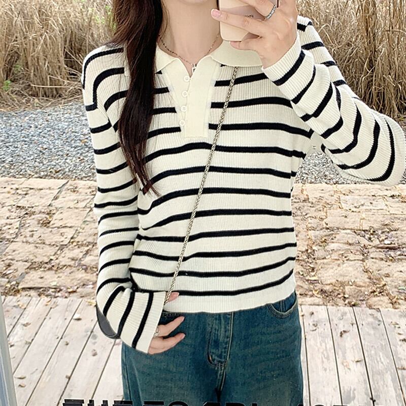 ゆるくてスリムな半袖コントラストストライプのセーターを備えた秋と冬のポロラペルニットボトミングシャツの女性 オータム 秋物 ウィンター 冬物 7460064914043451 | framboise21