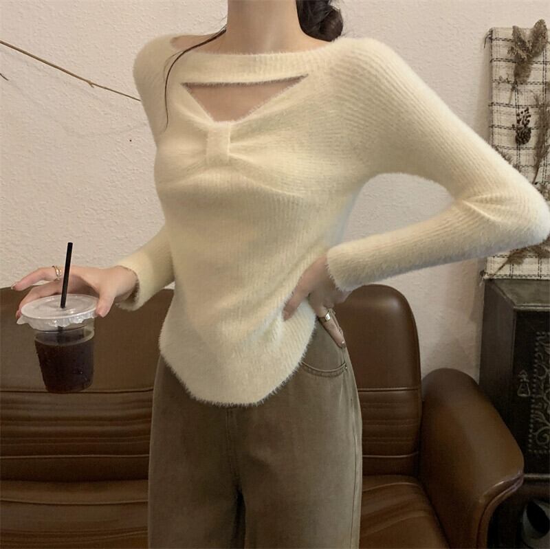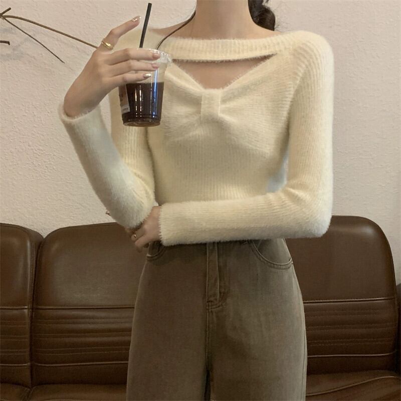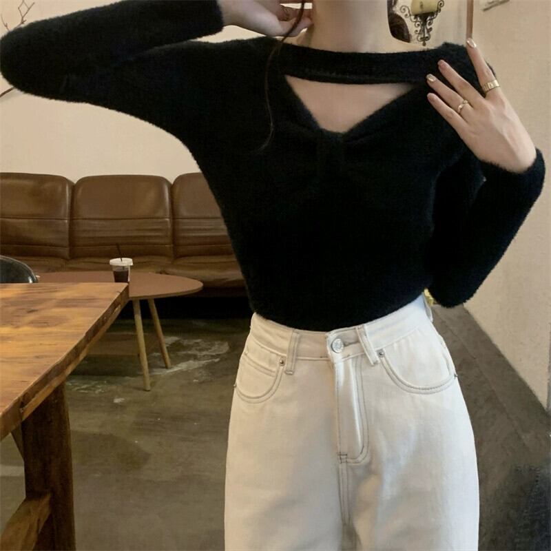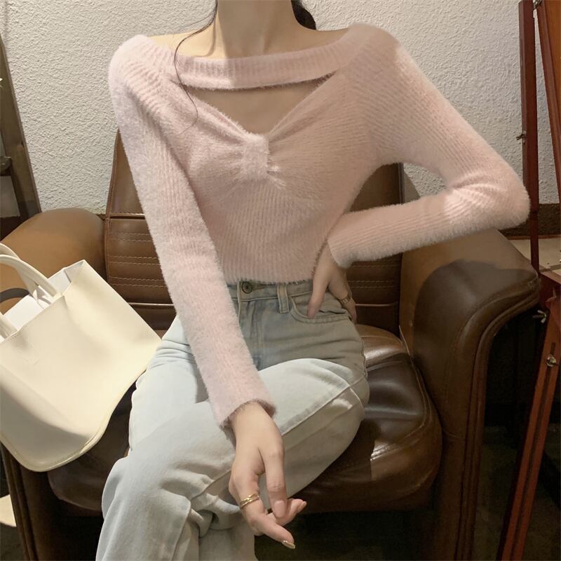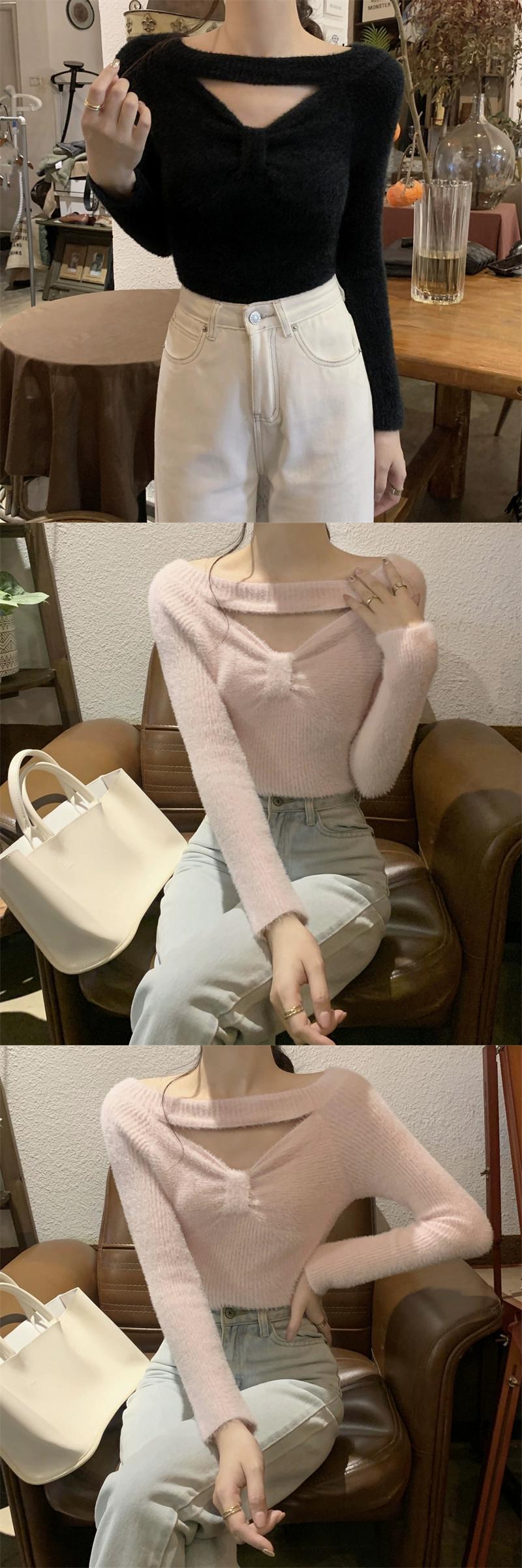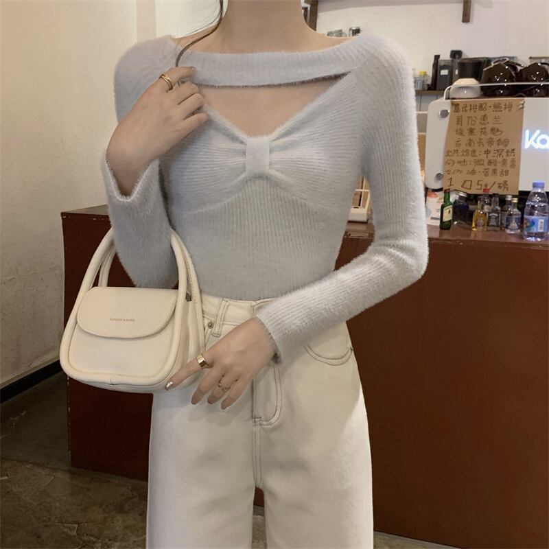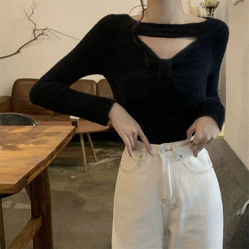 秋と冬の中空Vネックボトリングシャツ女性、ミンクベルベットセーター、ファッショナブルで西洋風のスリムショート長袖セーター ロング オータム 秋物 ウィンター 冬物 746004039933171 | framboise21