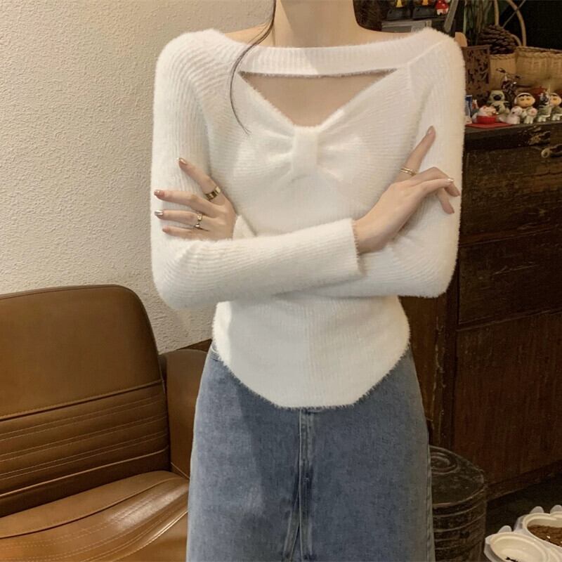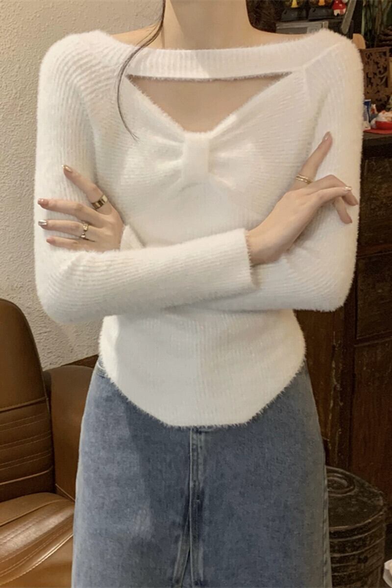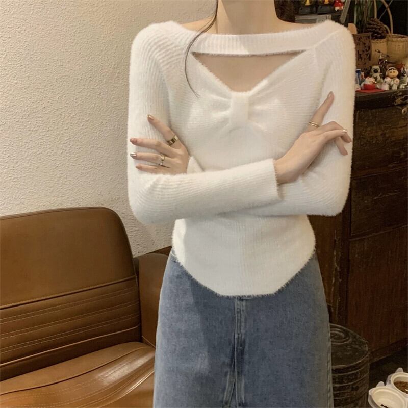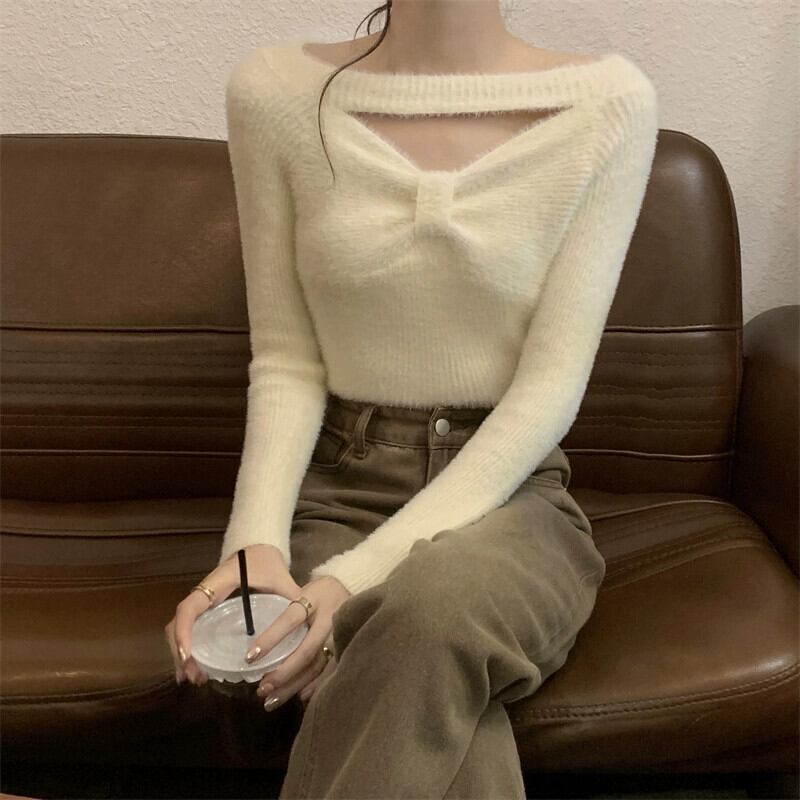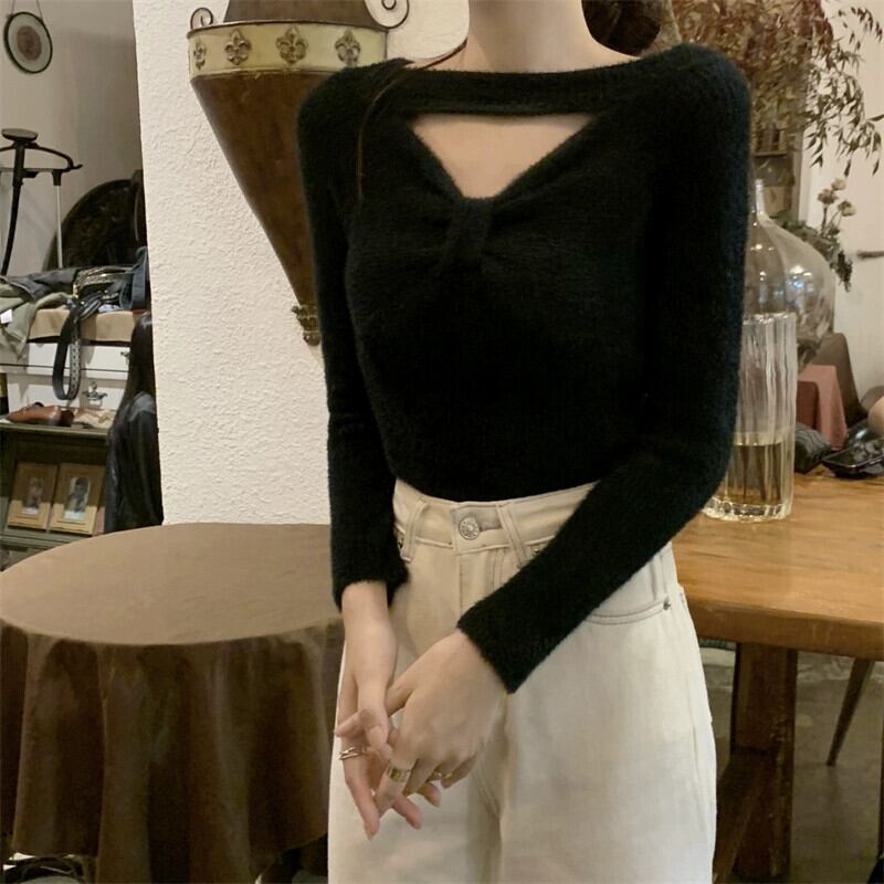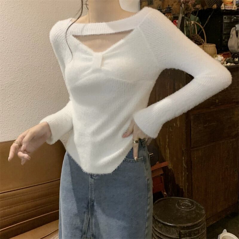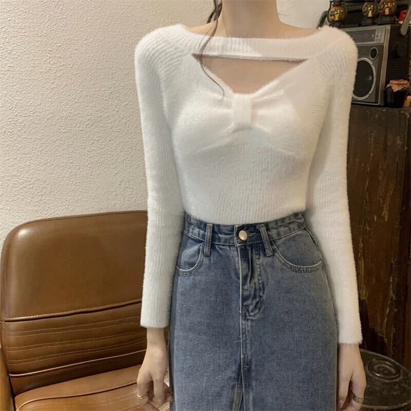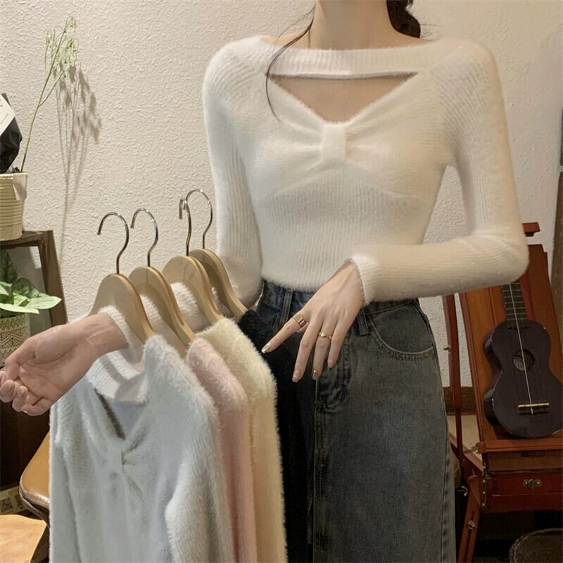 秋と冬の中空Vネックボトリングシャツ女性、ミンクベルベットセーター、ファッショナブルで西洋風のスリムショート長袖セーター ロング オータム 秋物 ウィンター 冬物 746004039933171 | framboise21