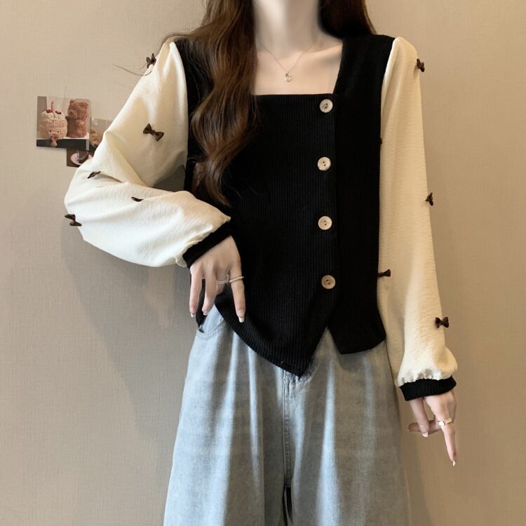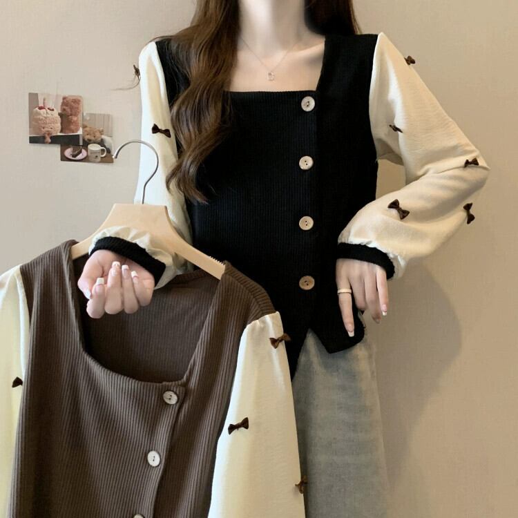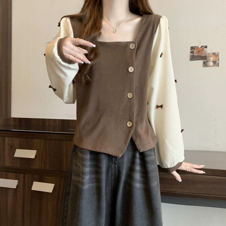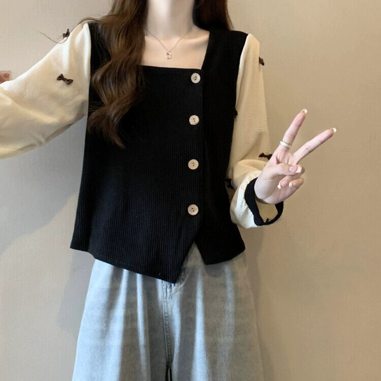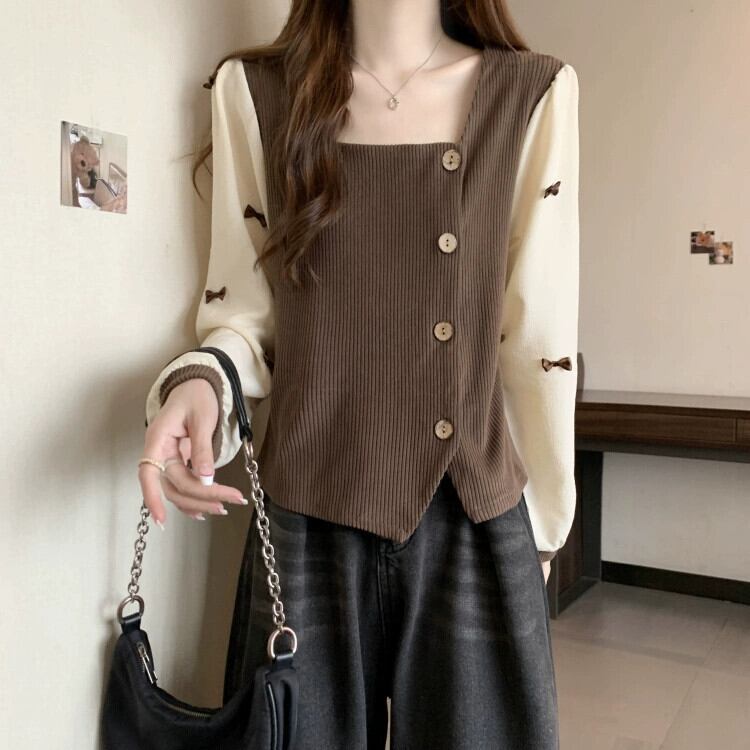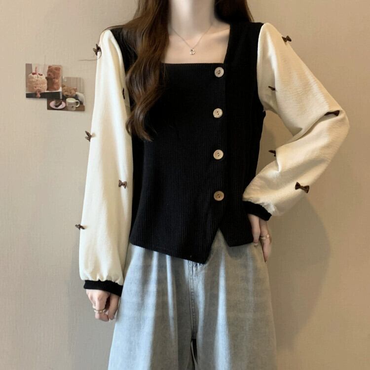 不規則なスクエアネックボトミングシャツの女性、秋と冬のインナーリボン付きフレンチスタイルのリボンセーター、スリムフィット、長袖セーター ロング オータム 秋物 ウィンター 冬物 スクウェア 7460094454496396 | framboise21