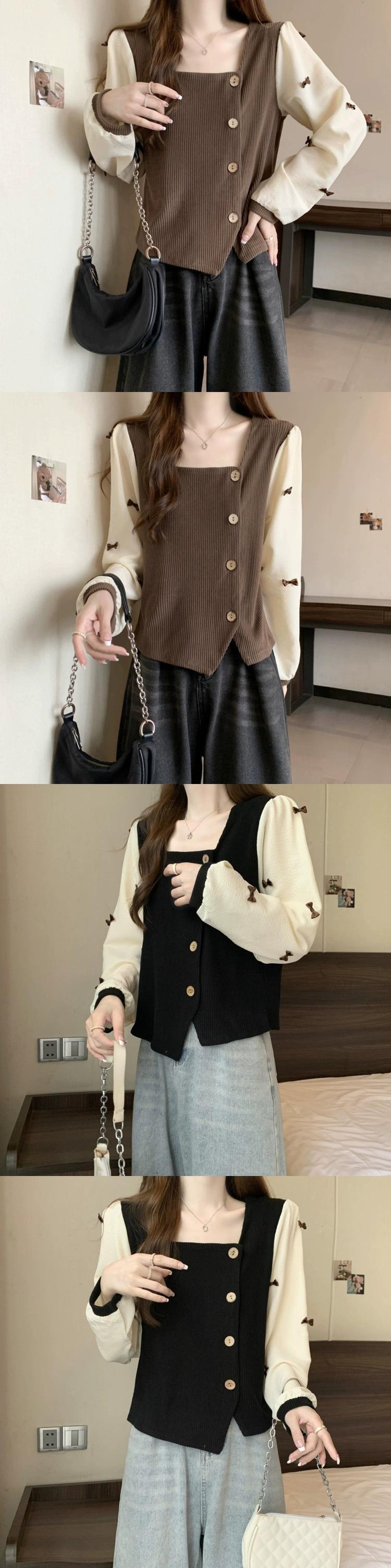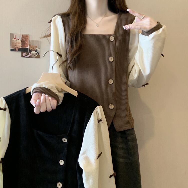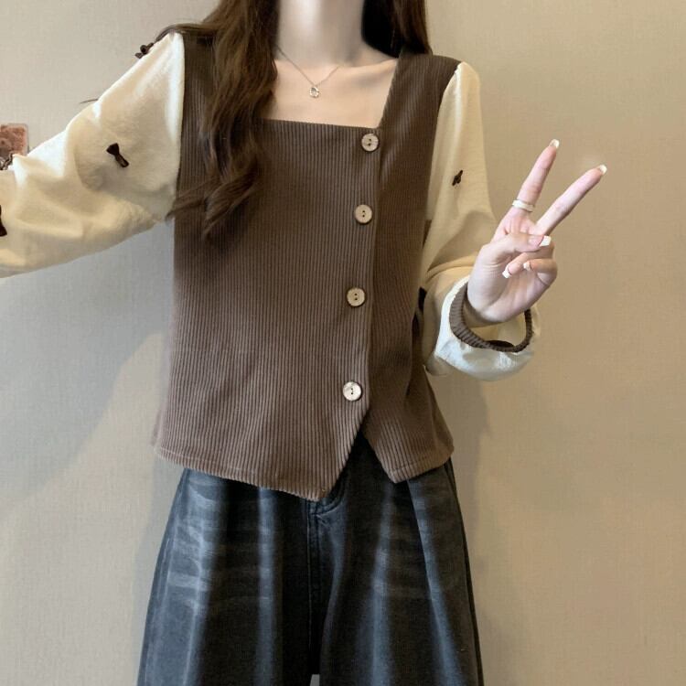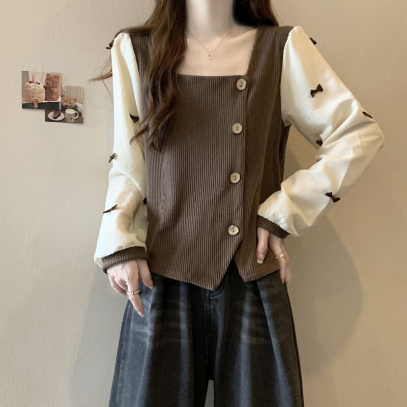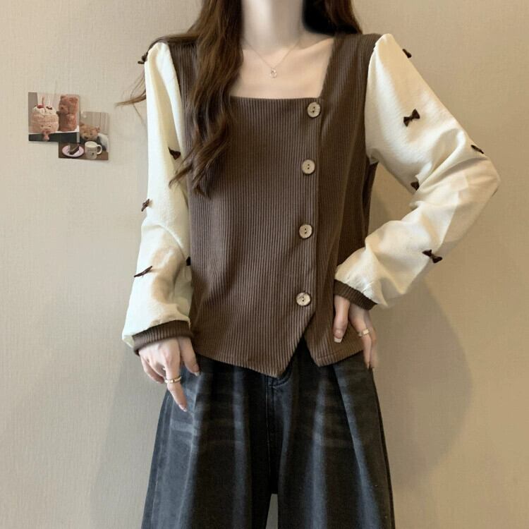 不規則なスクエアネックボトミングシャツの女性、秋と冬のインナーリボン付きフレンチスタイルのリボンセーター、スリムフィット、長袖セーター ロング オータム 秋物 ウィンター 冬物 スクウェア 7460094454496396 | framboise21