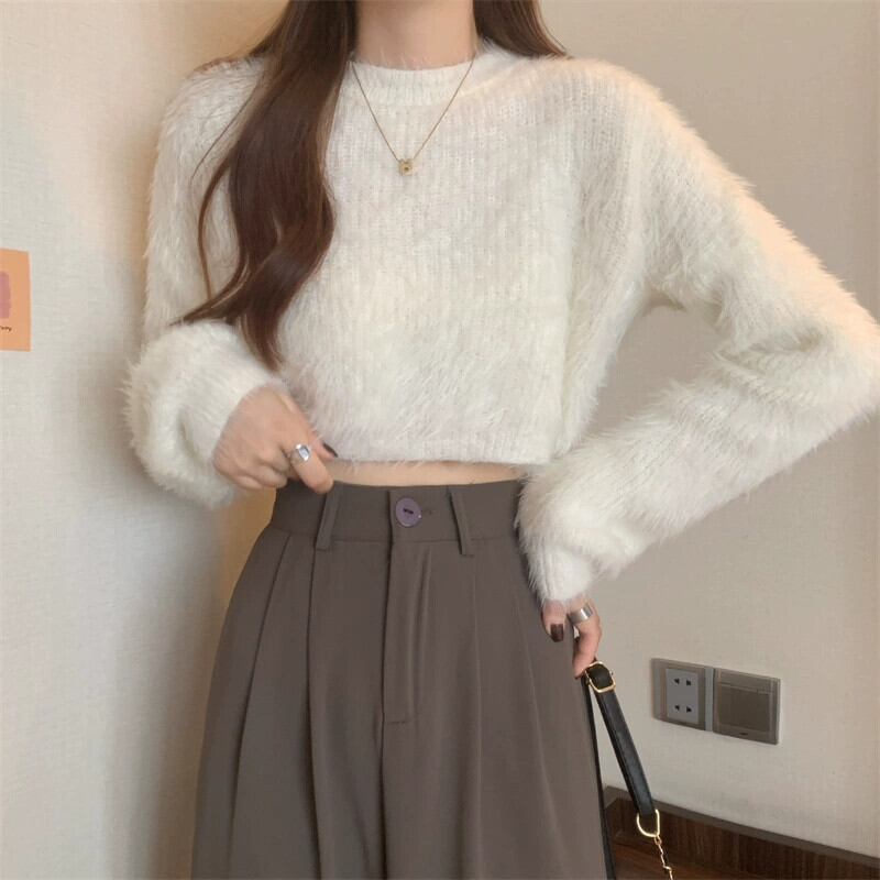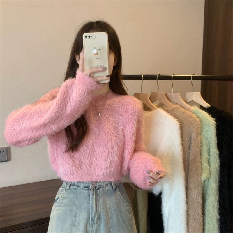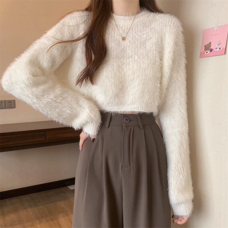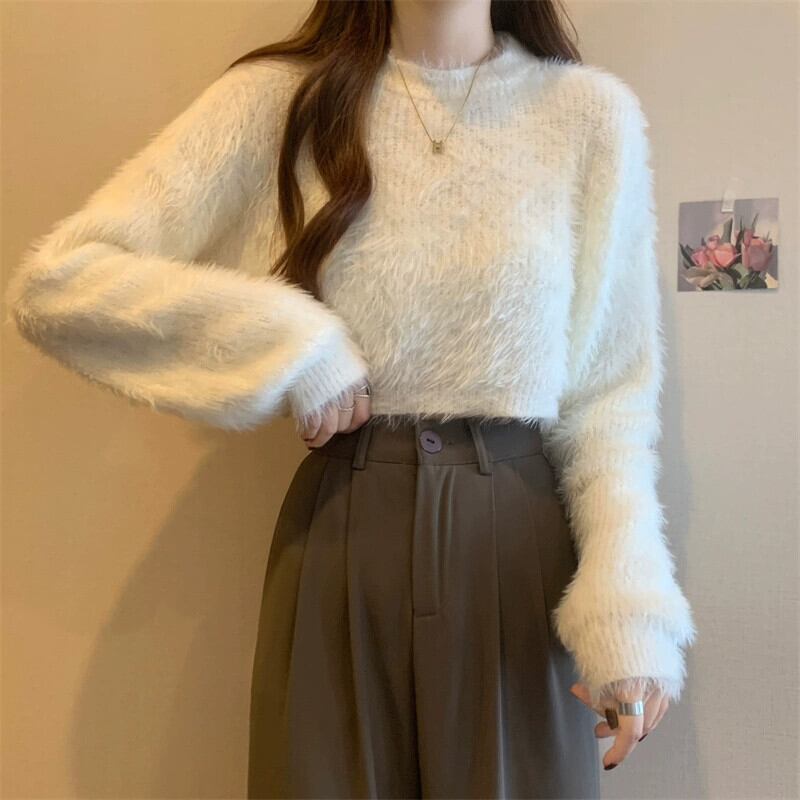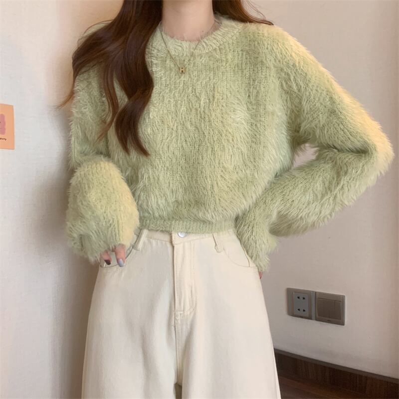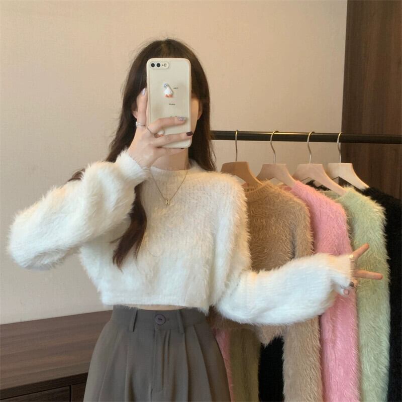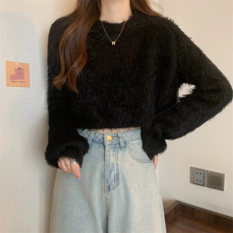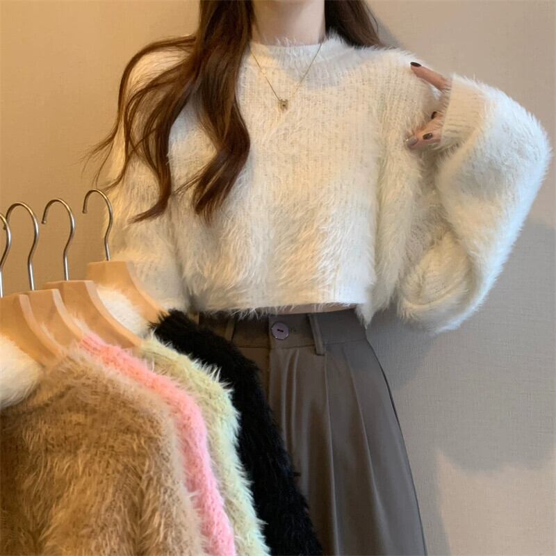 ソフトワックス状模造ミンクベルベットモヘアセーター女性秋と冬フランスルーズアウターウェア小さなハイウエストショートセーター ハイウェスト オータム 秋物 ウィンター 冬物 7460085962717797 | framboise21