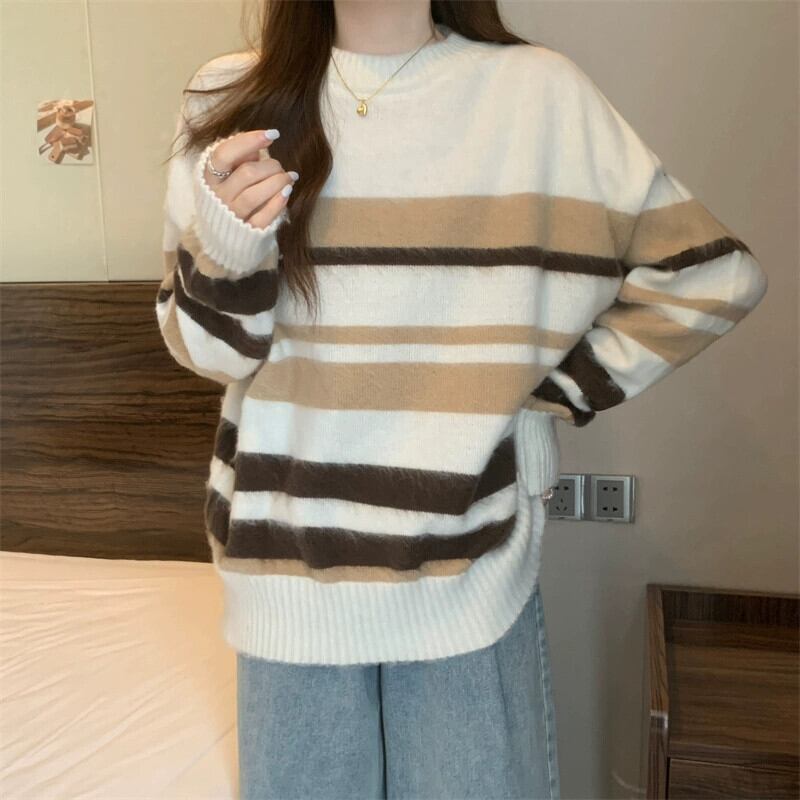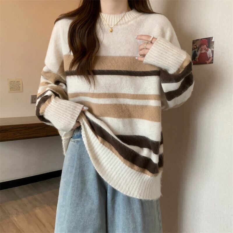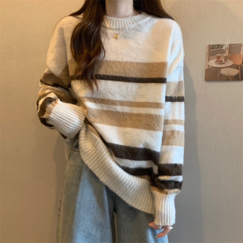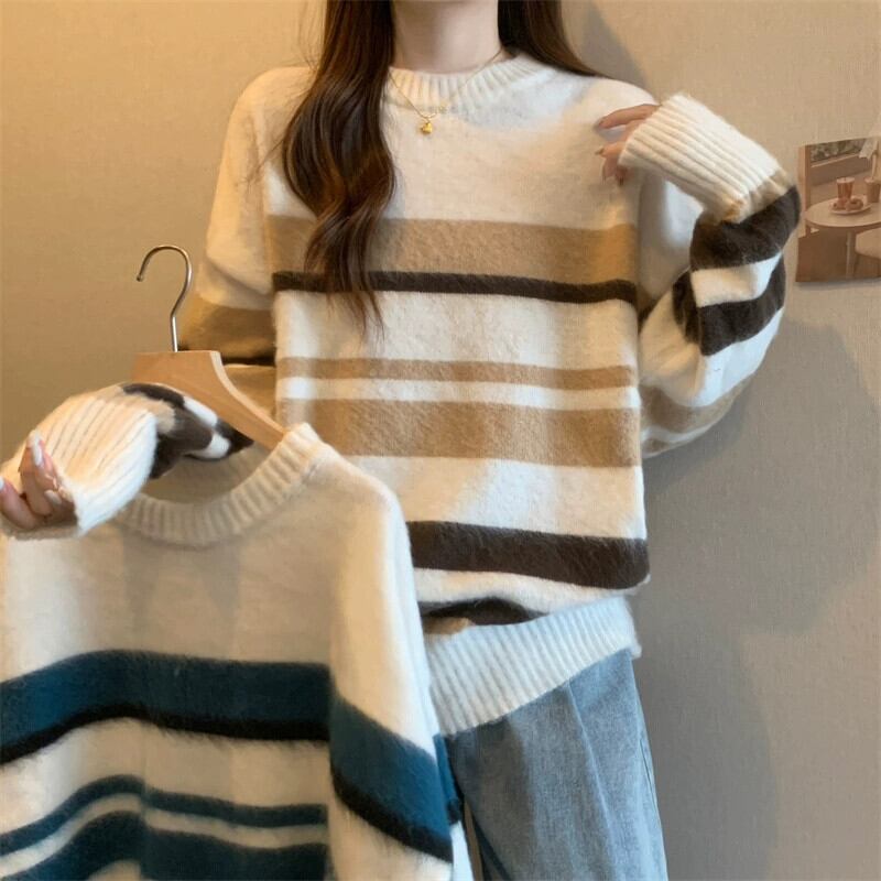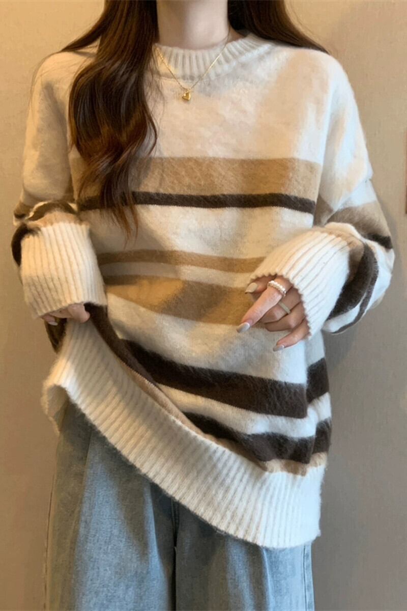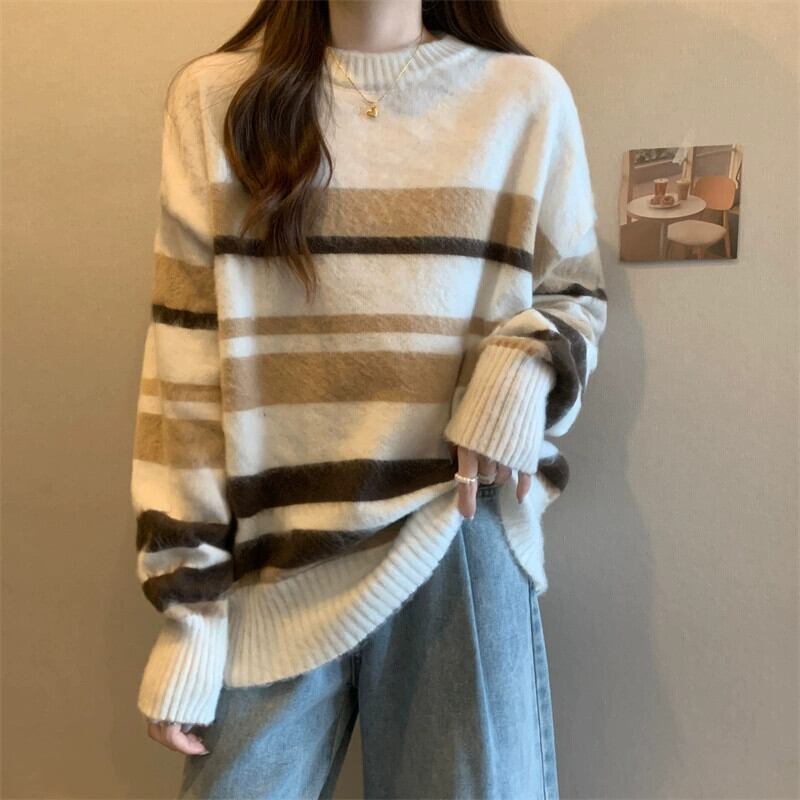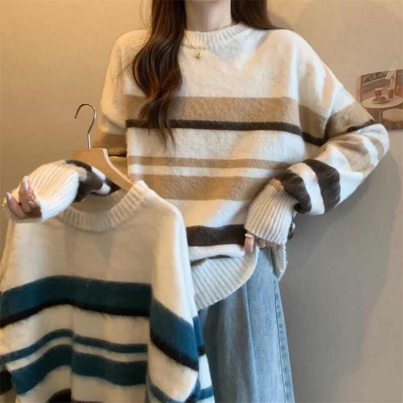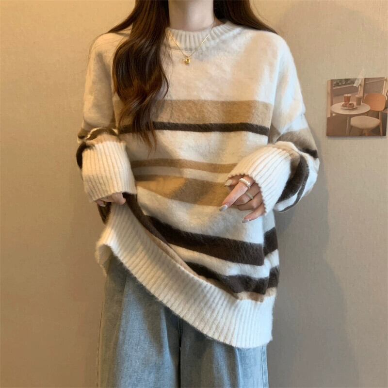 厚く柔らかいワックスのようなストライプのセーターの女性、秋と冬のスタイル、レトロな怠惰なスタイル、ゆったりとしたアウターウェア、多用途のプルオーバーセーター オータム 秋物 ウィンター 冬物 7460050845428682 | framboise21