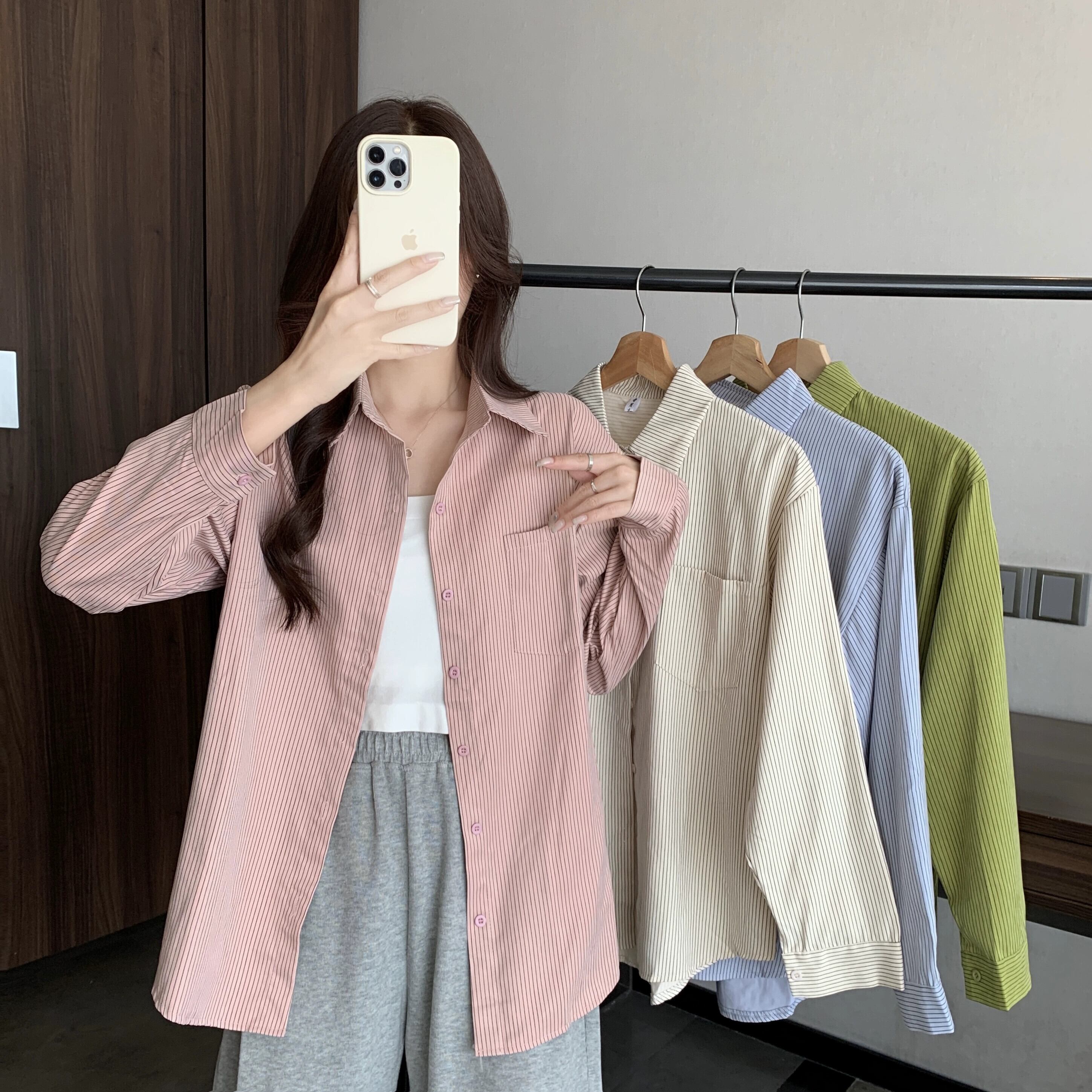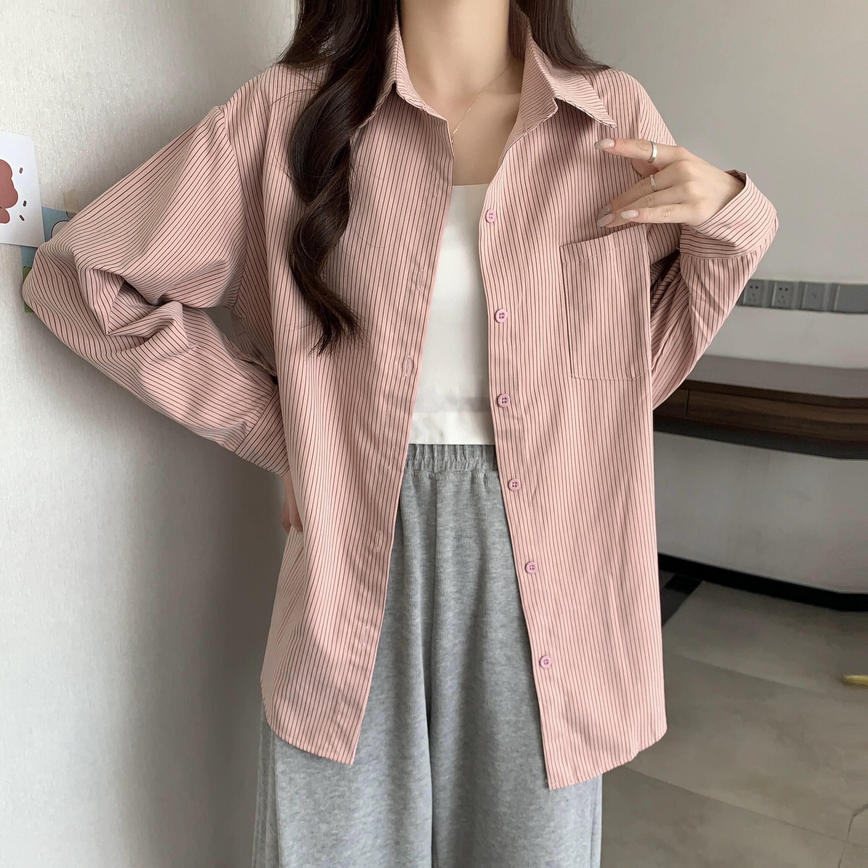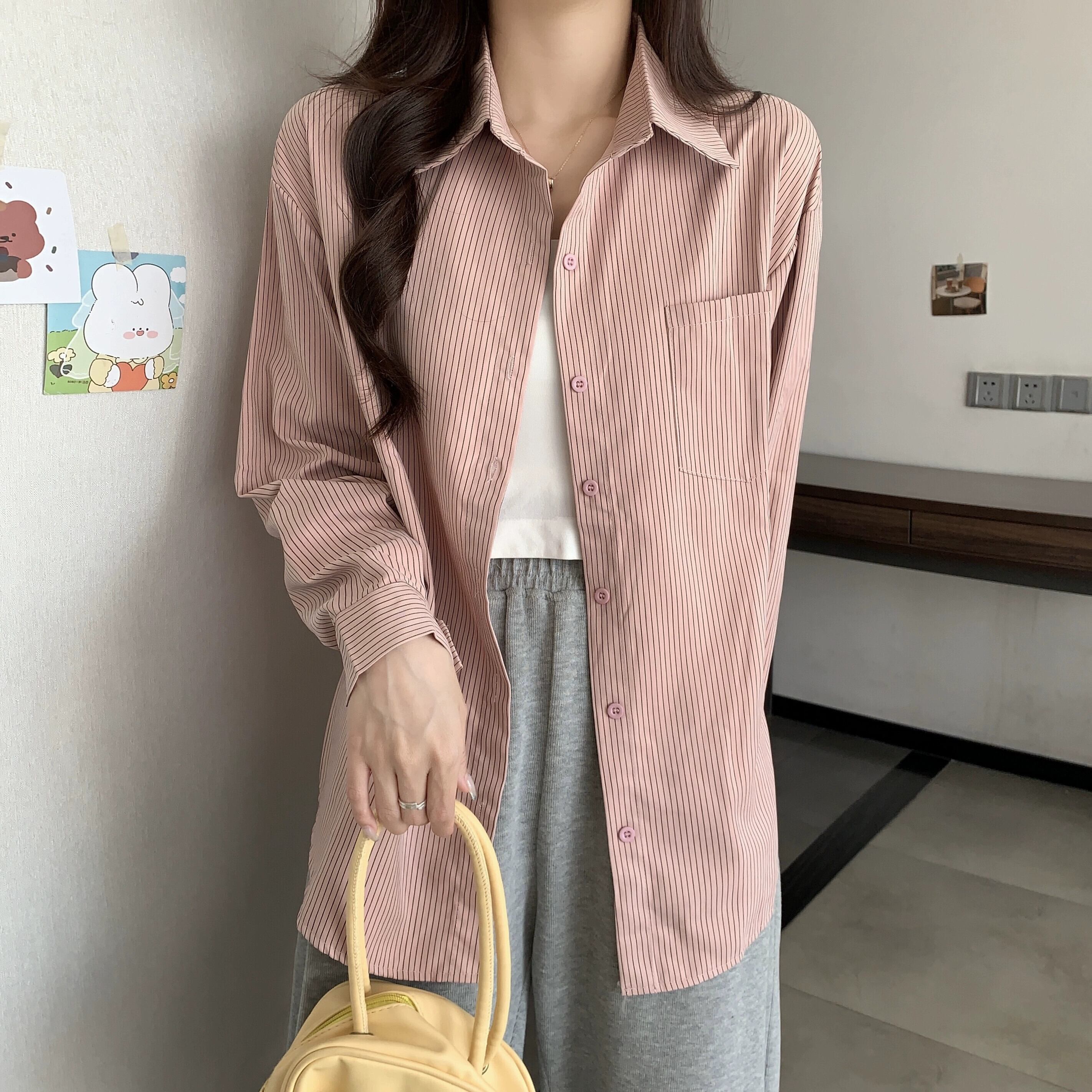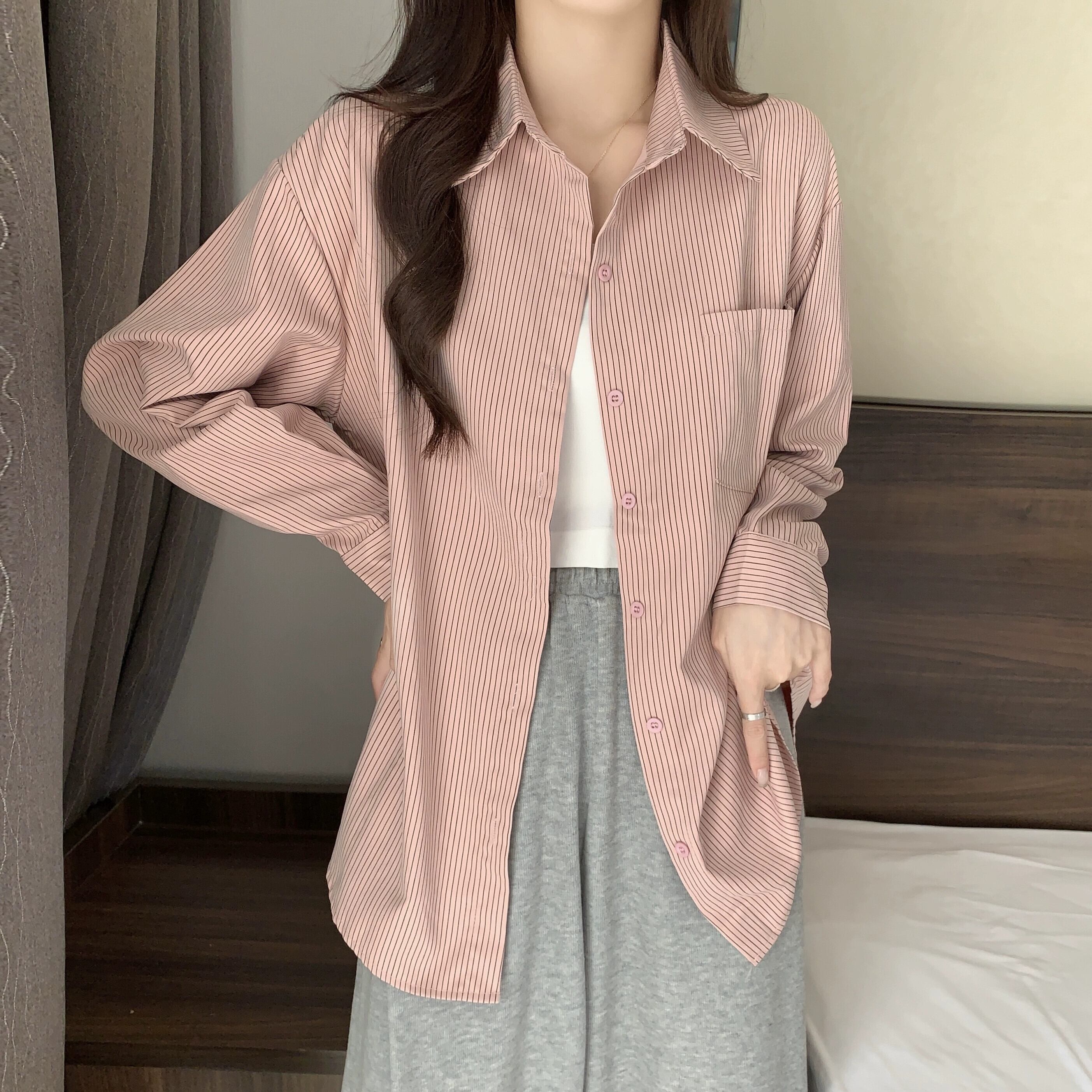 ストライプのミドル丈シャツジャケットの女性、春と秋のデザイン、ゆったりとした怠惰なスタイル、レイヤード長袖トップ ロング レッド スプリング 春物 オータム 秋物 7460094625882010 | framboise21
