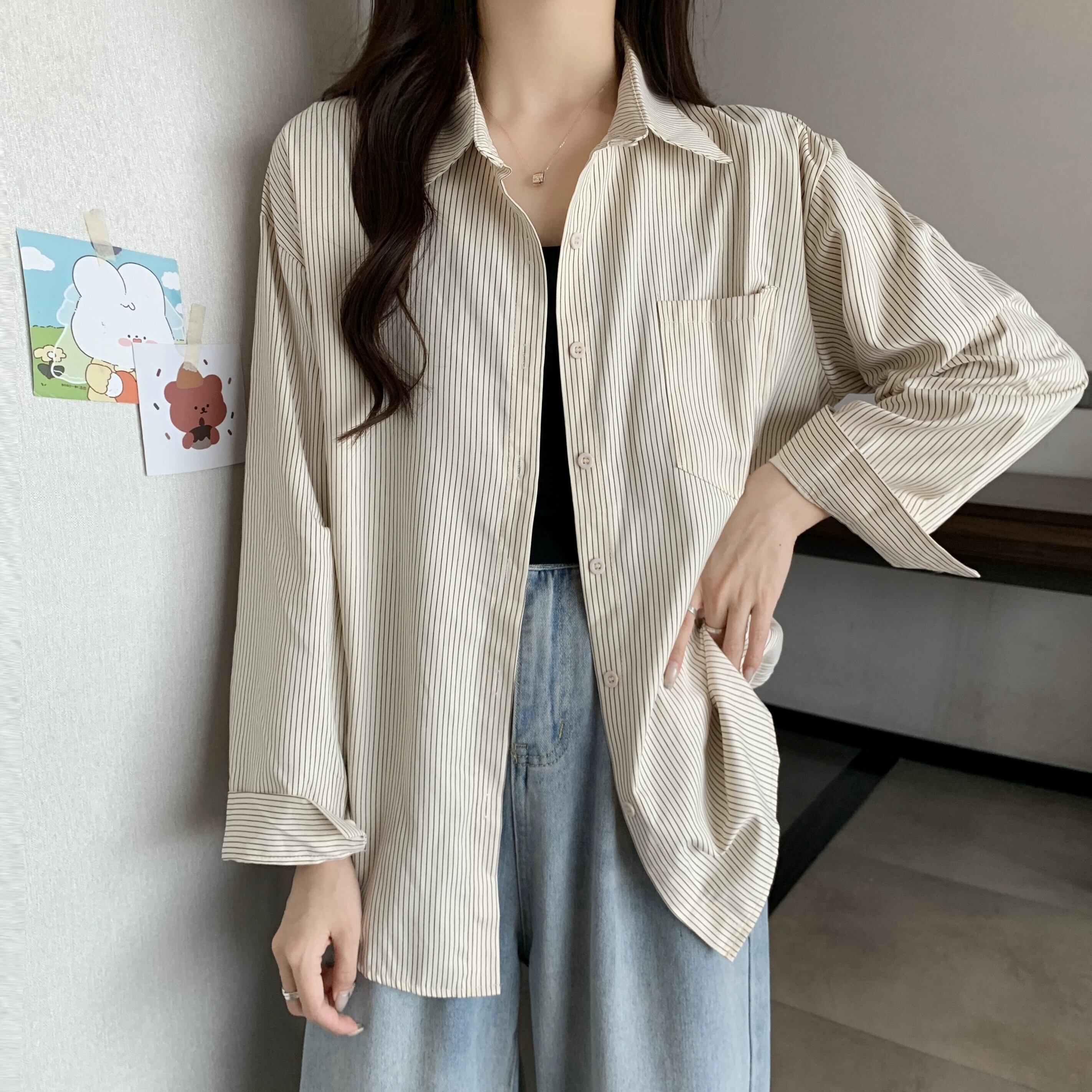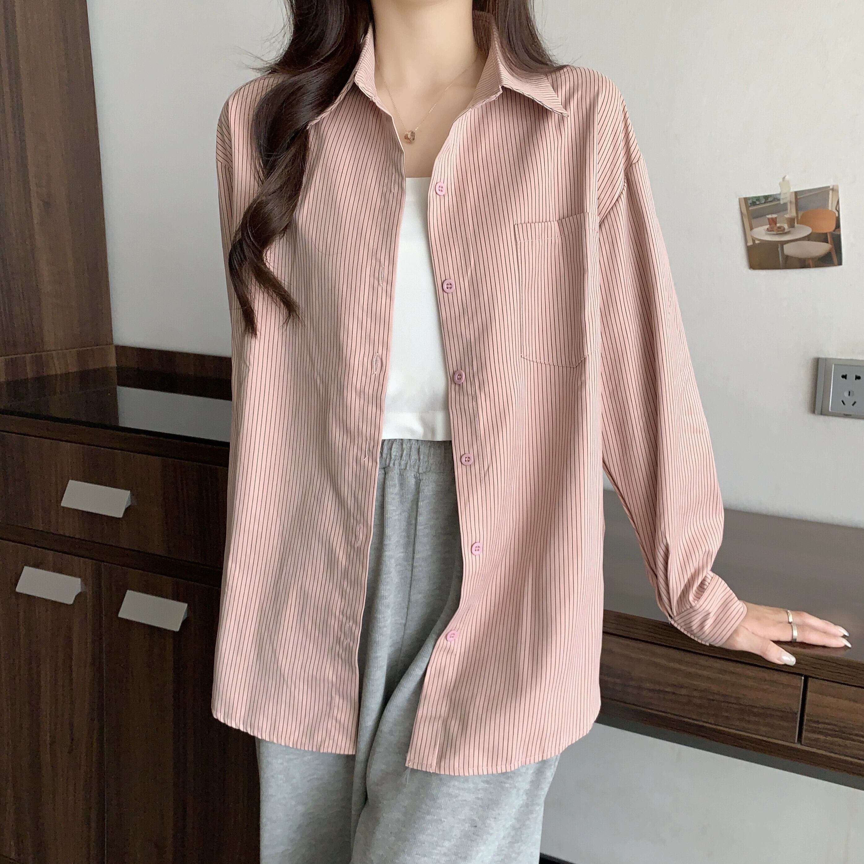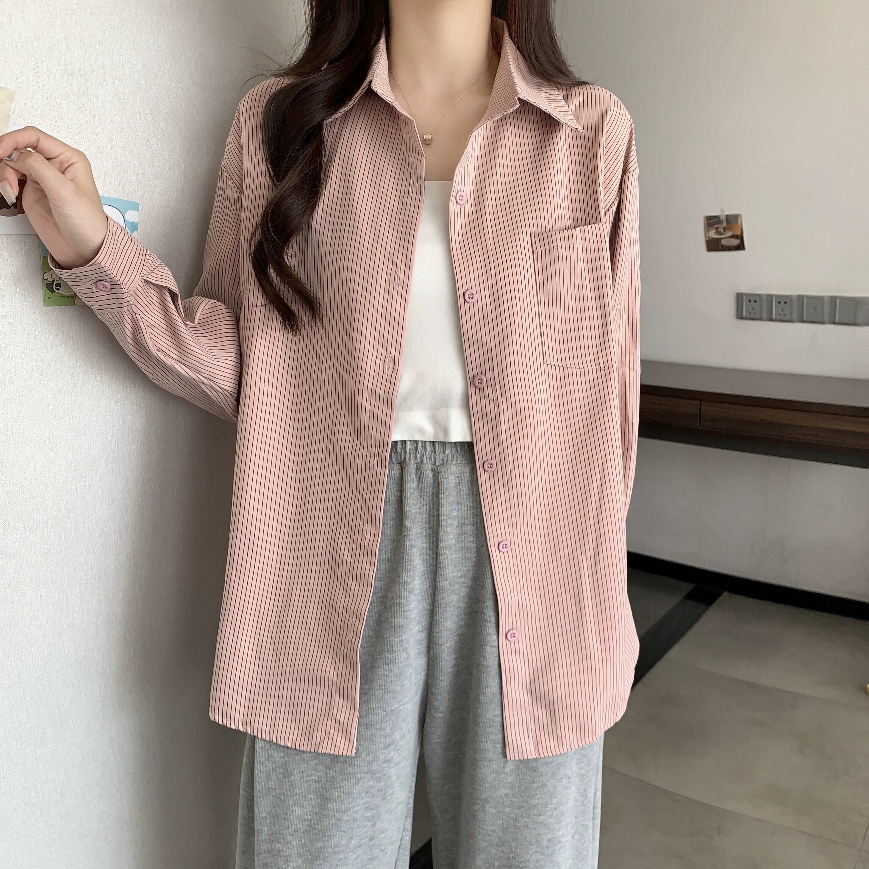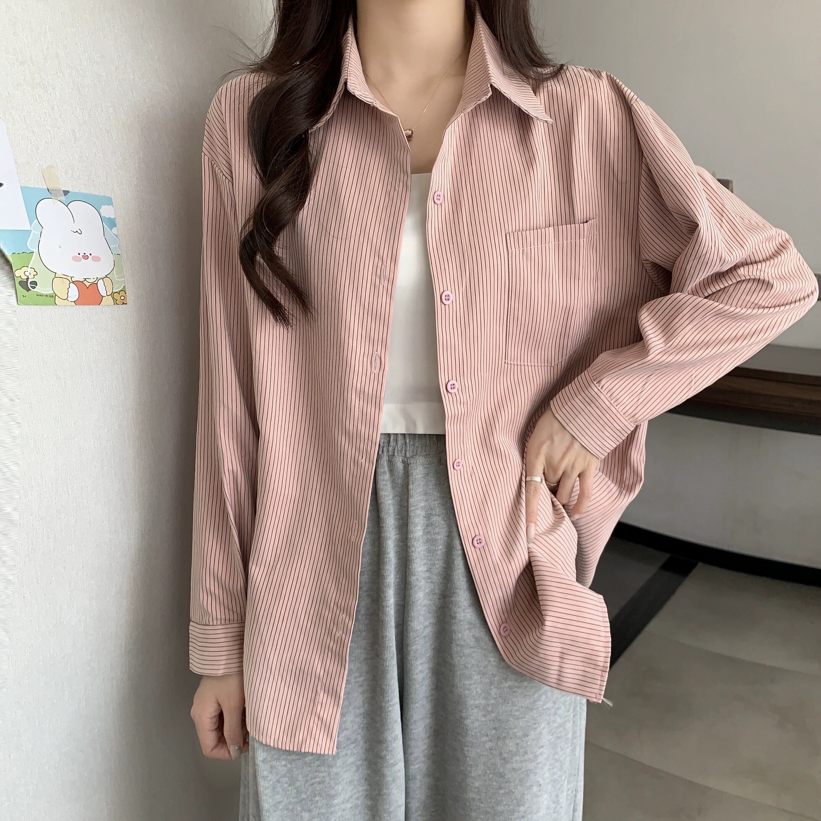 ストライプのミドル丈シャツジャケットの女性、春と秋のデザイン、ゆったりとした怠惰なスタイル、レイヤード長袖トップ ロング レッド スプリング 春物 オータム 秋物 7460094625882010 | framboise21