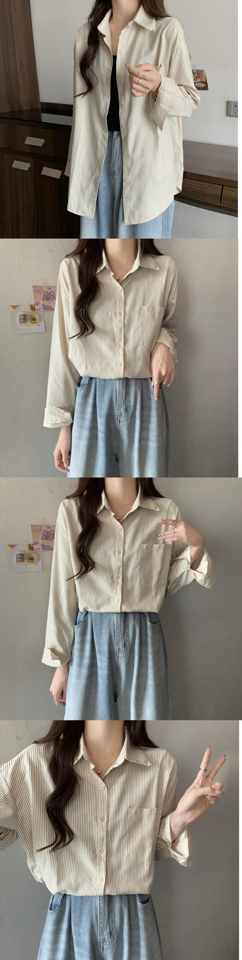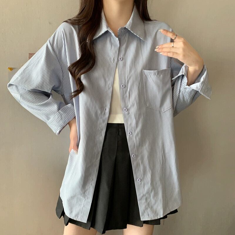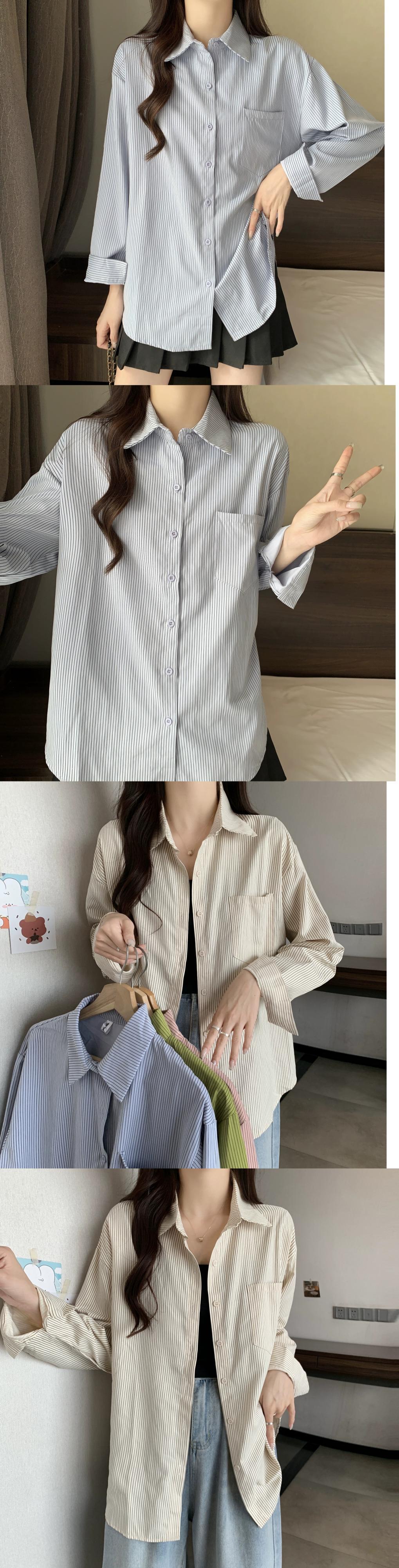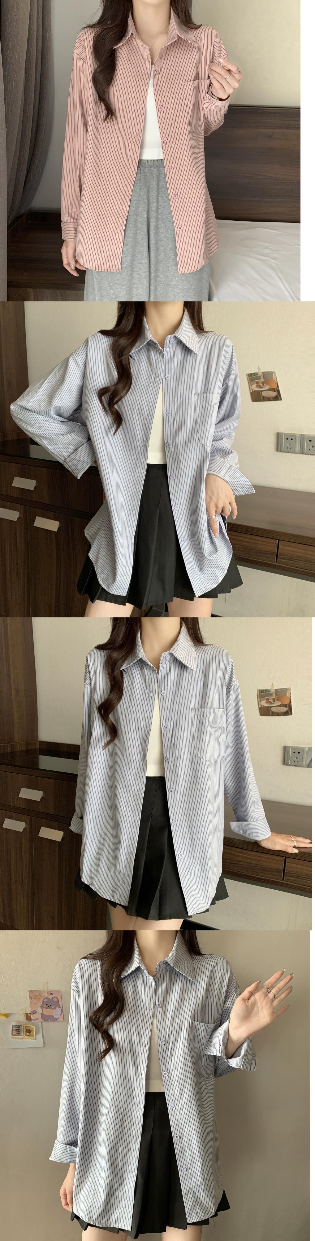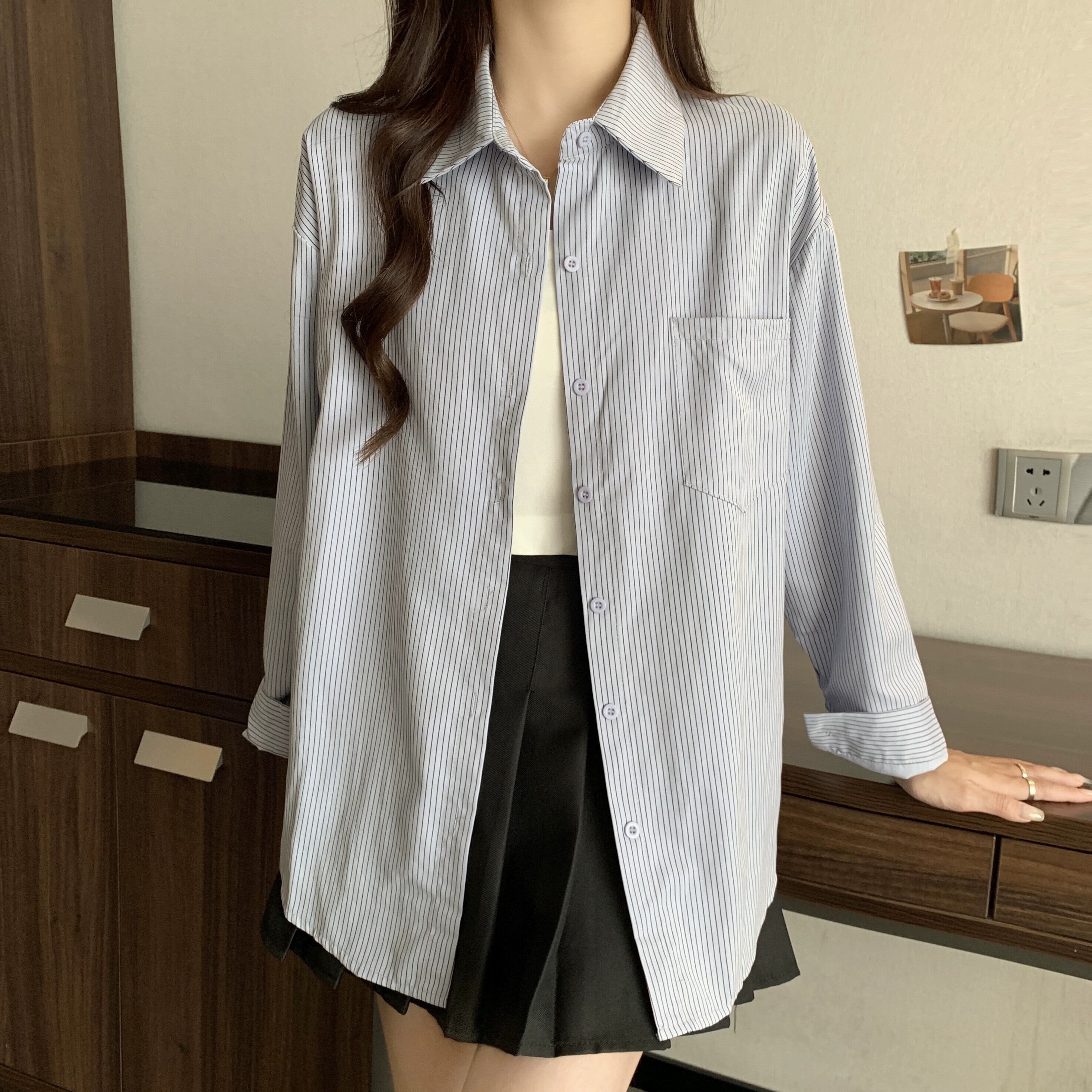 ストライプのミドル丈シャツジャケットの女性、春と秋のデザイン、ゆったりとした怠惰なスタイル、レイヤード長袖トップ ロング レッド スプリング 春物 オータム 秋物 7460094625882010 | framboise21
