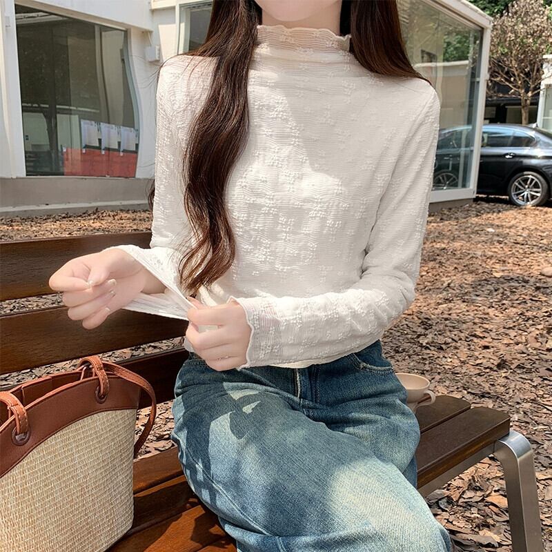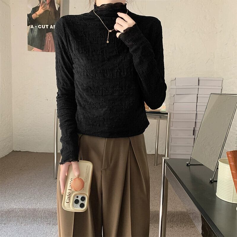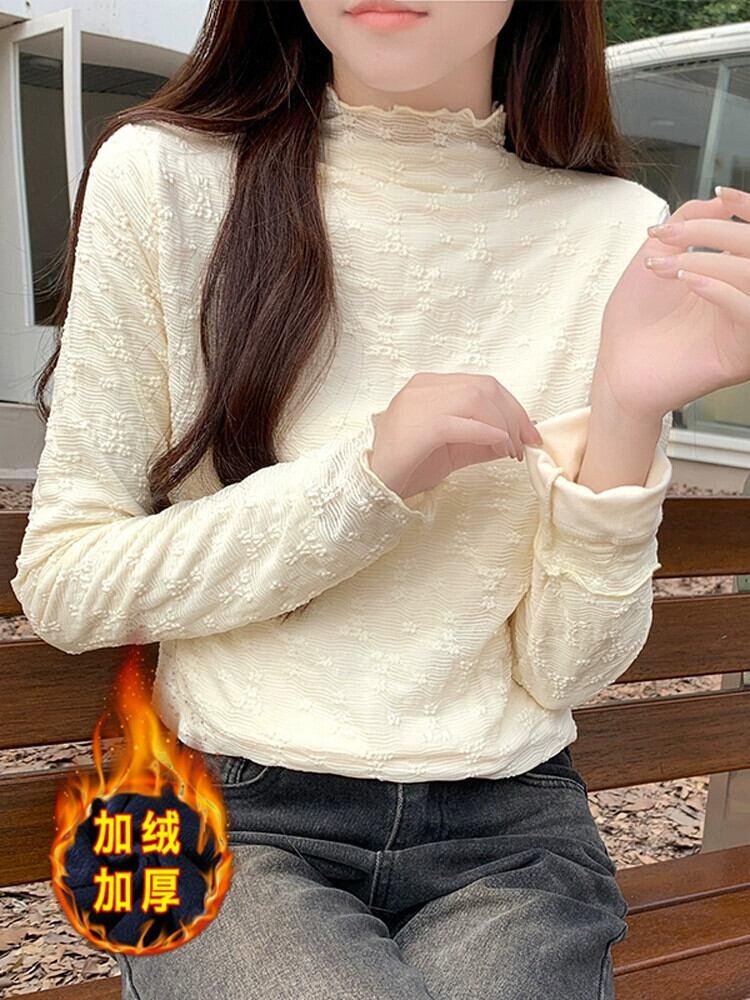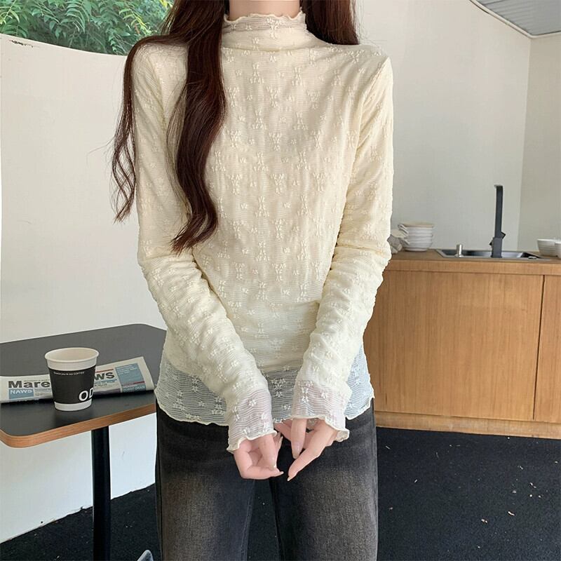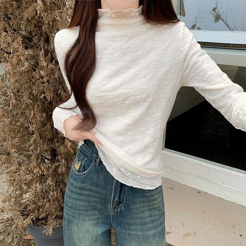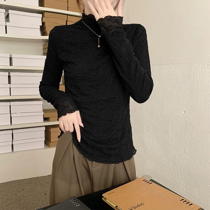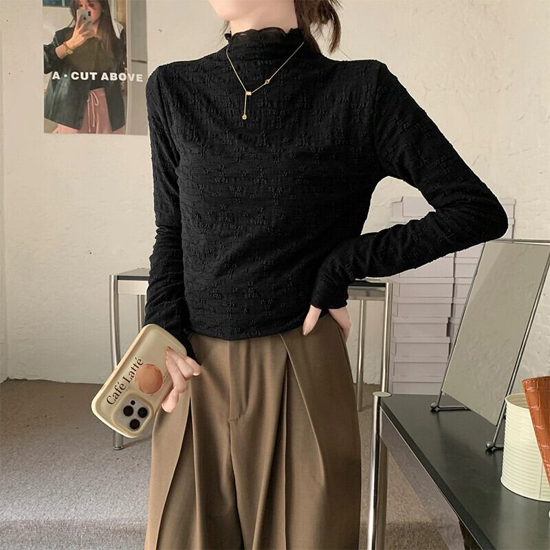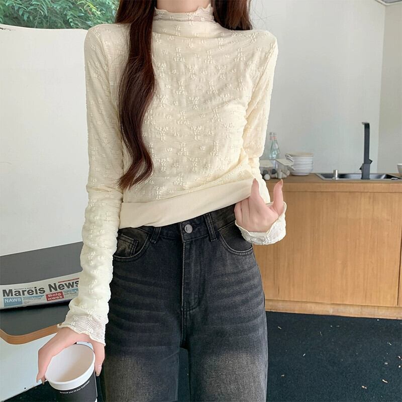 豪華なベルベットと厚みのあるレースのハーフタートルネックボトムシャツ女性の秋と冬のファッショナブルでエレガントなスタイルのインナーウェアメッシュ長袖トップ ロング オータム 秋物 ウィンター 冬物 7460025081007766 | framboise21