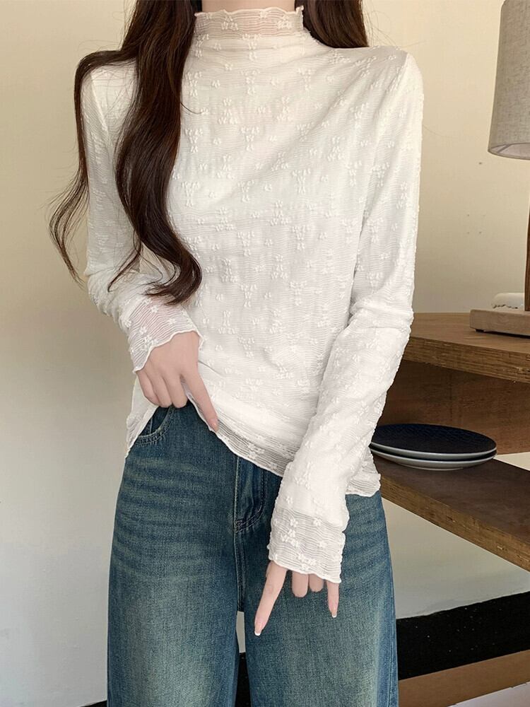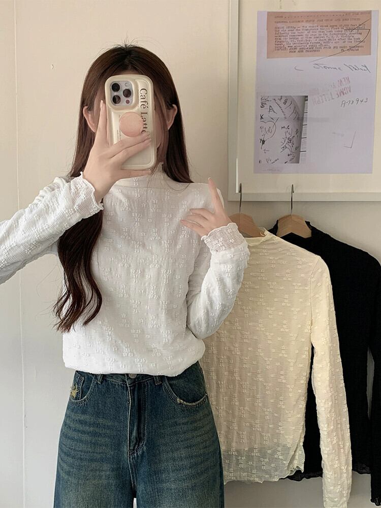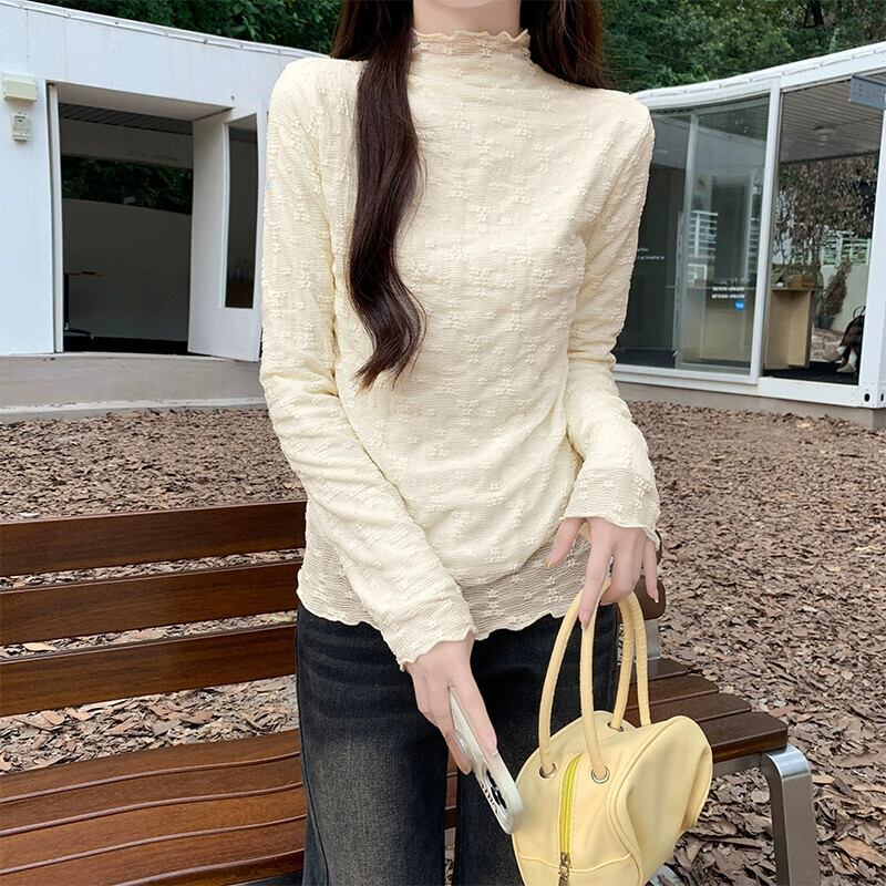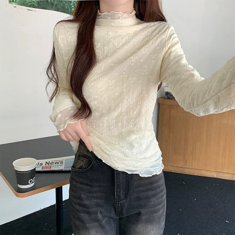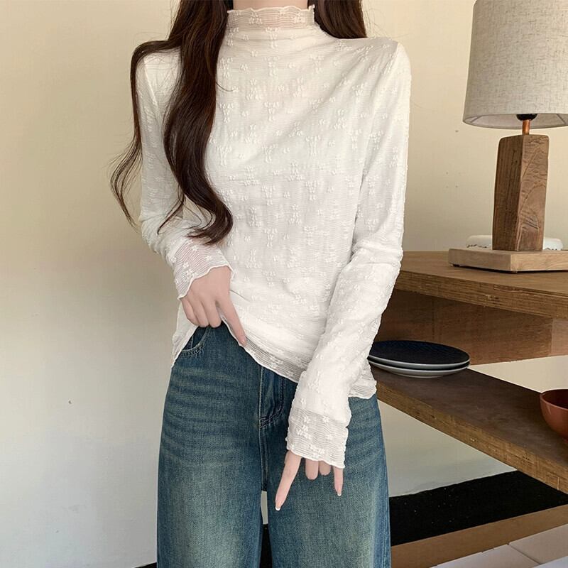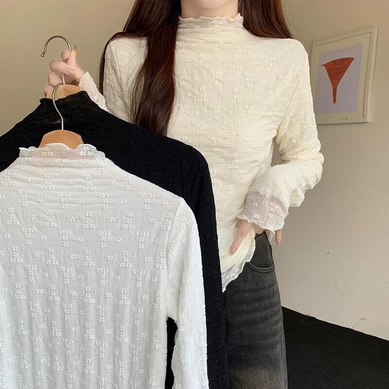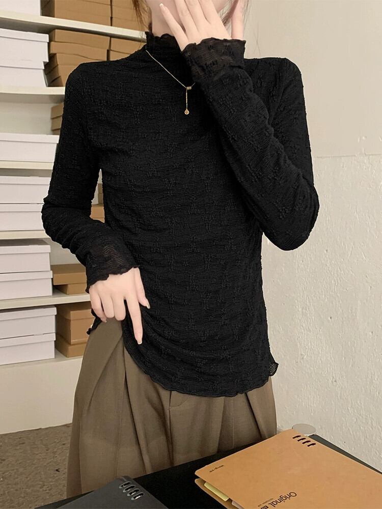 豪華なベルベットと厚みのあるレースのハーフタートルネックボトムシャツ女性の秋と冬のファッショナブルでエレガントなスタイルのインナーウェアメッシュ長袖トップ ロング オータム 秋物 ウィンター 冬物 7460025081007766 | framboise21