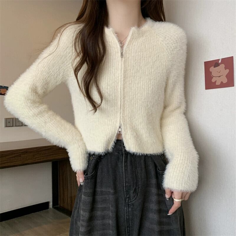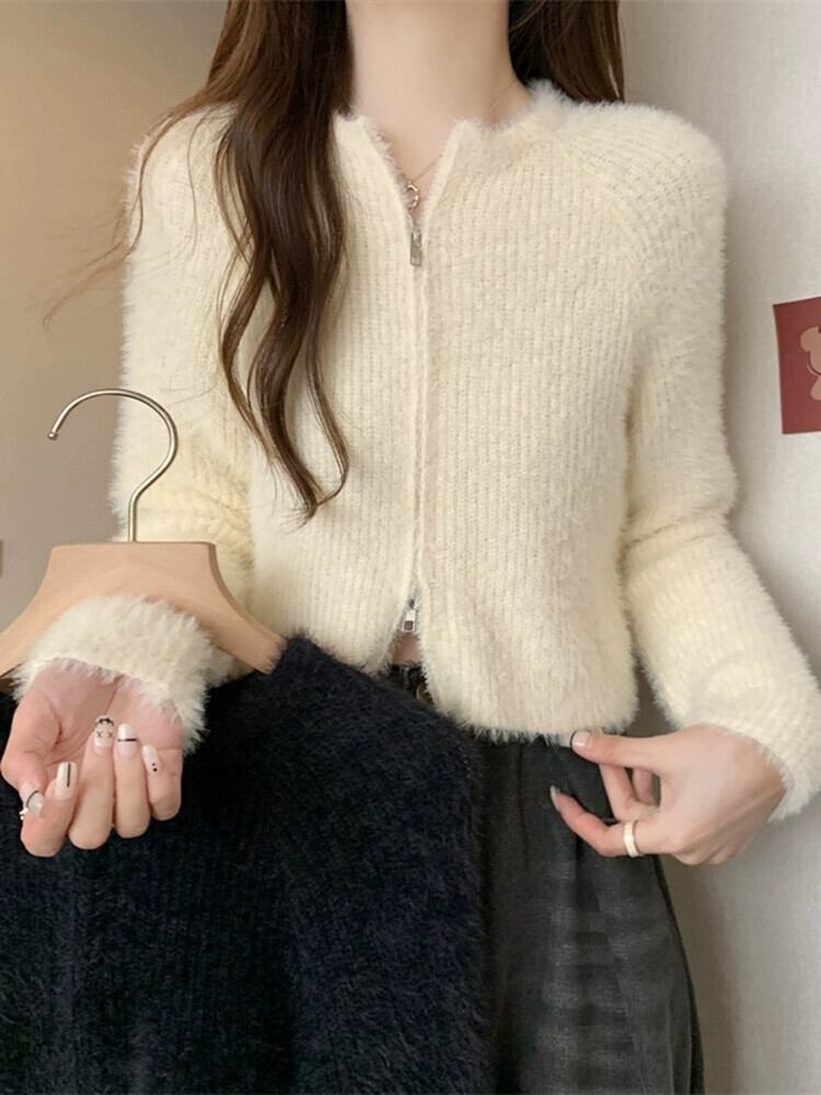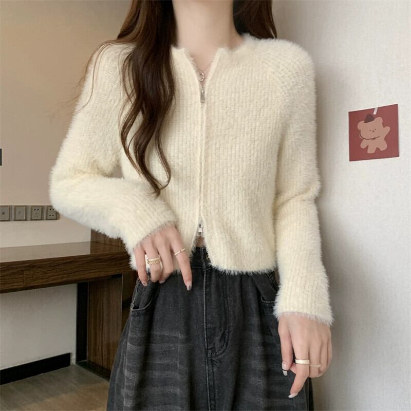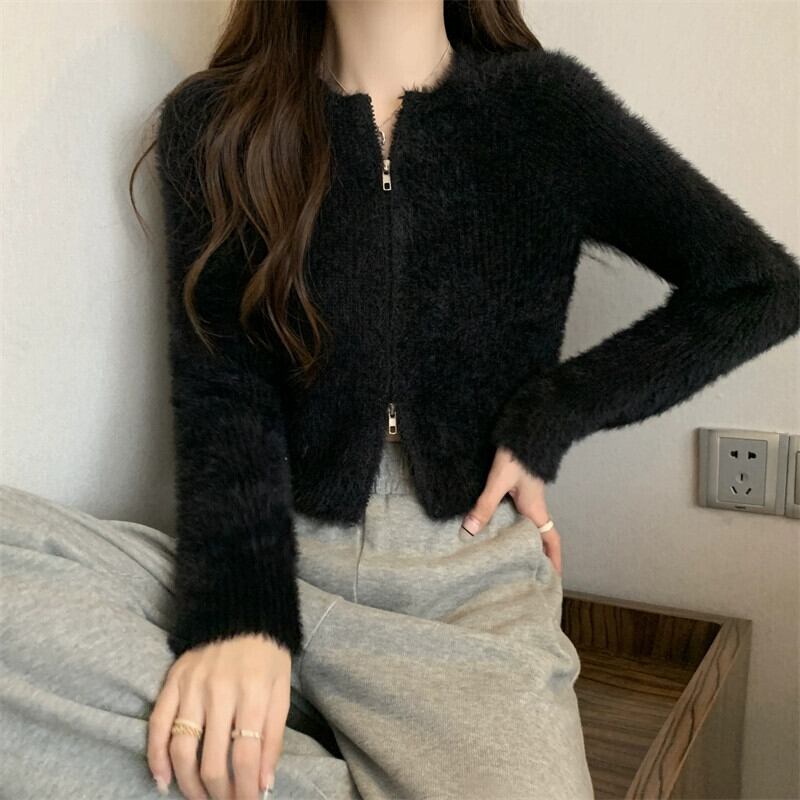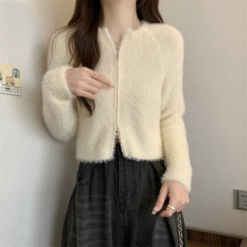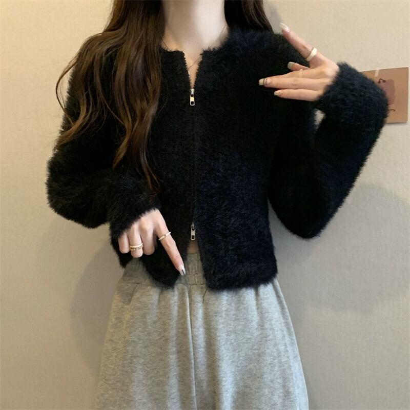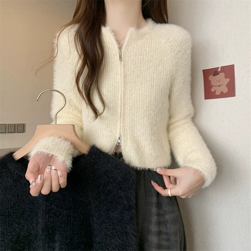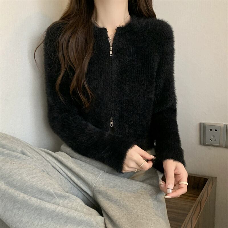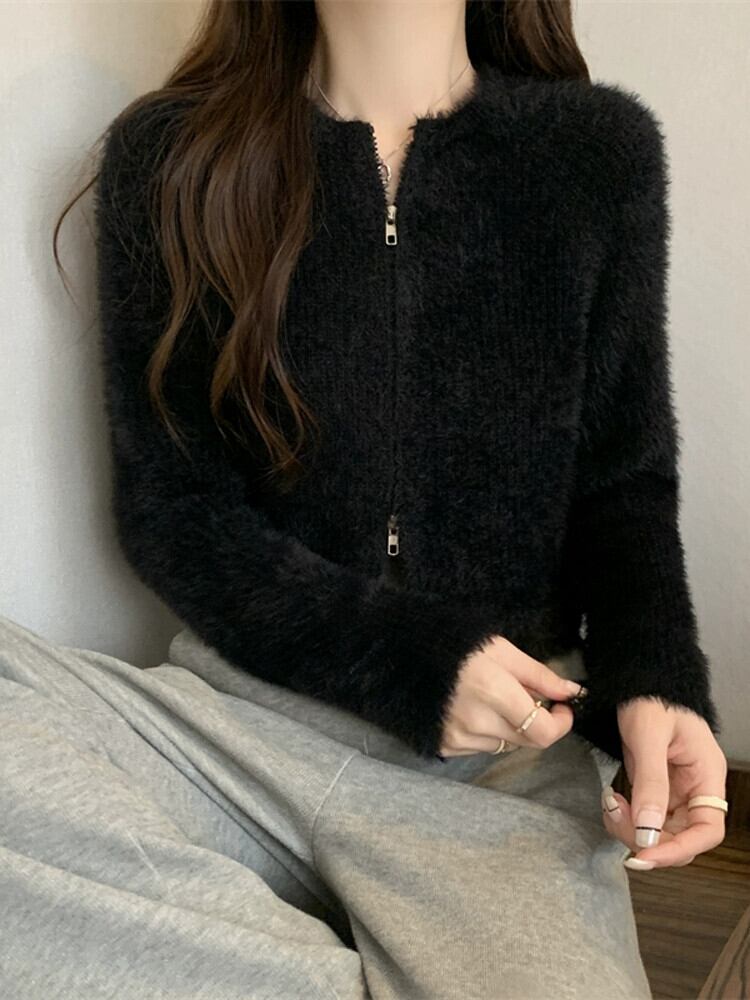 ジッパー付きショートイミテーションミンクベルベットセータージャケット女性秋と冬の小人、ファッショナブルなスリムアウターウェア長袖ニットカーディガン ロング レッド オータム 秋物 ウィンター 冬物 7460027060195279 | framboise21