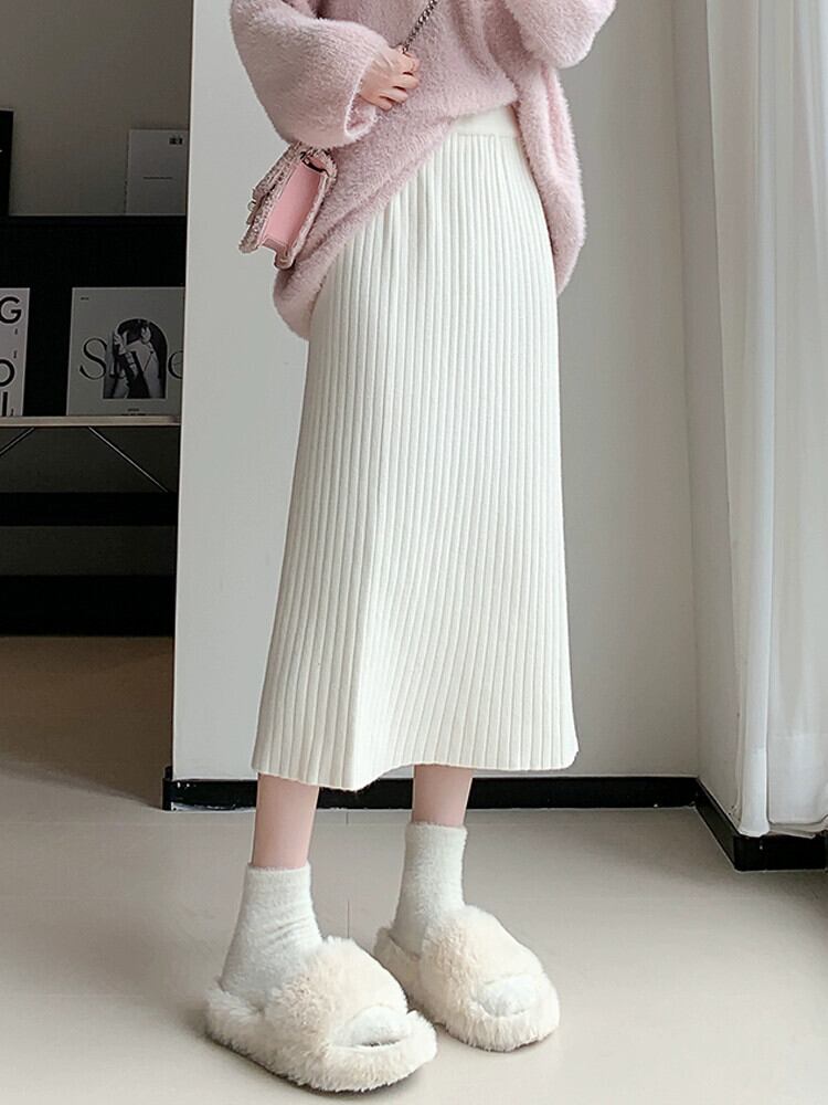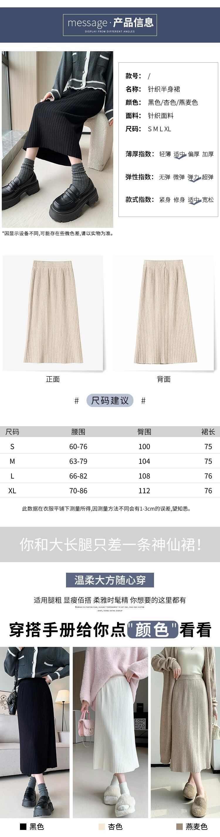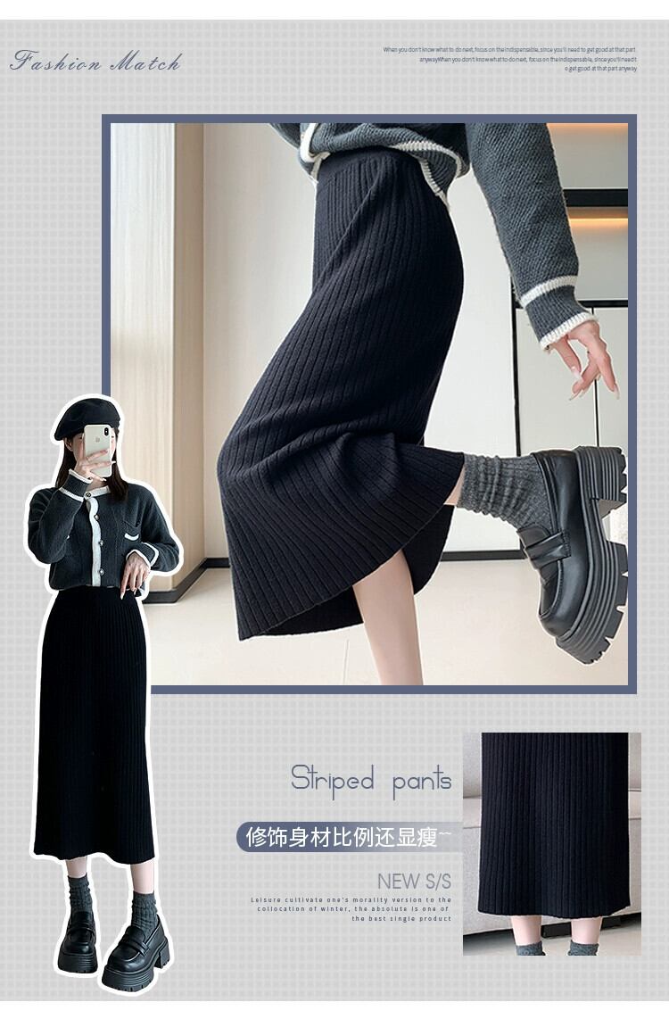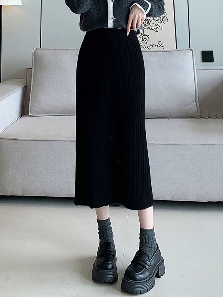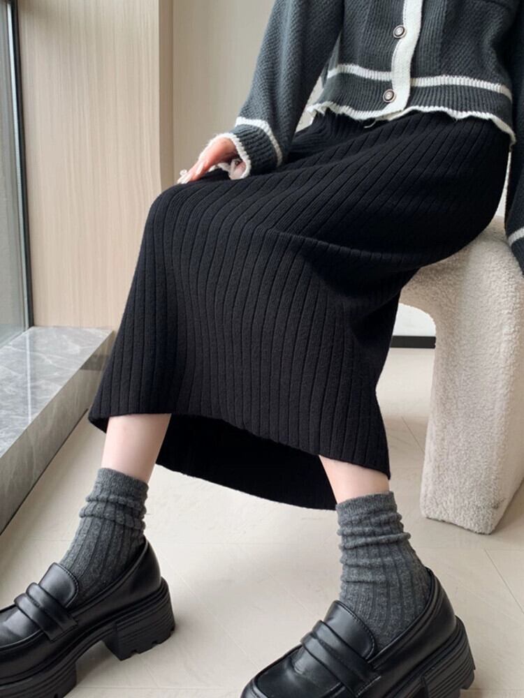 黒ニットスカートの女性 2023 秋と冬の新しい小中長ハイウエストスリム a ラインヒップハグロングスカート ブラック オータム 秋物 ウィンター 冬物 Aライン 7460024763666093 | framboise21