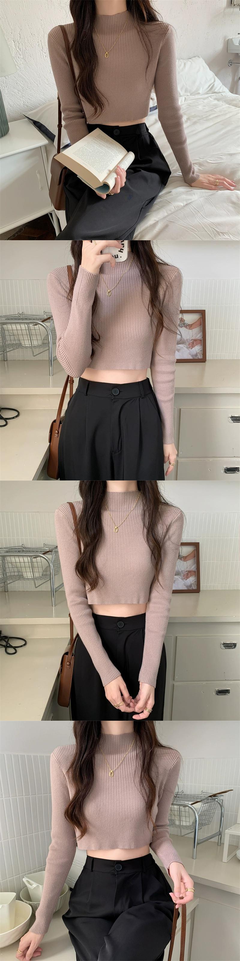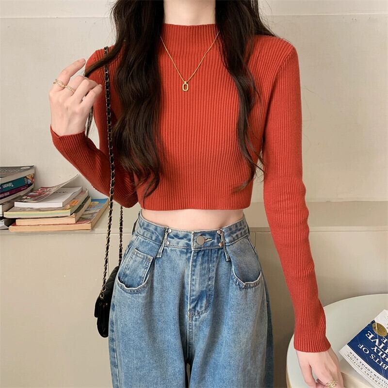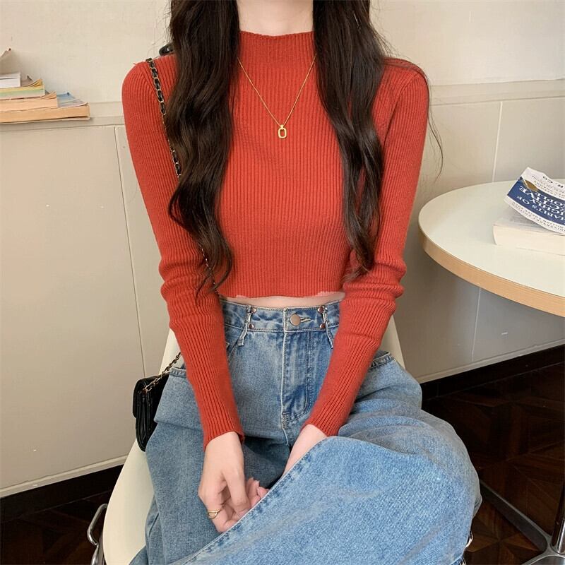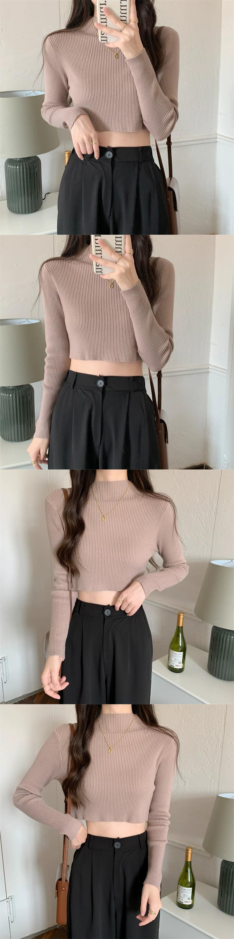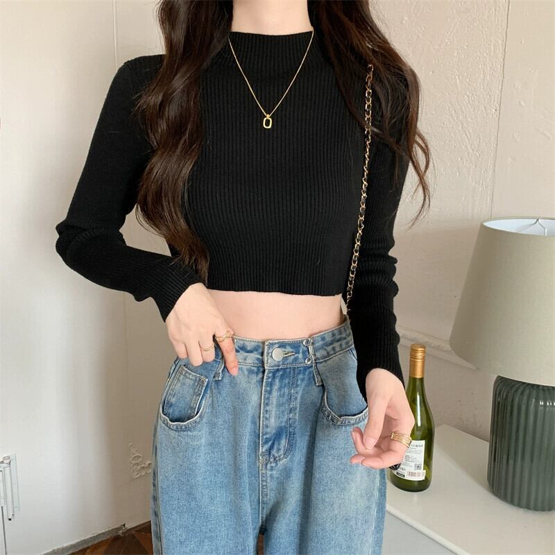 秋と冬の小柄なハイウエストのショートセーター、おへそが出るスリムフィットのニットボトムと大きなレザーのインナートップ オータム 秋物 ウィンター 冬物 7460065390489010 | framboise21