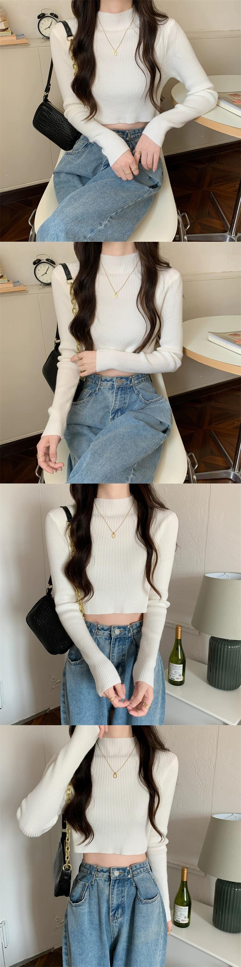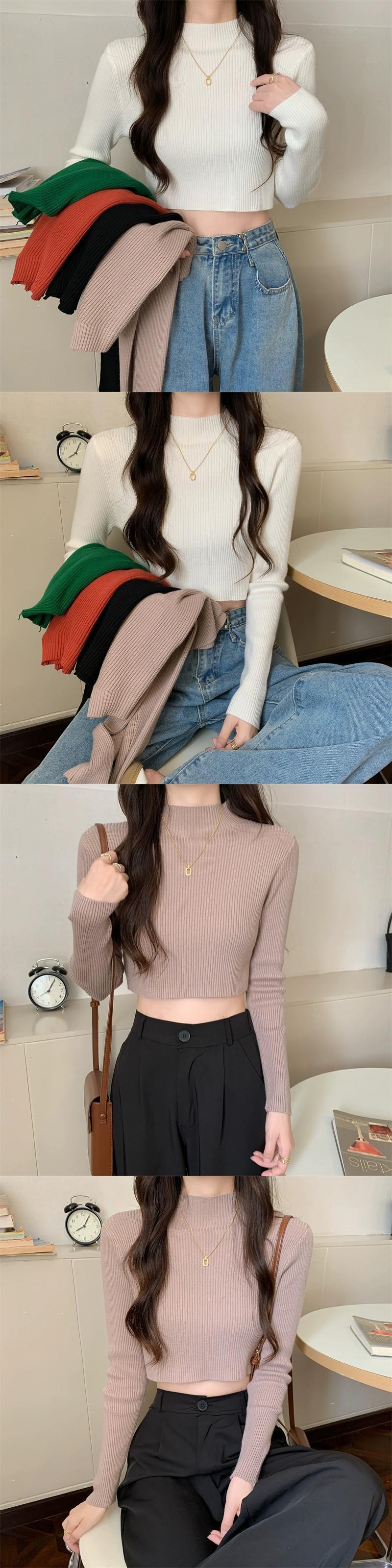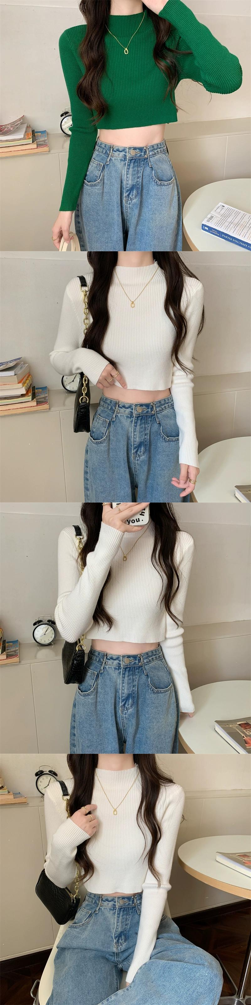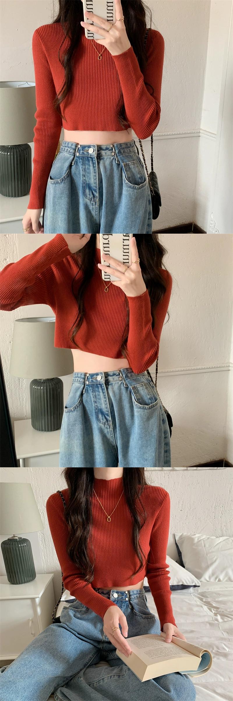 秋と冬の小柄なハイウエストのショートセーター、おへそが出るスリムフィットのニットボトムと大きなレザーのインナートップ オータム 秋物 ウィンター 冬物 7460065390489010 | framboise21