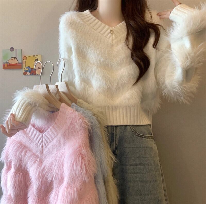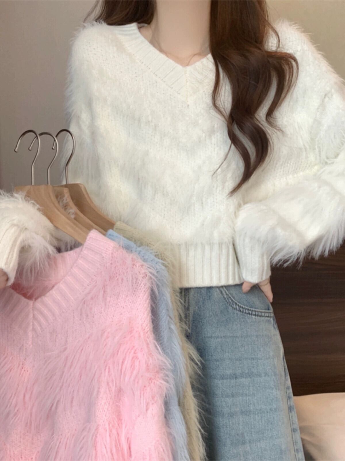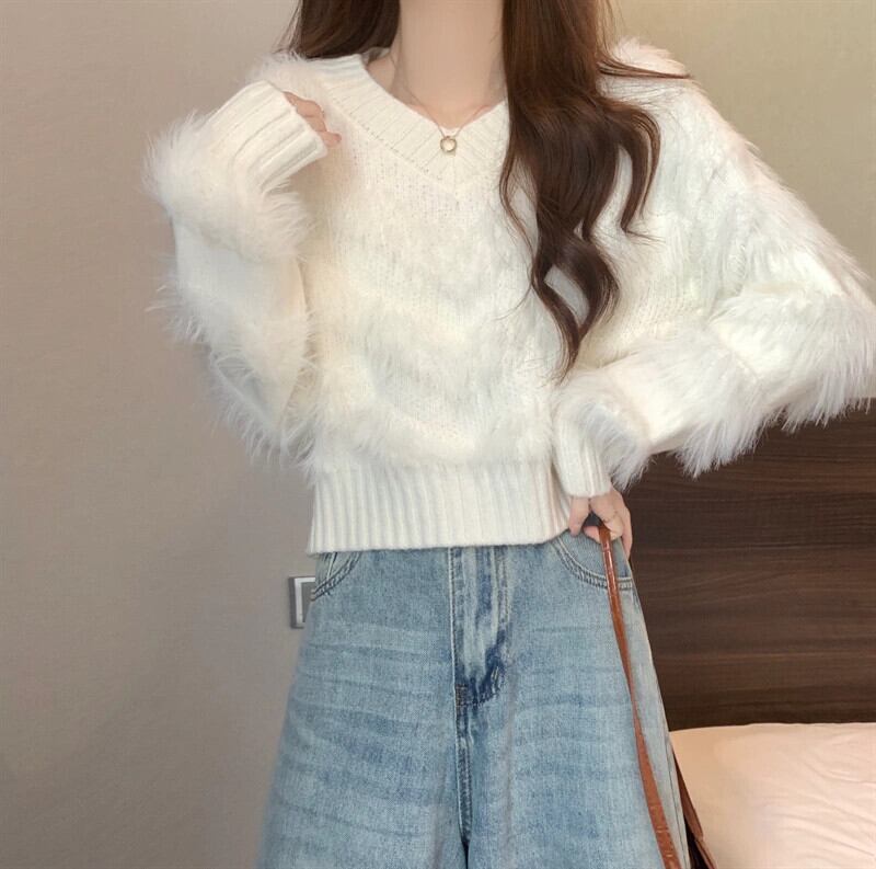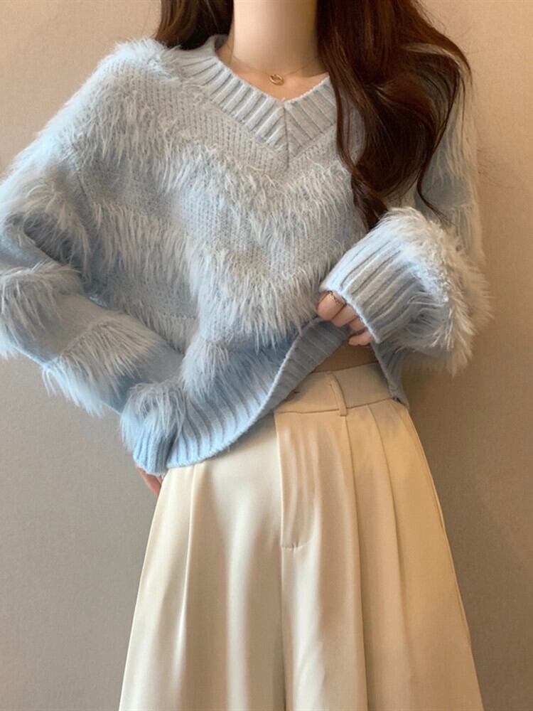 毛皮のような模造ミンクショートセーター女性の秋と冬のファッションルーズアウターウェア怠惰な肥厚vネックセーター オータム 秋物 ウィンター 冬物 7460066960023226 | framboise21