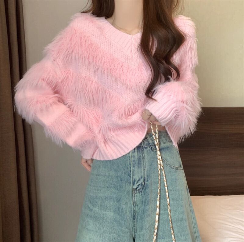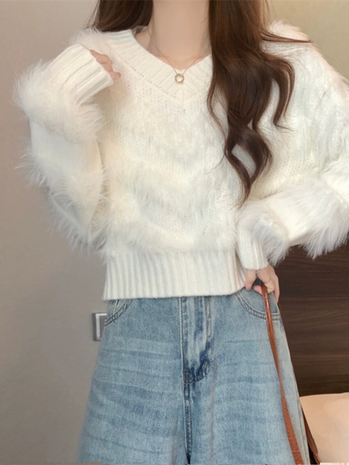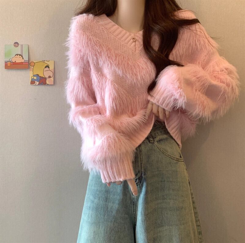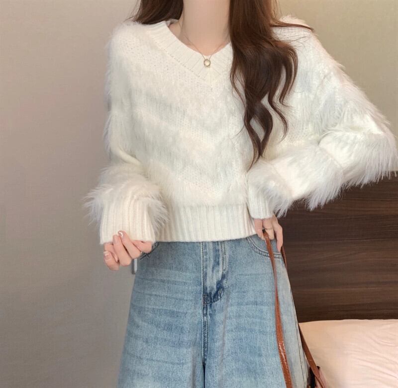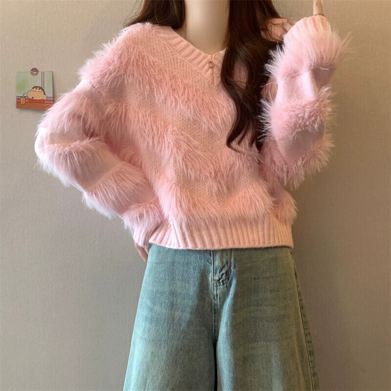 毛皮のような模造ミンクショートセーター女性の秋と冬のファッションルーズアウターウェア怠惰な肥厚vネックセーター オータム 秋物 ウィンター 冬物 7460066960023226 | framboise21