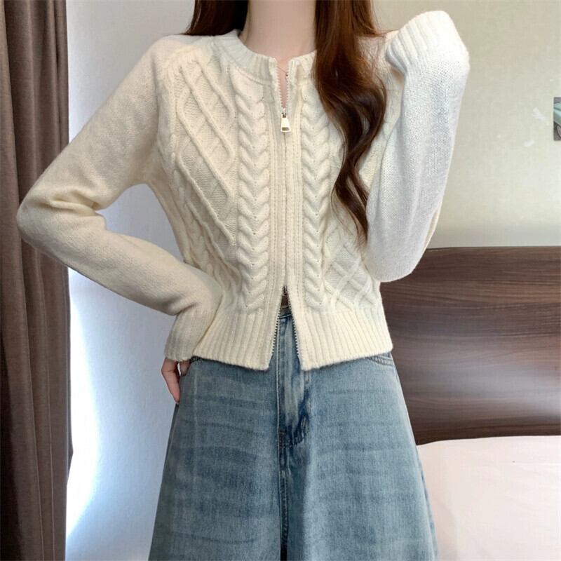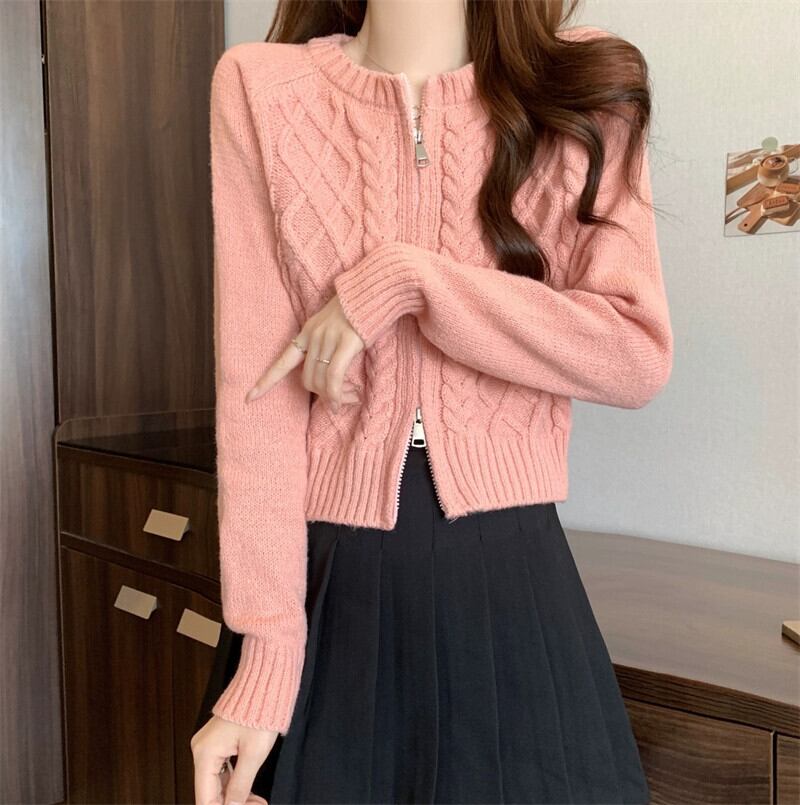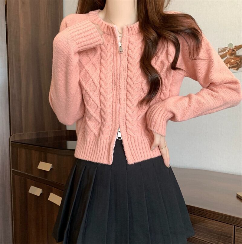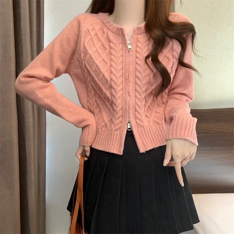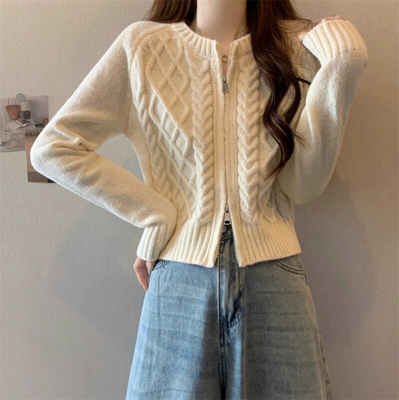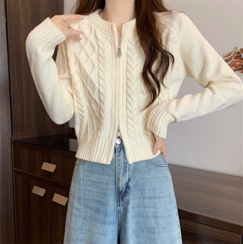 ダブルジッパーツイストショートセーターカーディガンコート女性の秋と冬の小人緩いアウターウェア怠惰な長袖セーター ロング オータム 秋物 ウィンター 冬物 7460040510372861 | framboise21