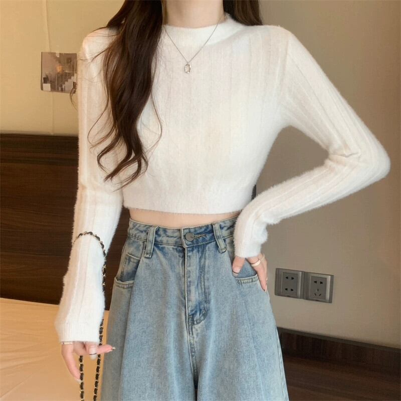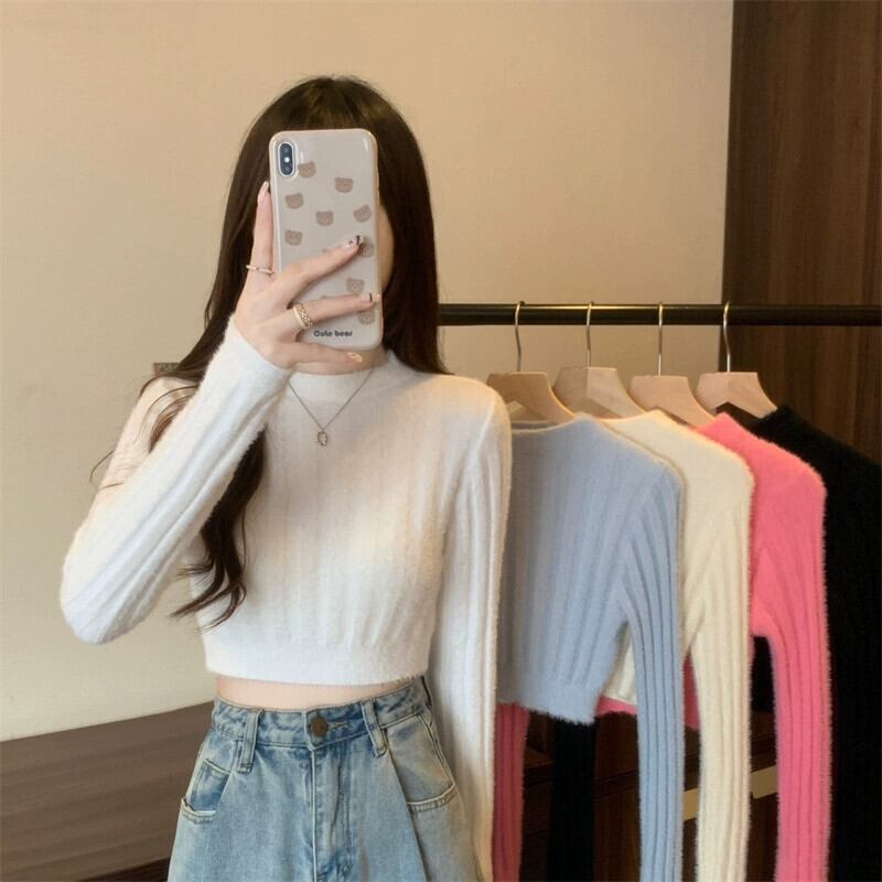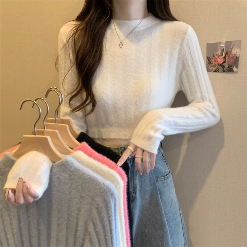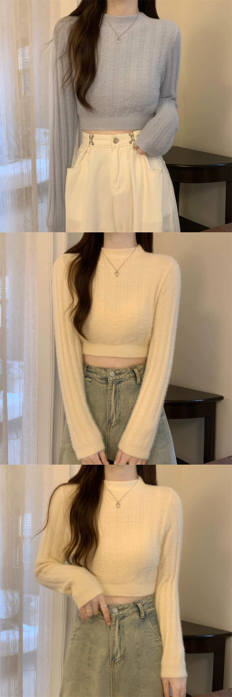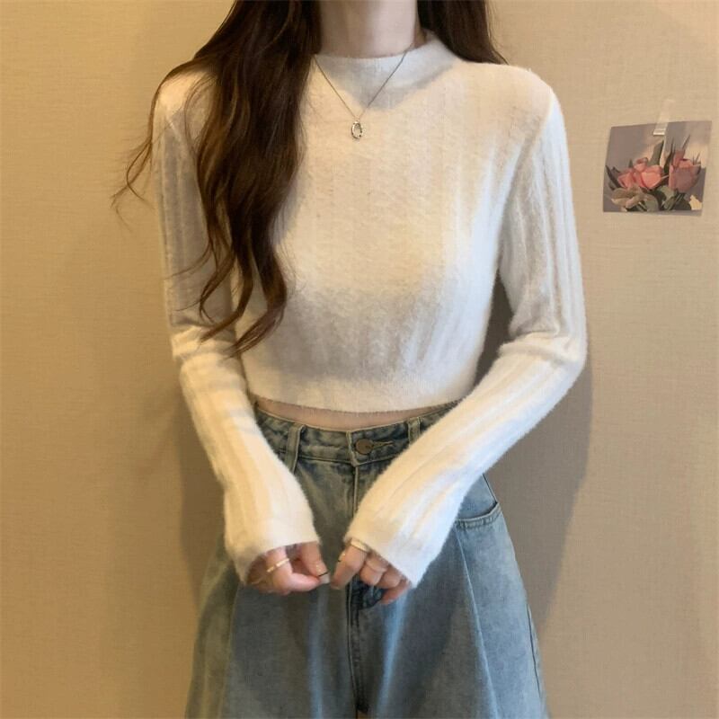 - ウエストショートイミテーションミンクベルベットセーターボトミングシャツ女性秋と冬の小柄な人々スリムフィット内側と外側の白いセーター ホワイト オータム 秋物 ウィンター 冬物 7460044435109939 | framboise21