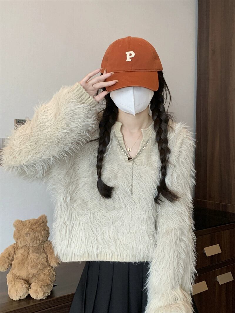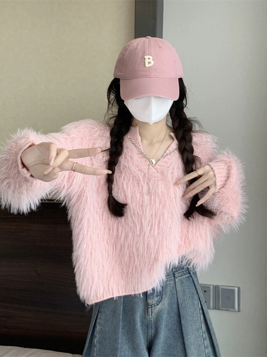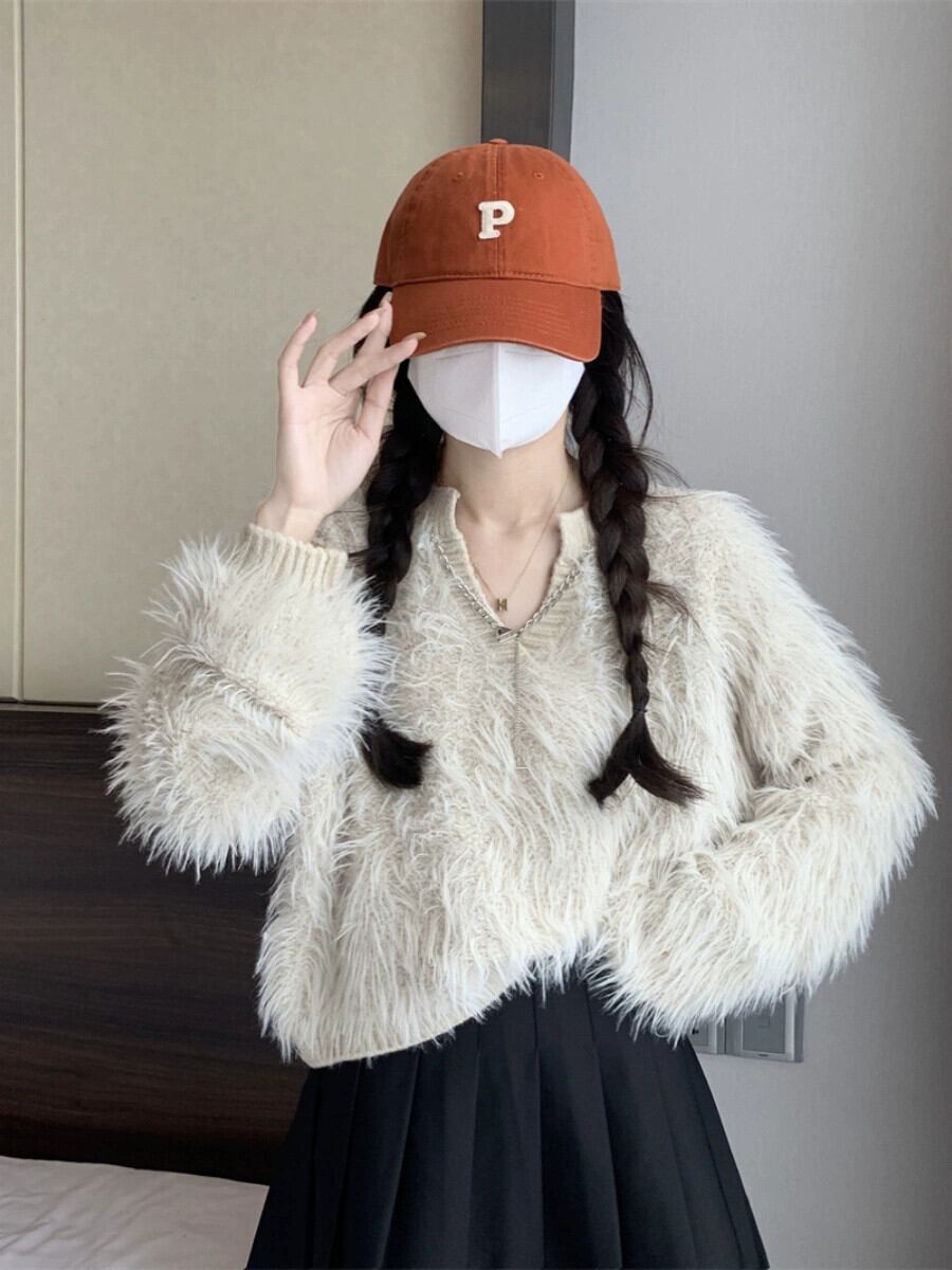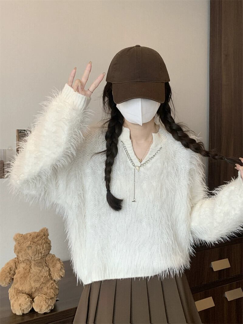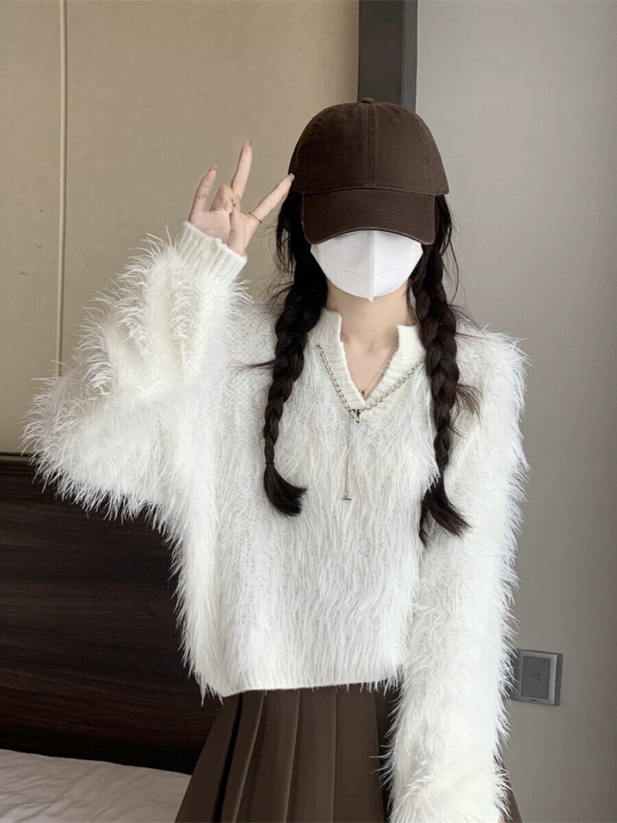 秋と冬のイミテーションミンクベルベットショートセーターレディース、甘くて怠惰でルーズなアウターウェア、厚みのあるVネックモヘアセーター 大人ガーリー スウィート キュート カジュアル オータム 秋物 ウィンター 冬物 7460076884327894 | framboise21