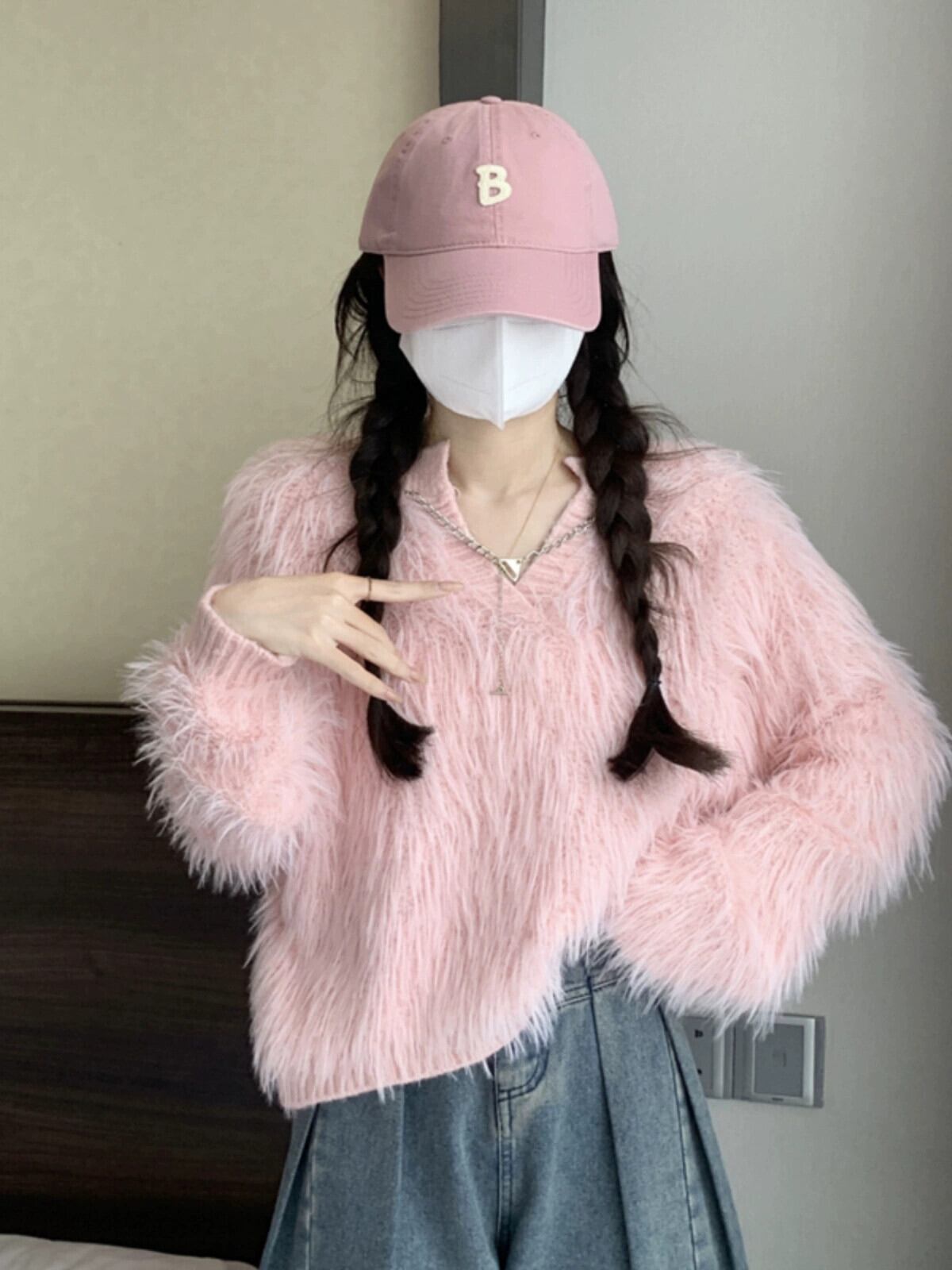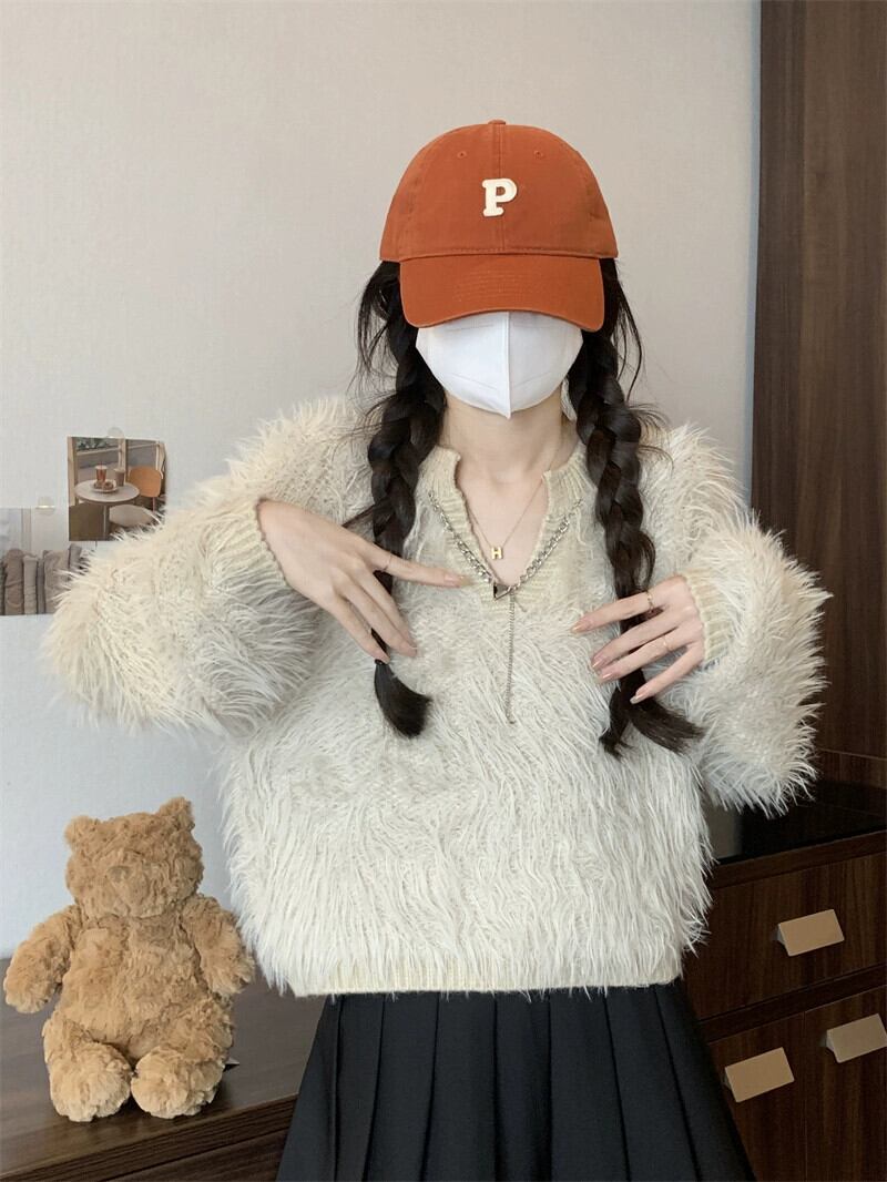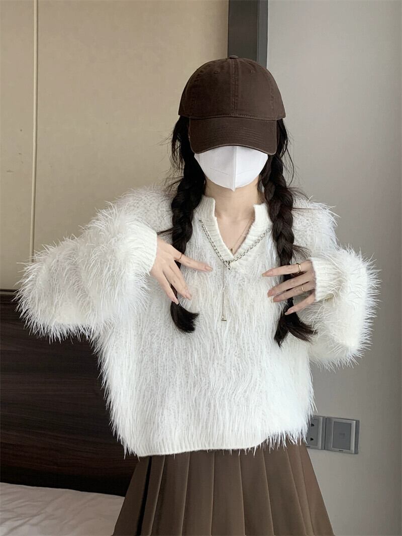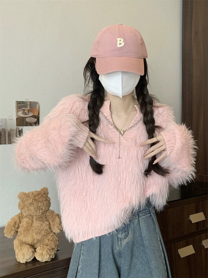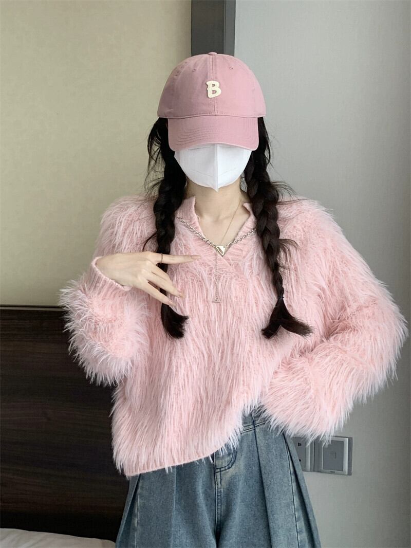 秋と冬のイミテーションミンクベルベットショートセーターレディース、甘くて怠惰でルーズなアウターウェア、厚みのあるVネックモヘアセーター 大人ガーリー スウィート キュート カジュアル オータム 秋物 ウィンター 冬物 7460076884327894 | framboise21