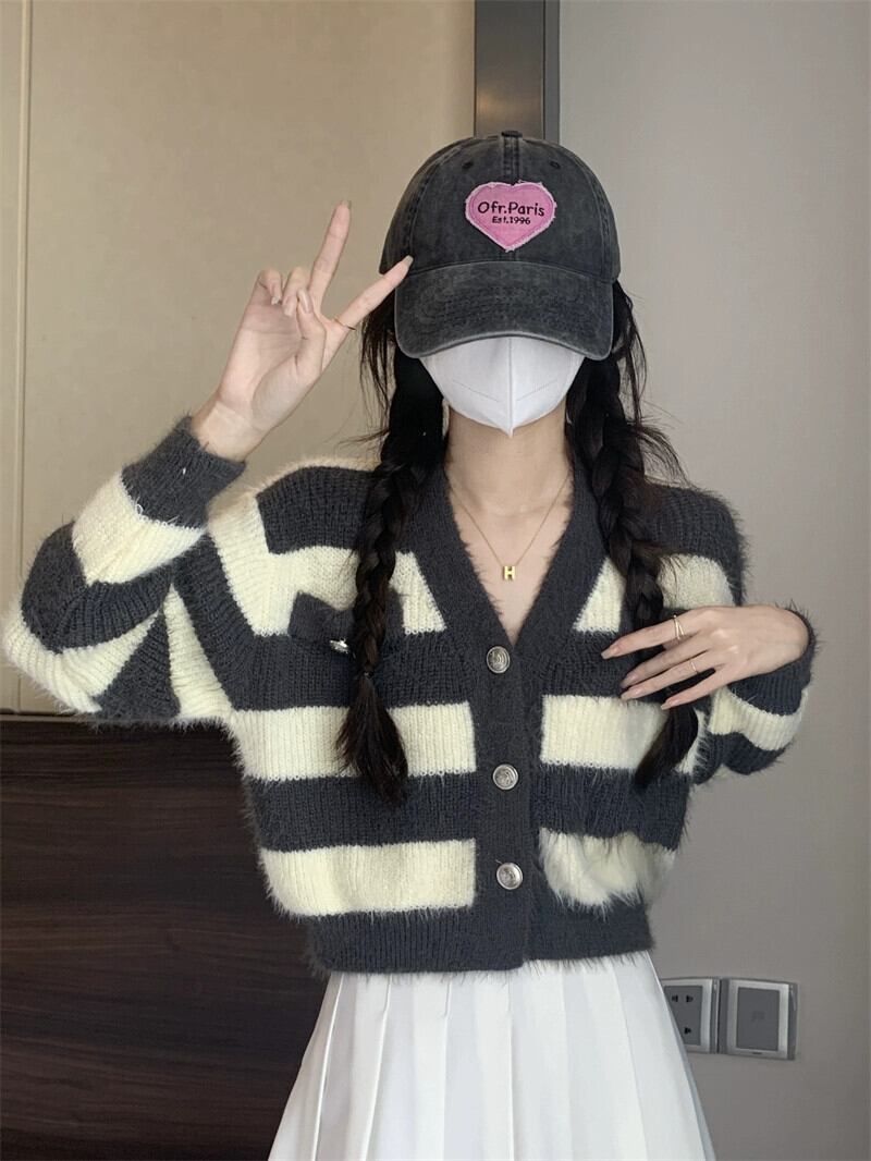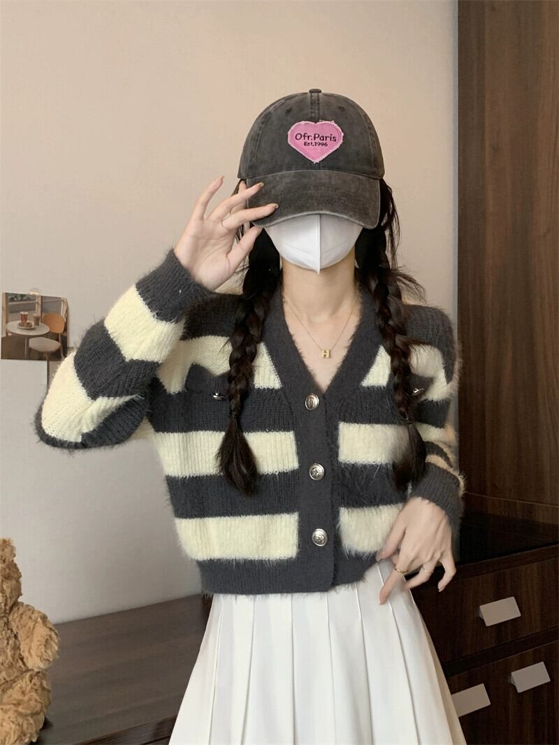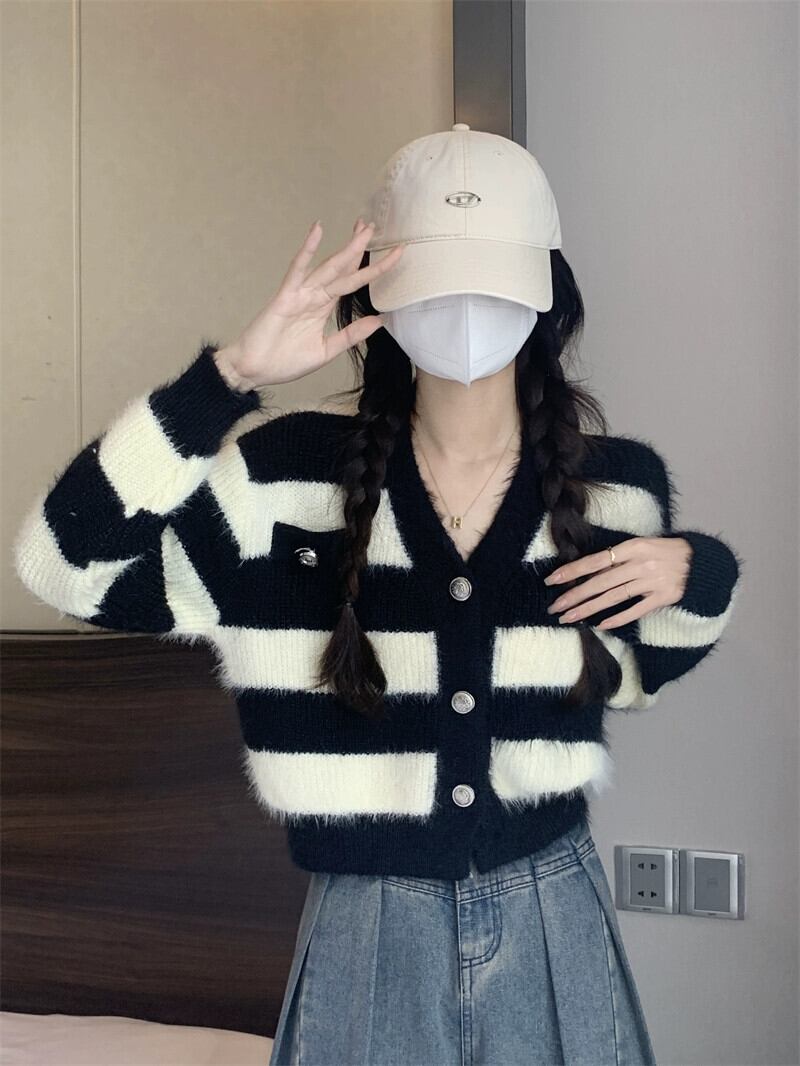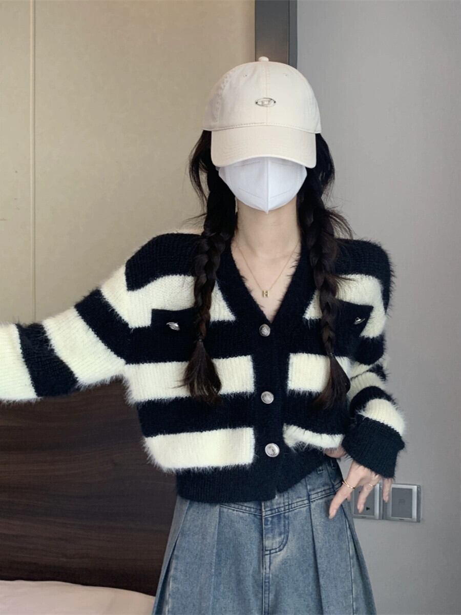 ストライプショートイミテーションミンクセータージャケット女性の秋と冬のレトロなルーズアウターウェア怠惰な V ネックニットカーディガン オータム 秋物 ウィンター 冬物 Vネック 7460050928890029 | framboise21