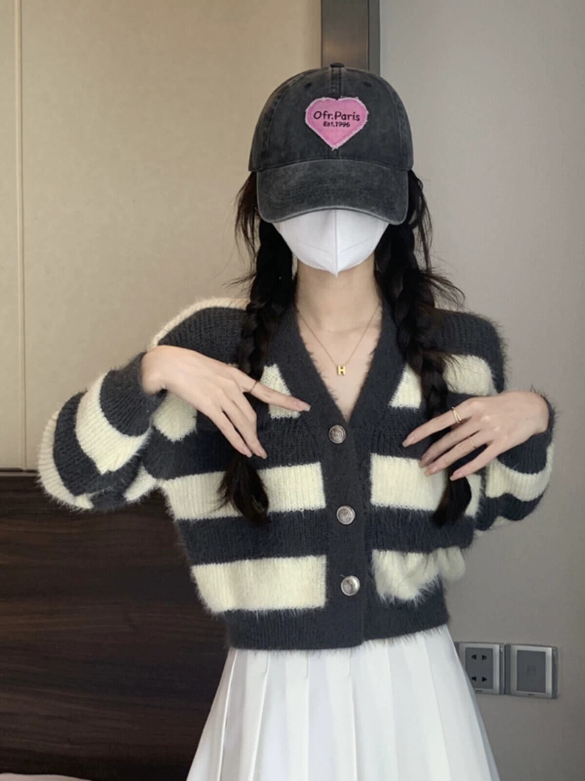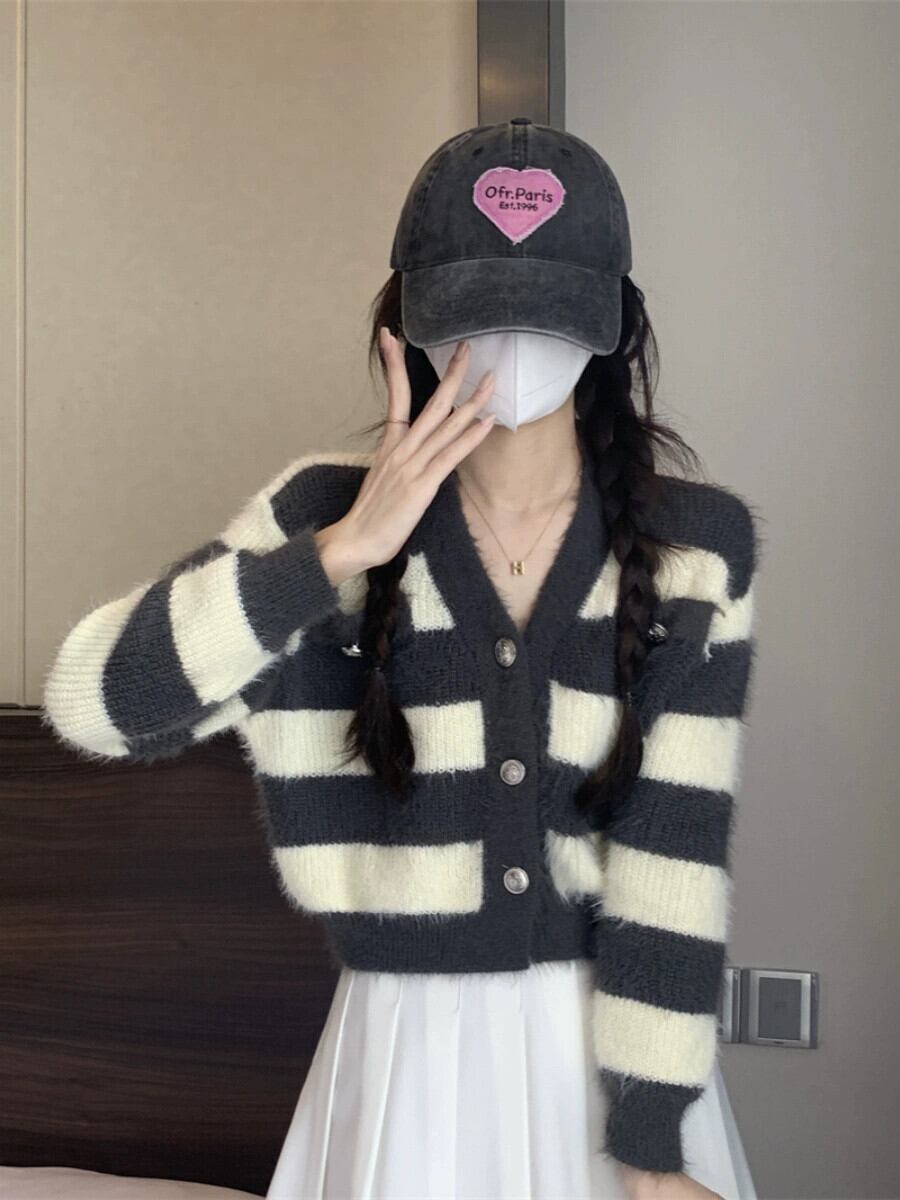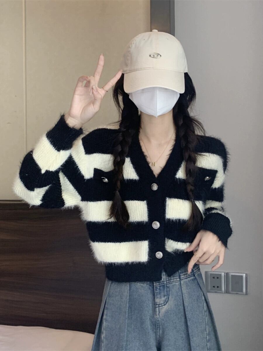 ストライプショートイミテーションミンクセータージャケット女性の秋と冬のレトロなルーズアウターウェア怠惰な V ネックニットカーディガン オータム 秋物 ウィンター 冬物 Vネック 7460050928890029 | framboise21
