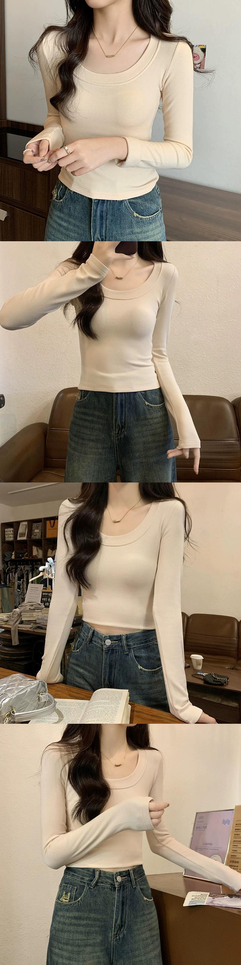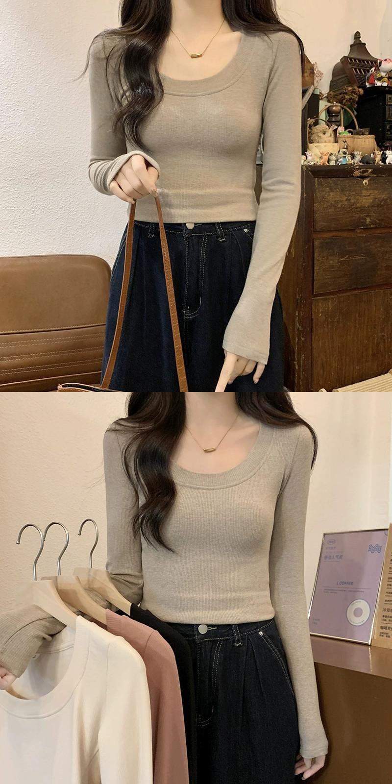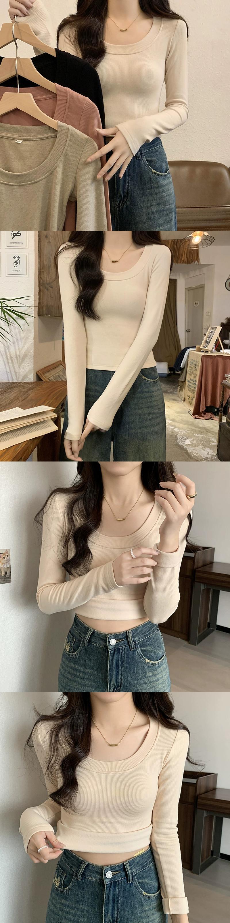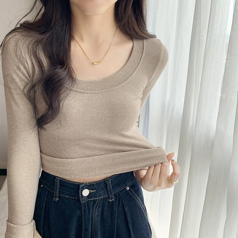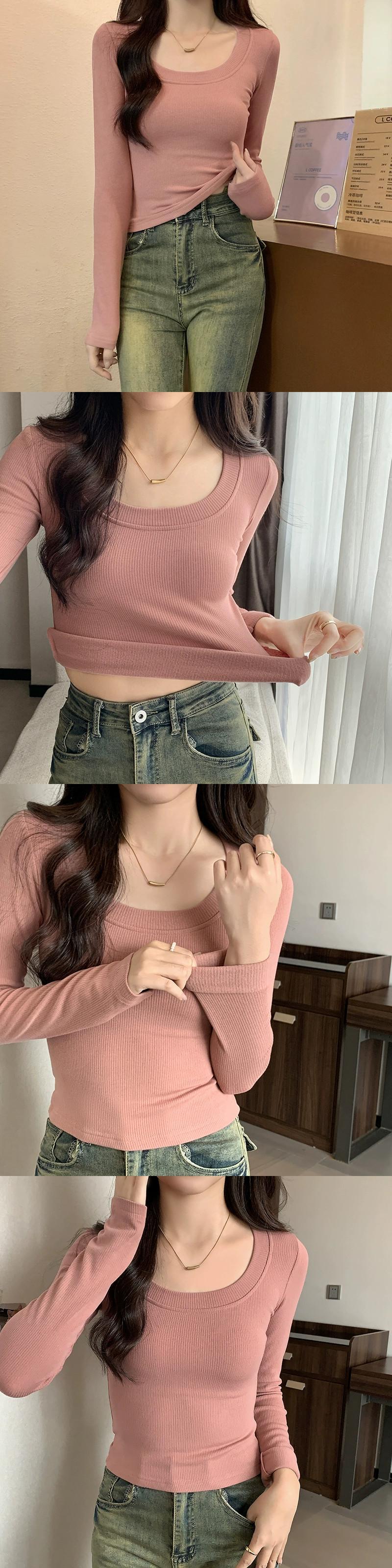 オートミールカラーの起毛ボトムシャツレディース、秋冬インナーショートトップ、スリムで多用途、厚くて暖かい、長袖UネックTシャツ ロング レッド オータム 秋物 ウィンター 冬物 7460023165036668 | framboise21