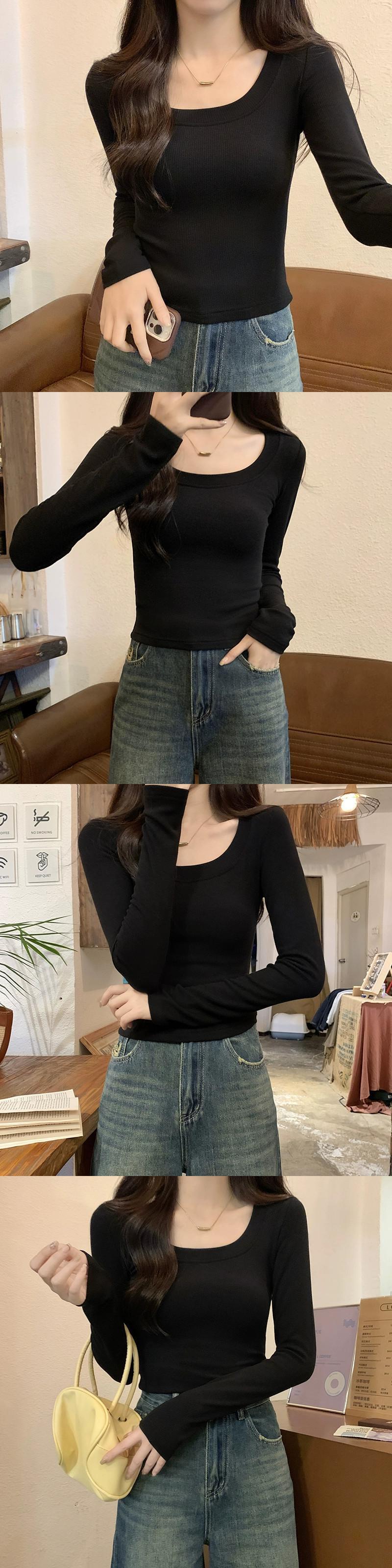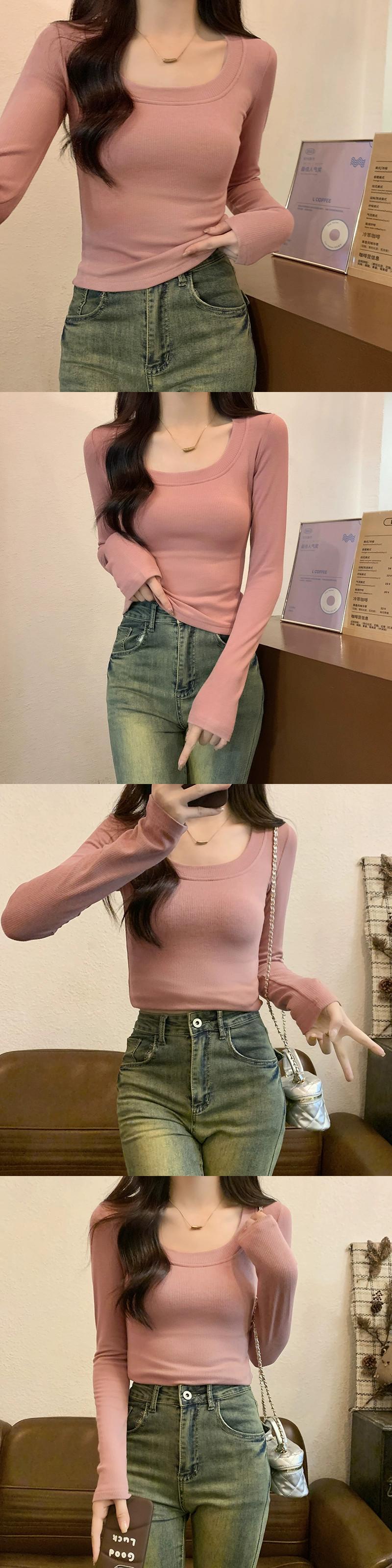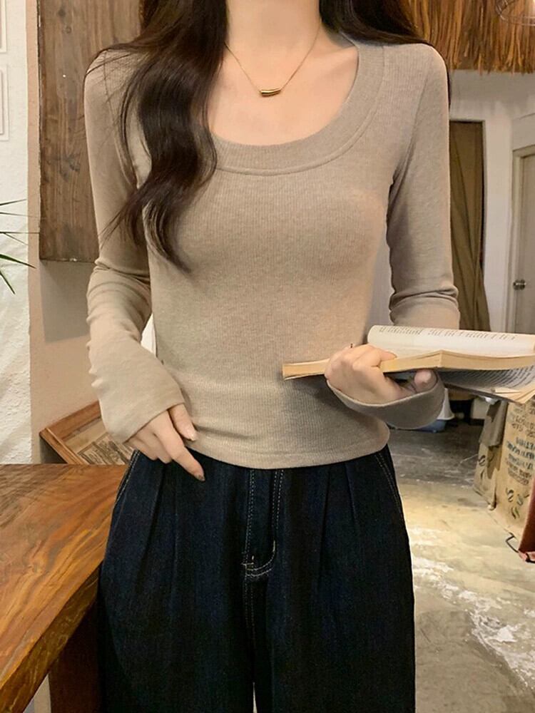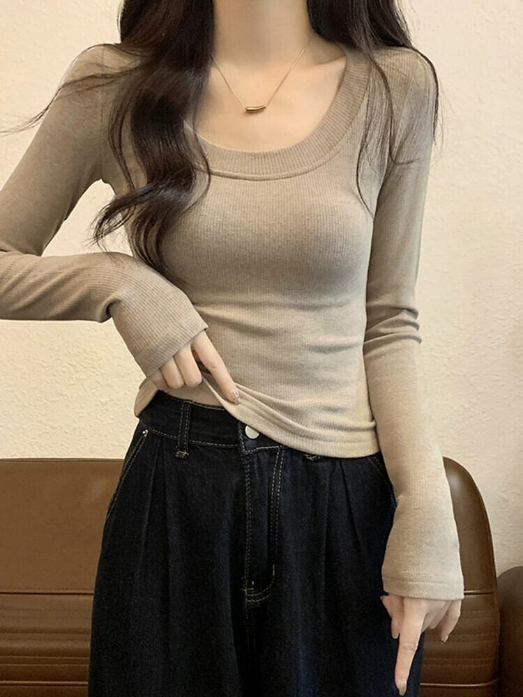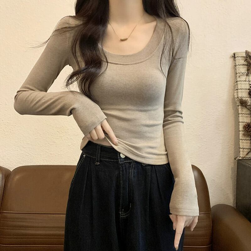 オートミールカラーの起毛ボトムシャツレディース、秋冬インナーショートトップ、スリムで多用途、厚くて暖かい、長袖UネックTシャツ ロング レッド オータム 秋物 ウィンター 冬物 7460023165036668 | framboise21