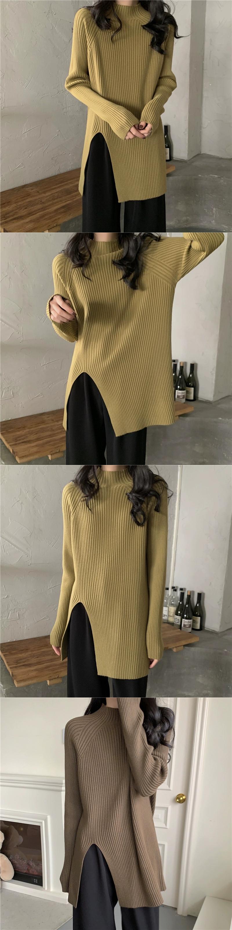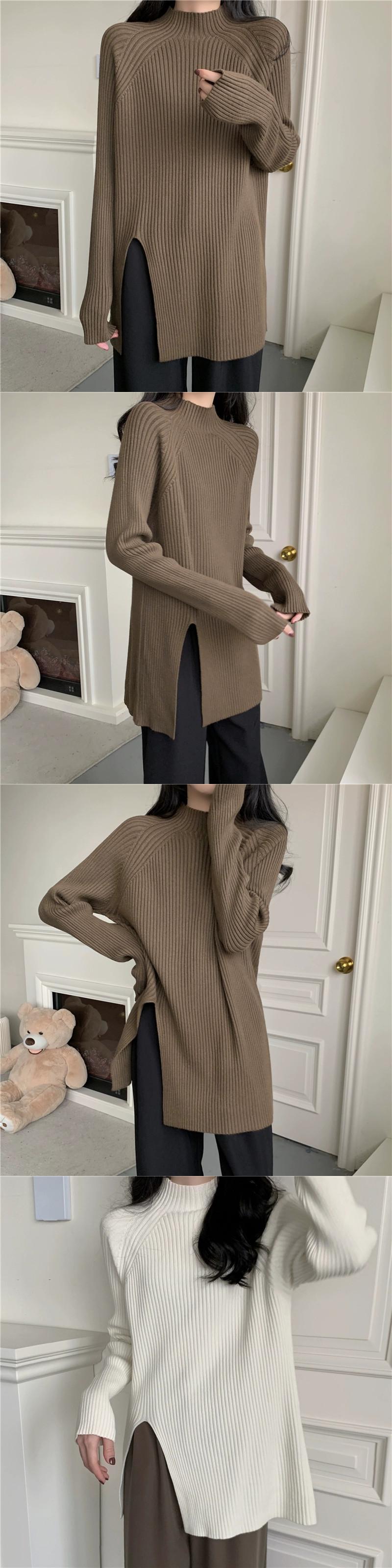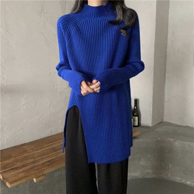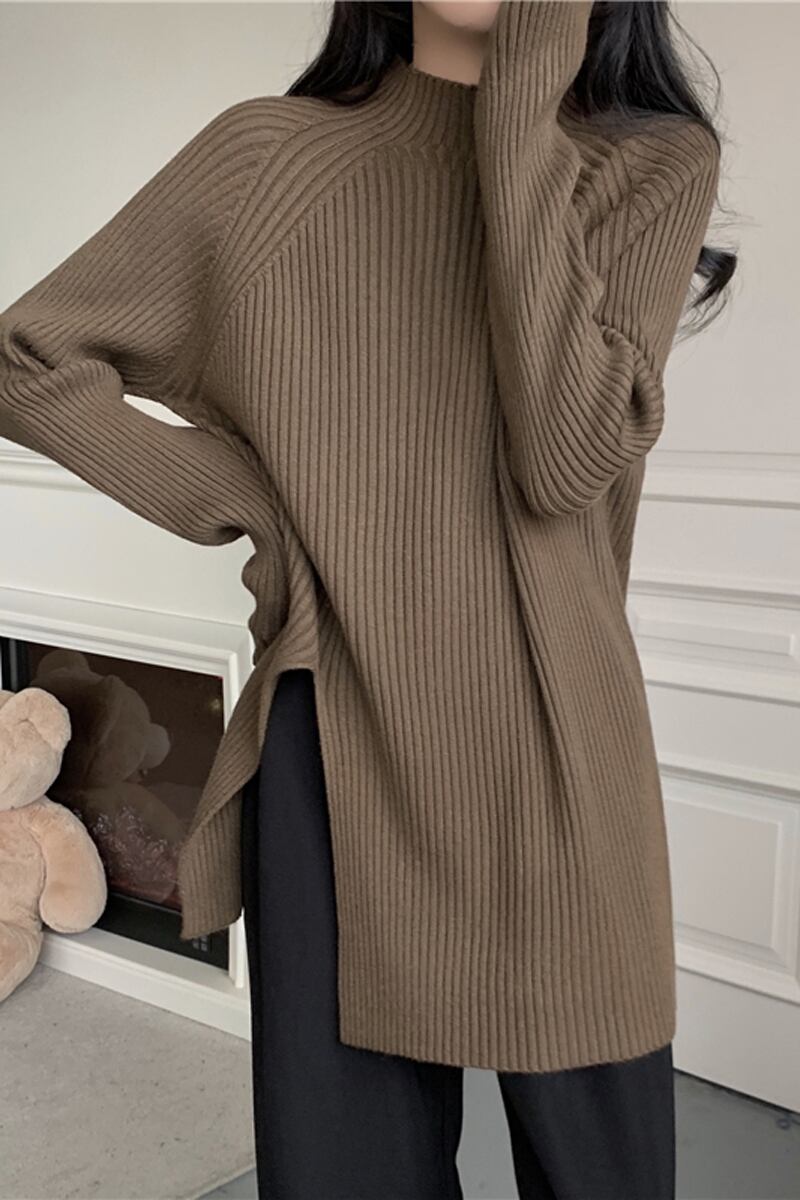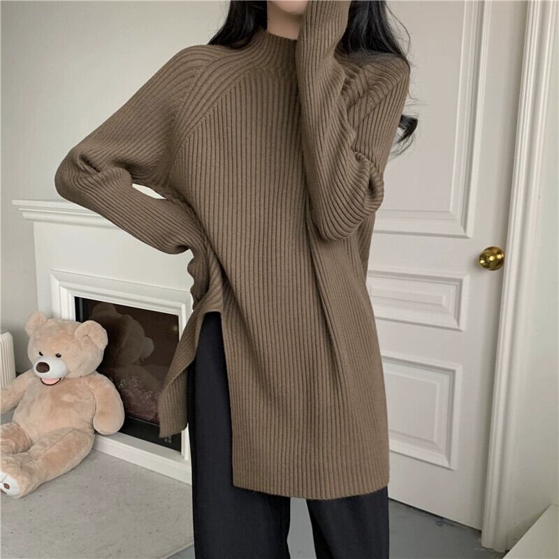 秋と冬の茶色のミッドハイカラーボトリングシャツレディース、怠惰なインナースタイル、ミッドレングスのスリット、右肩、ミッドカラーニットセーター オータム 秋物 ウィンター 冬物 7460075427935062 | framboise21