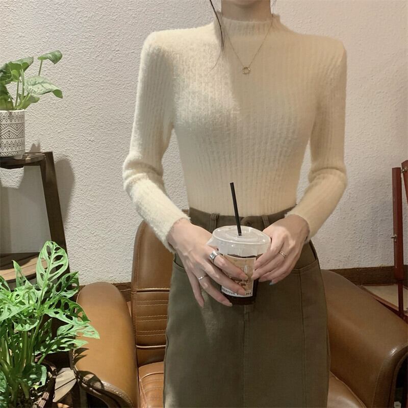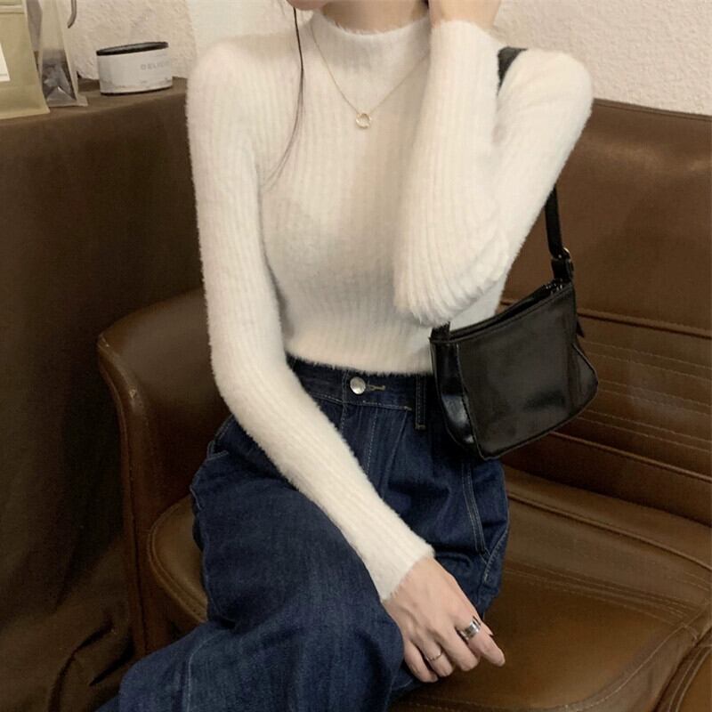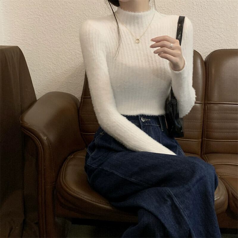 秋冬のハーフタートルネックボトリングシャツレディース、厚みのあるミンクベルベットセーター、ファッショナブルなタイトフィットインナーレイヤー、スリミングミッドカラーセーターホワイト オータム 秋物 ウィンター 冬物 7460012765297963 | framboise21
