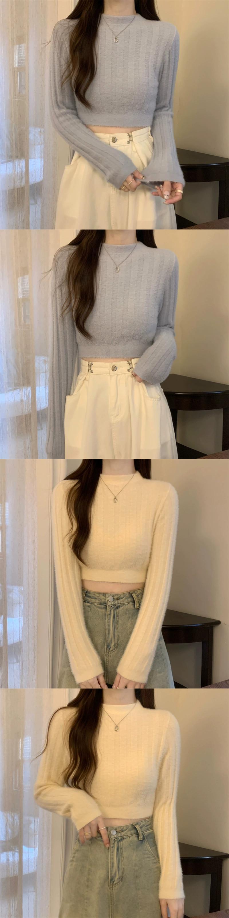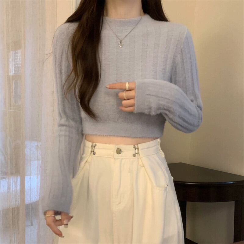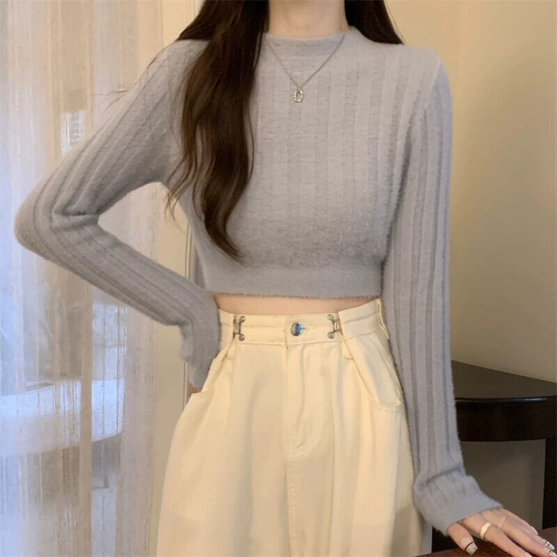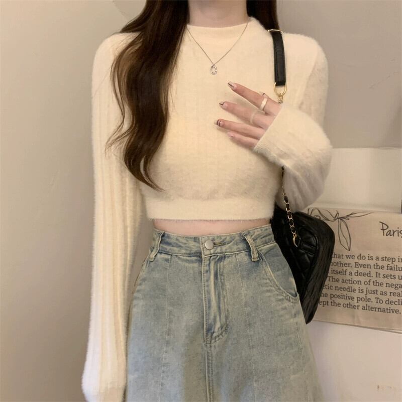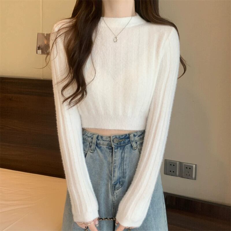 秋冬の白いソフトワックスミンクベルベットショートセーターレディース、ファッショナブルなスリムフィットと暖かいインナーボトム長袖ニットトップ ロング ホワイト ウィンター 冬物 7460058131745748 | framboise21