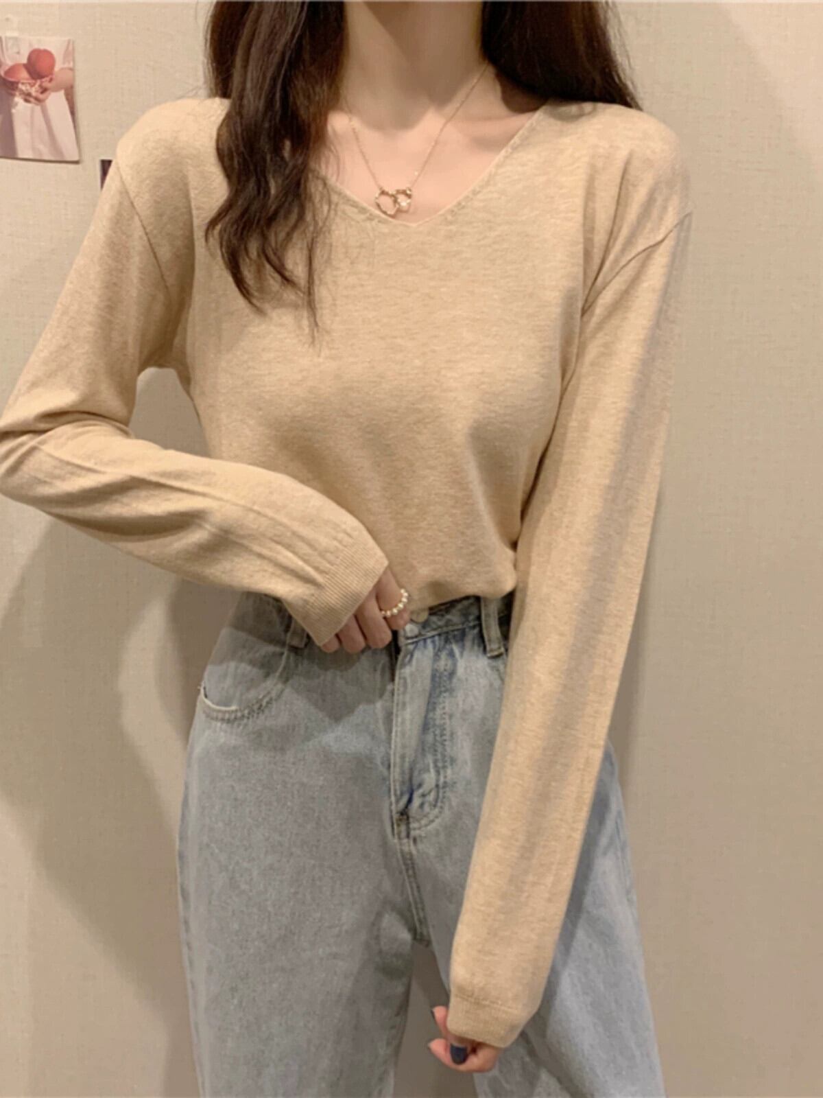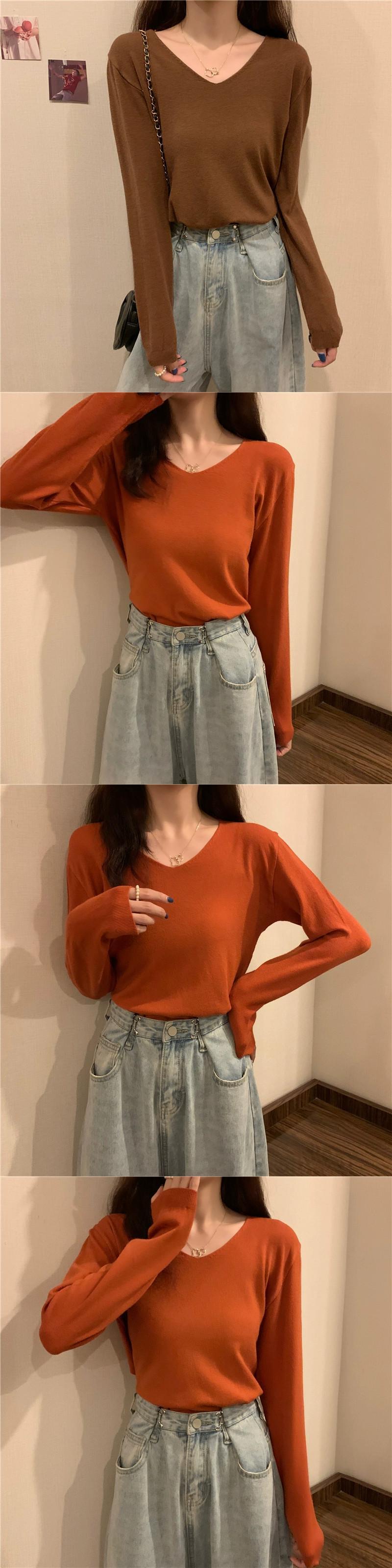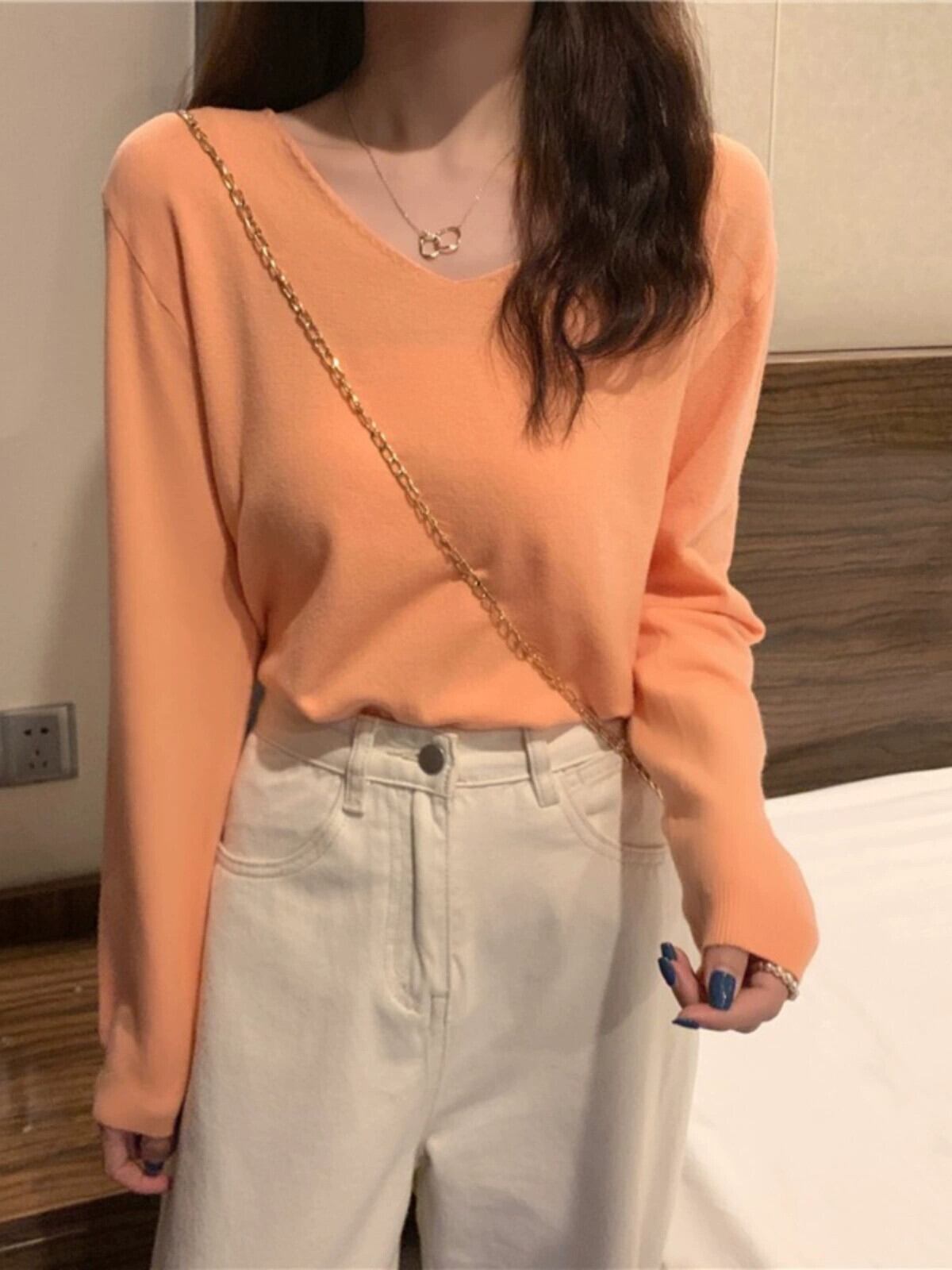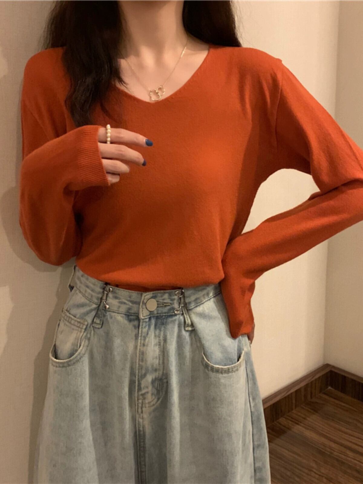 V ネックセーターボトリングシャツ 2023 新しい女性の秋冬ファッショナブルでスリムフィットオレンジ長袖ニットトップ ロング オータム 秋物 ウィンター 冬物 Vネック 7460072467941758 | framboise21